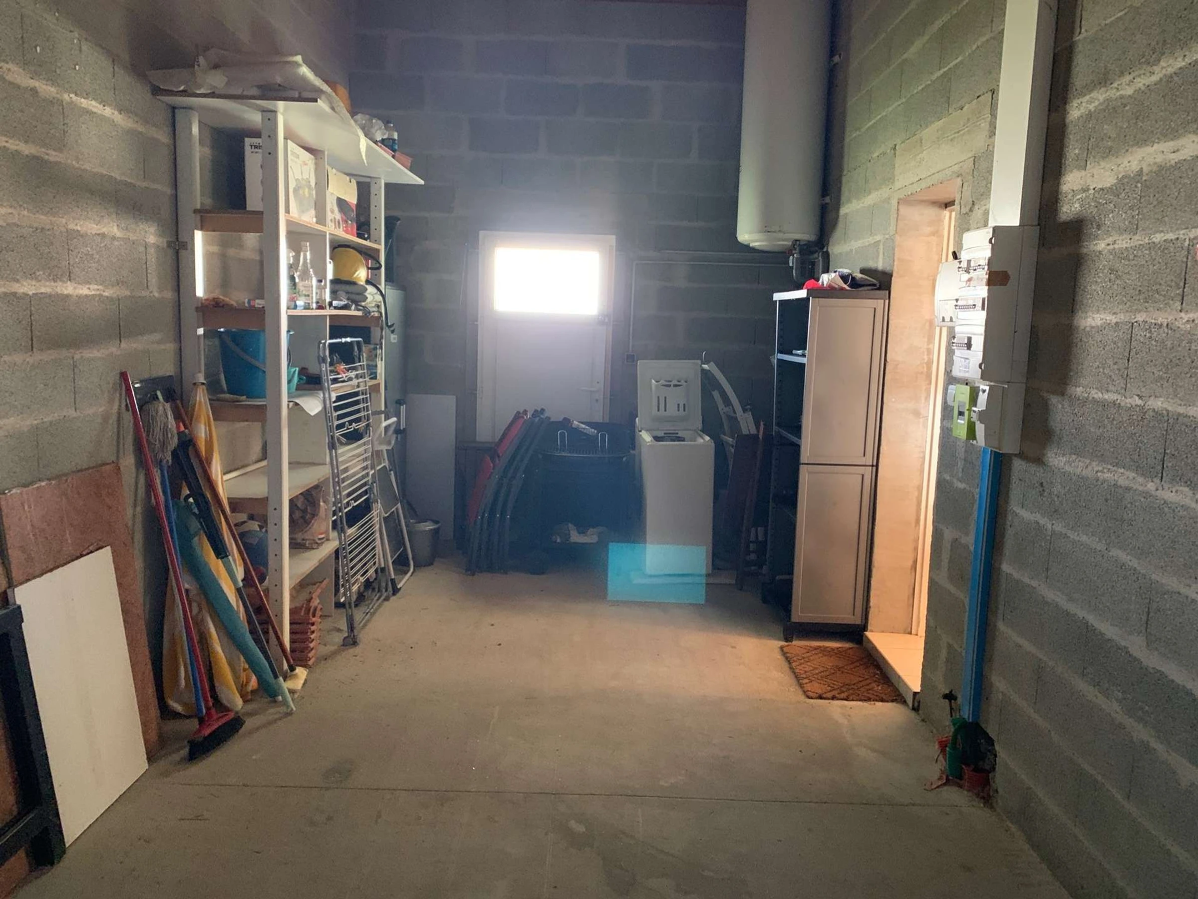 Un garage de stockage avec un espace rangement et un lave linge.
