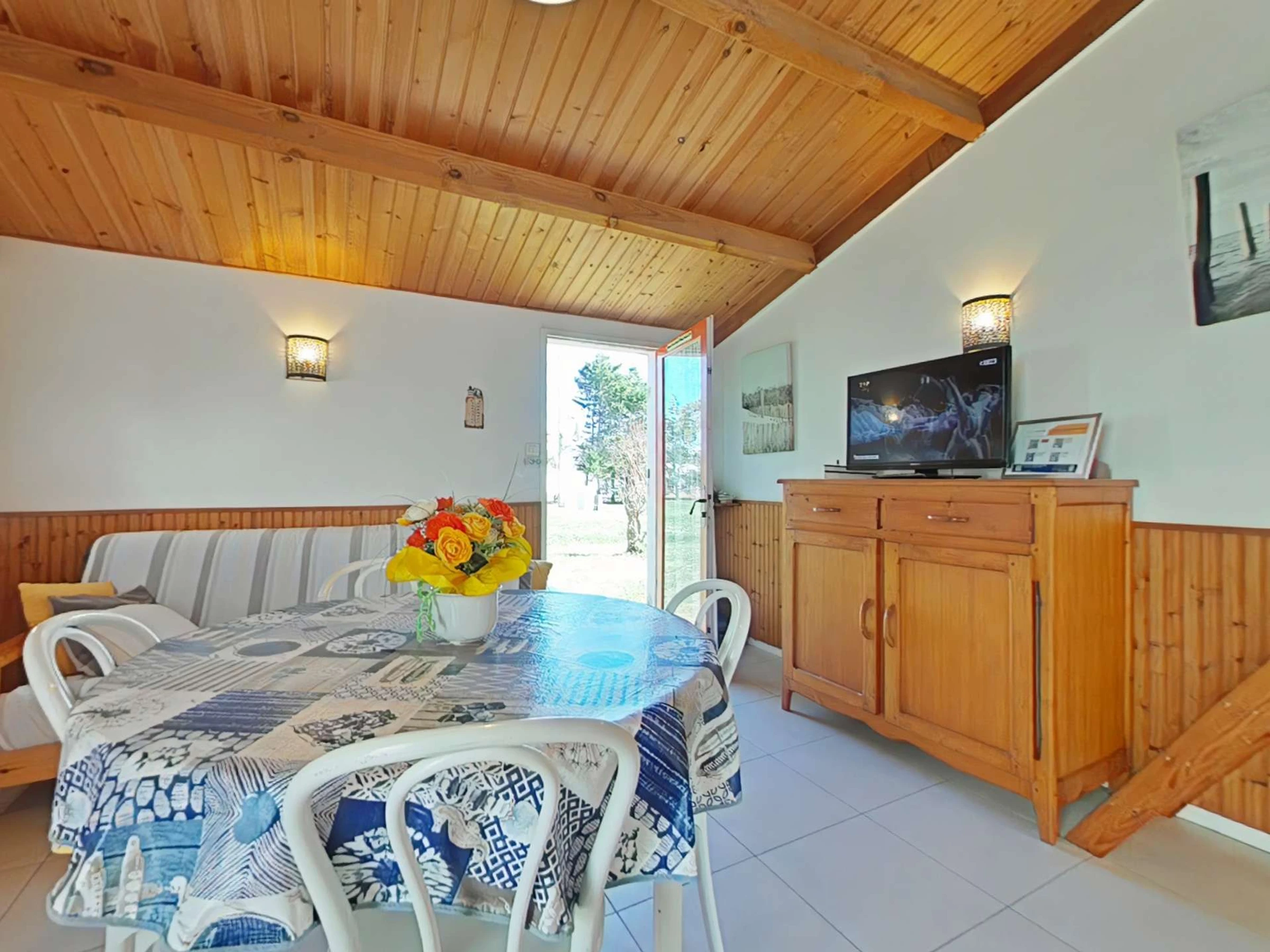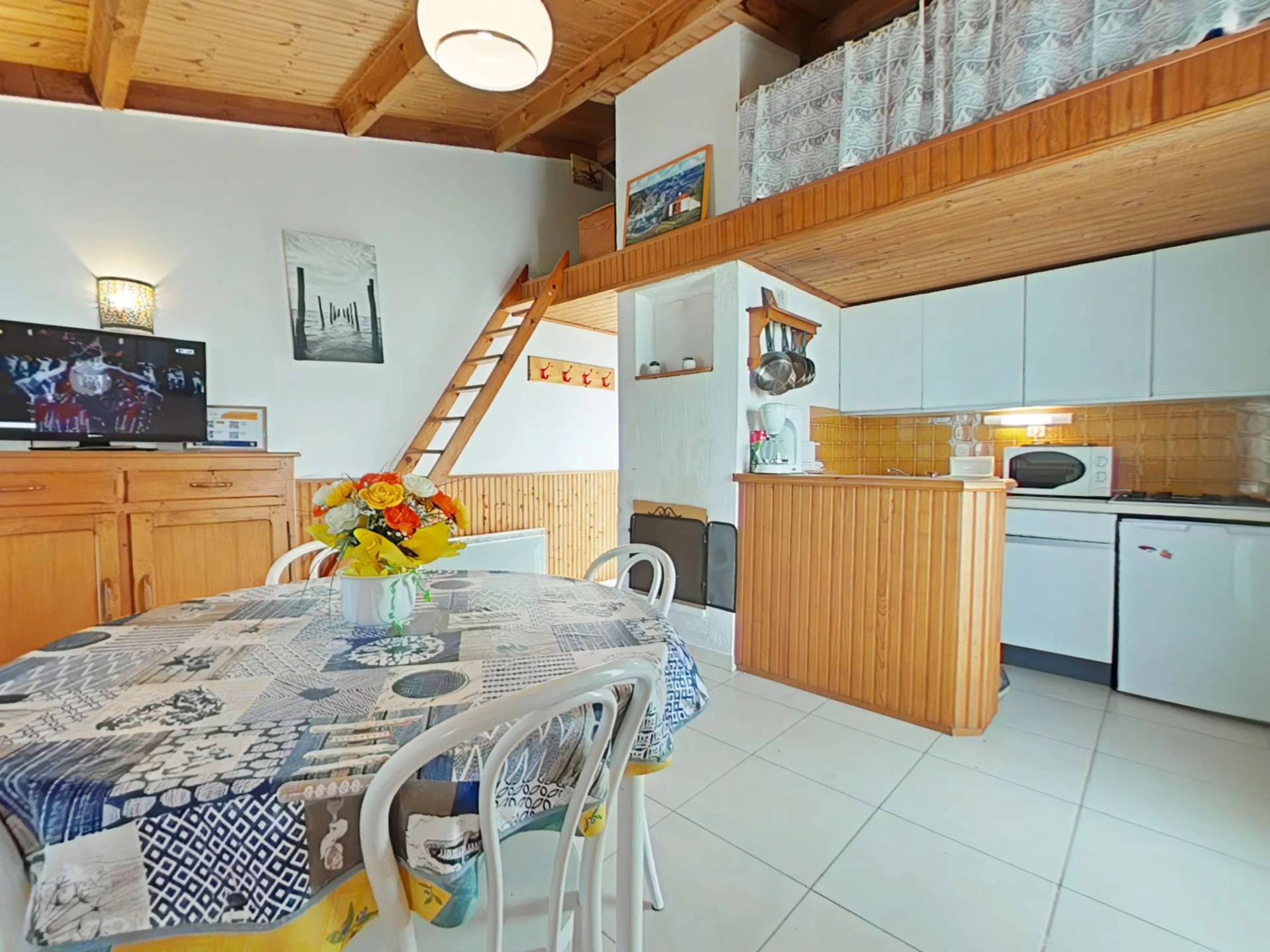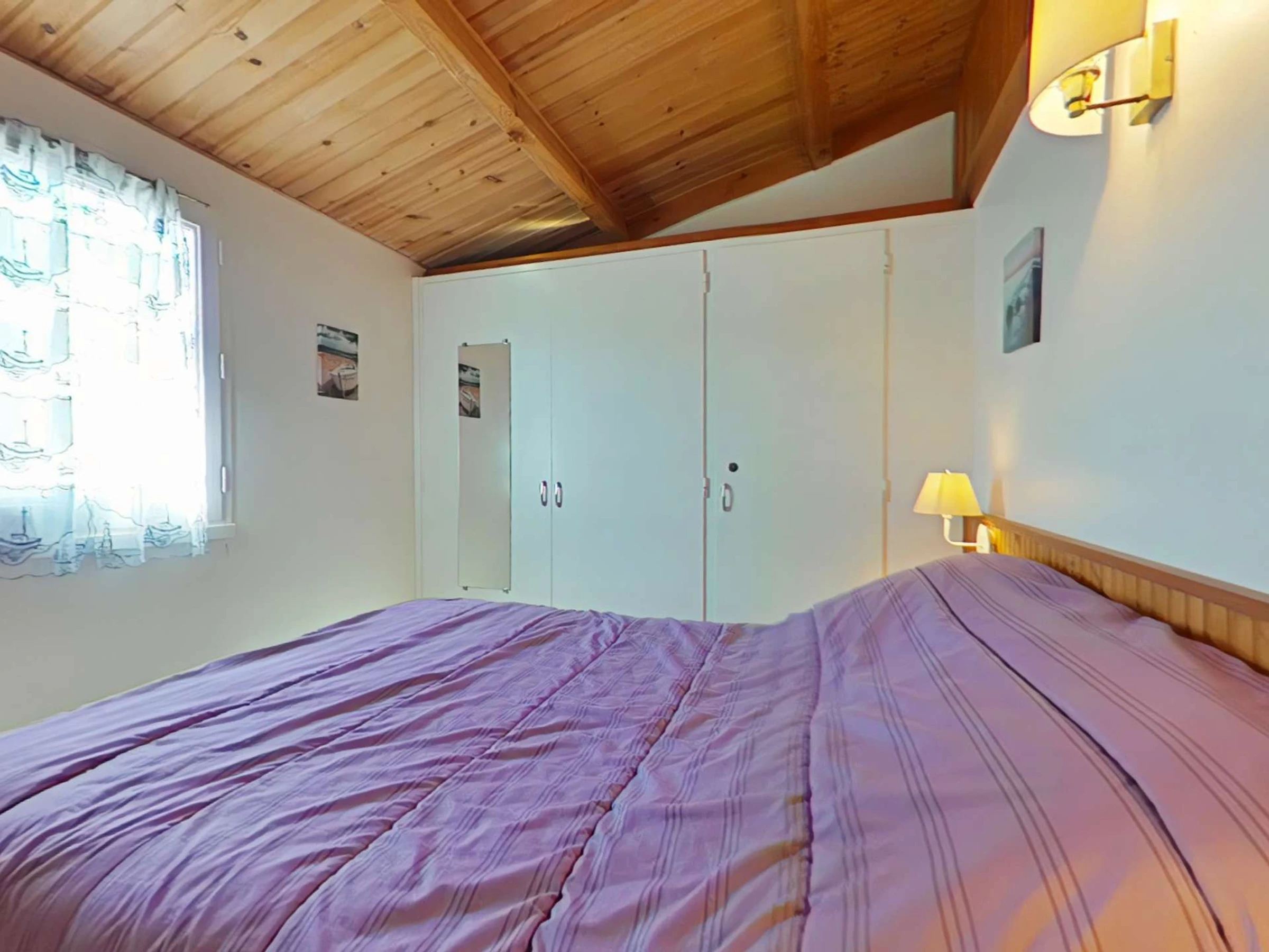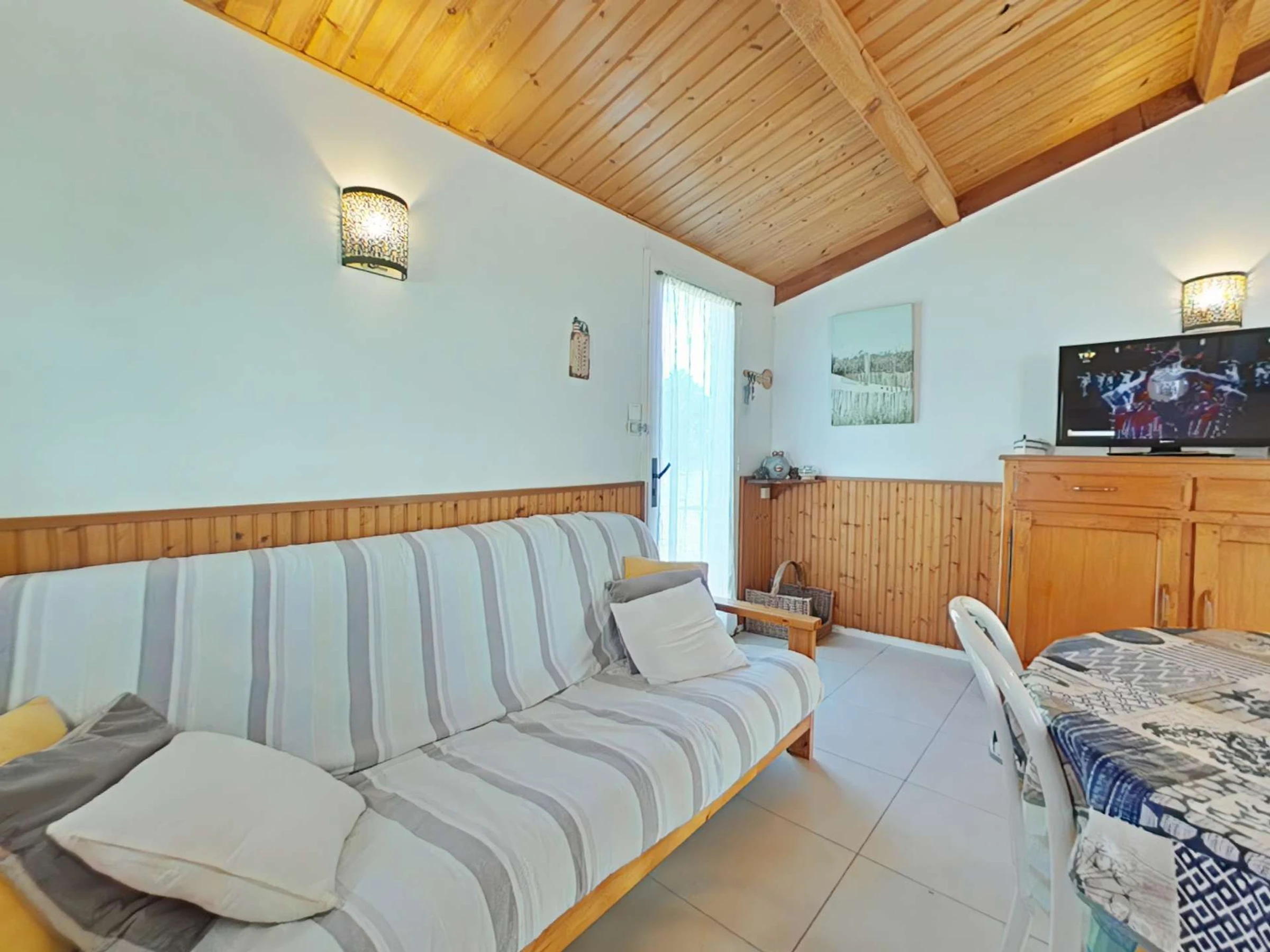 This holiday home features an equipped kitchenette (microwave), a living room with a television and a sofa bed for two people, a bedroom with a double bed, and a sloped mezzanine (maximum height 1.40m) with two single beds. It also includes a bathroom with a washing machine and a separate toilet.