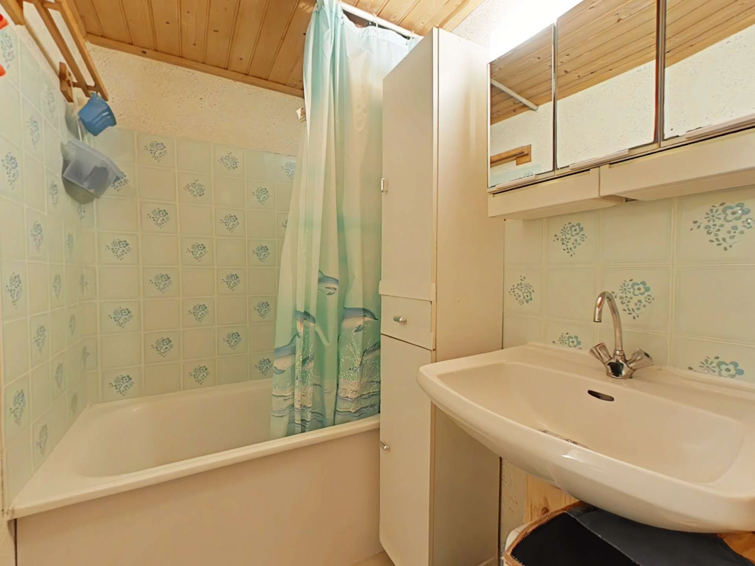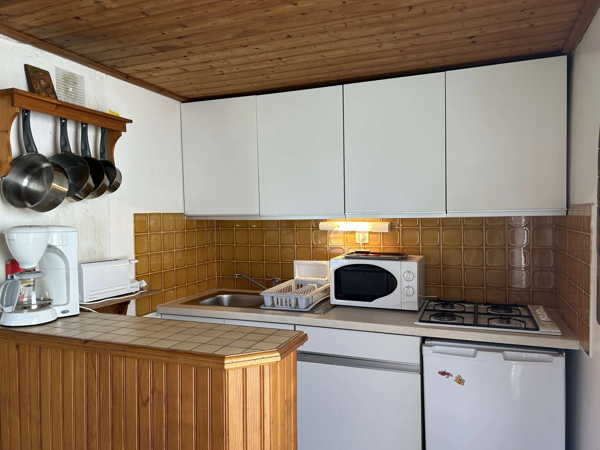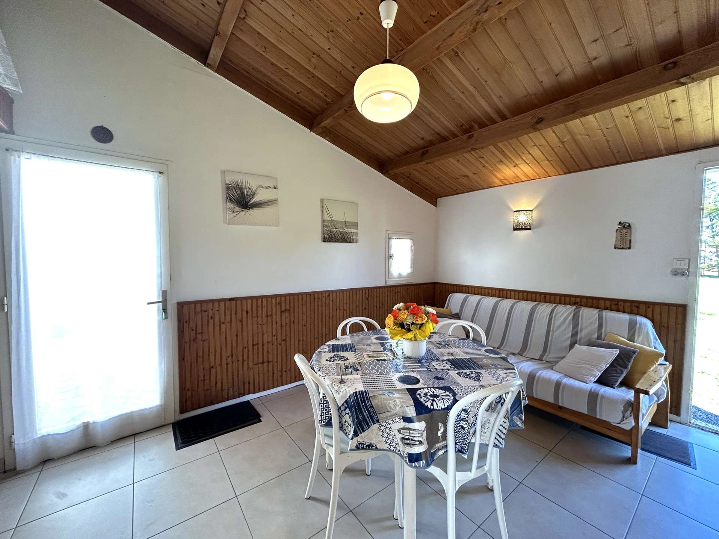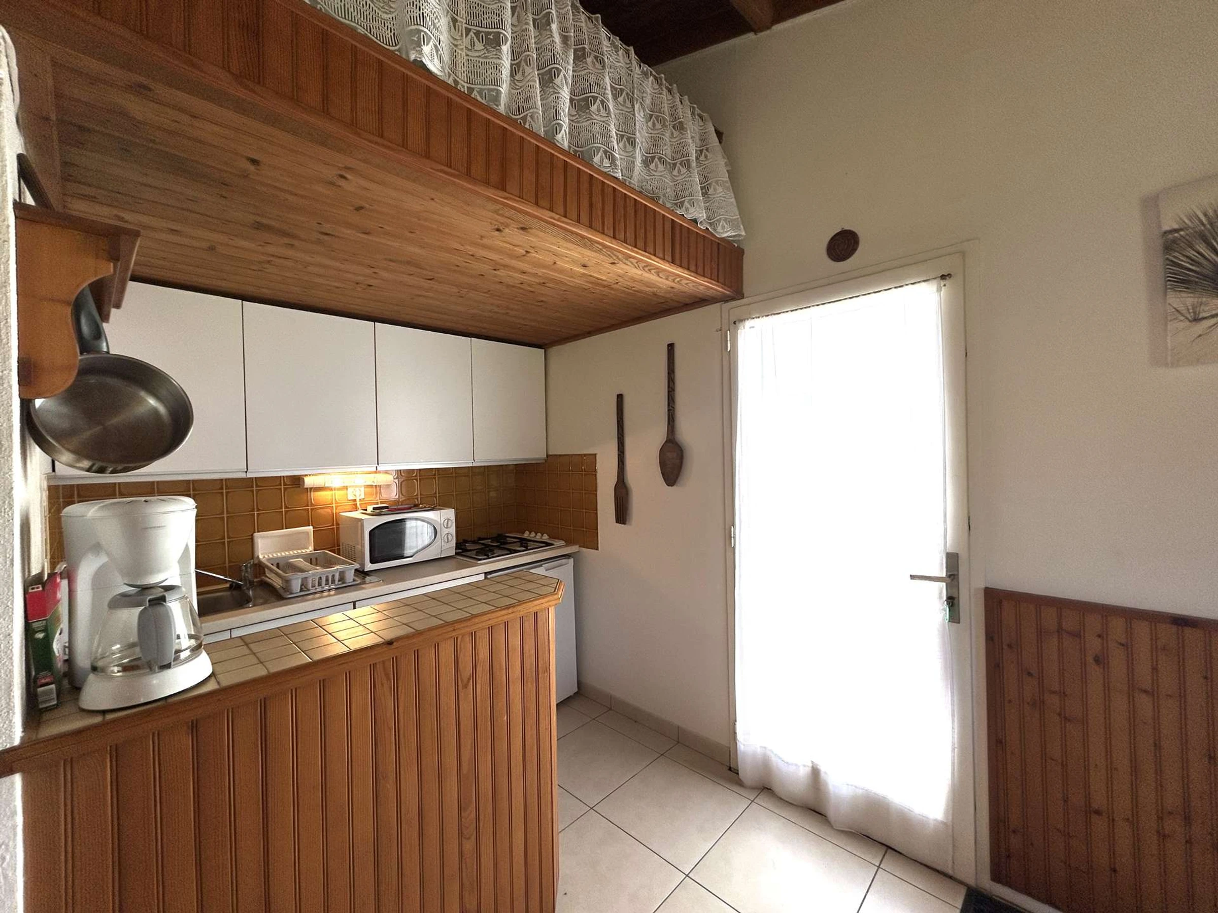 This holiday home features an equipped kitchenette (microwave), a living room with a television and a sofa bed for two people, a bedroom with a double bed, and a sloped mezzanine (maximum height 1.40m) with two single beds. It also includes a bathroom with a washing machine and a separate toilet.