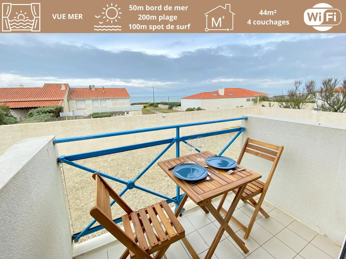 Idéalement situé face au spot de surf de La Sauzaie, appartement rénové VUE MER (2ème ligne) au rez-de-chaussée (accès par quelques marches) d'une petite résidence comprenant: une entrée dans pièce de vie avec coin repas (table, bancs) et coin salon (canapé lit type clic-clac + TV).