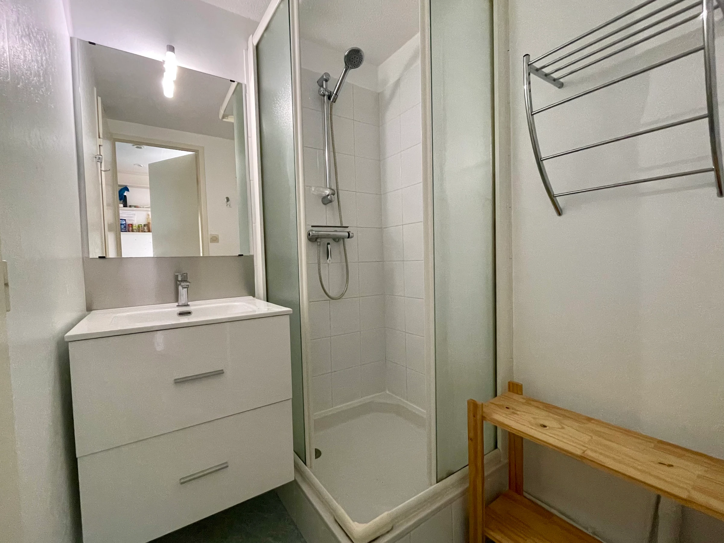 A bathroom (shower, vanity unit) with WC inside (but separated by a door).