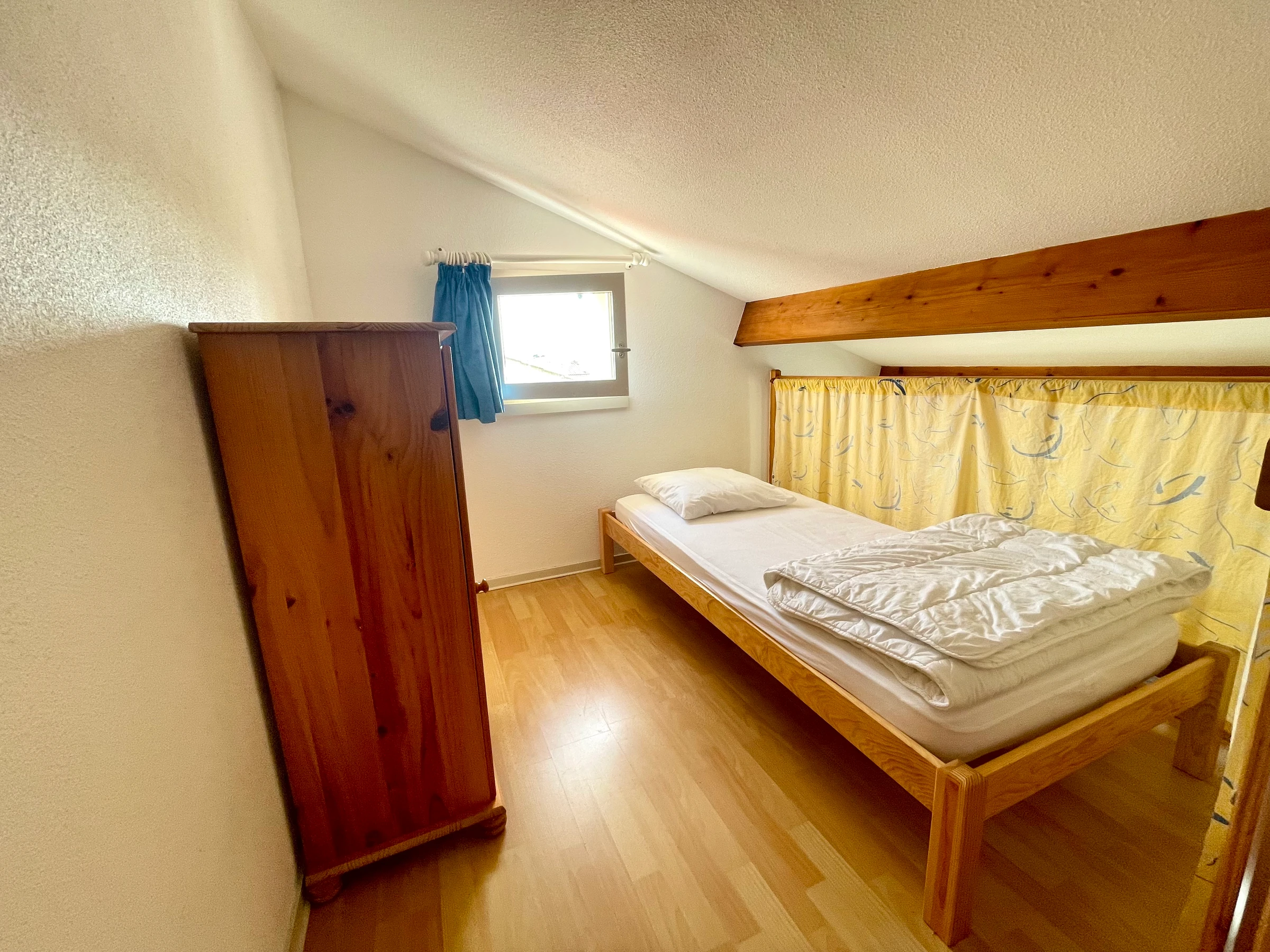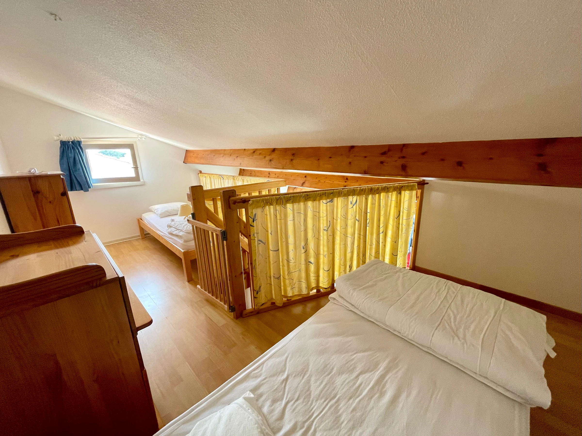 Upstairs, a mezzanine open to the living room with 2 single beds (90) under eaves + storage.