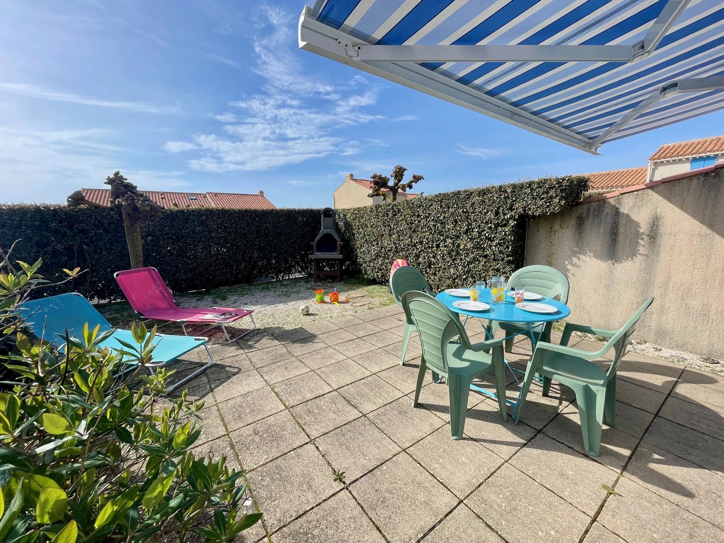 A pleasant terrace with garden furniture, sun loungers, awning and barbecue.