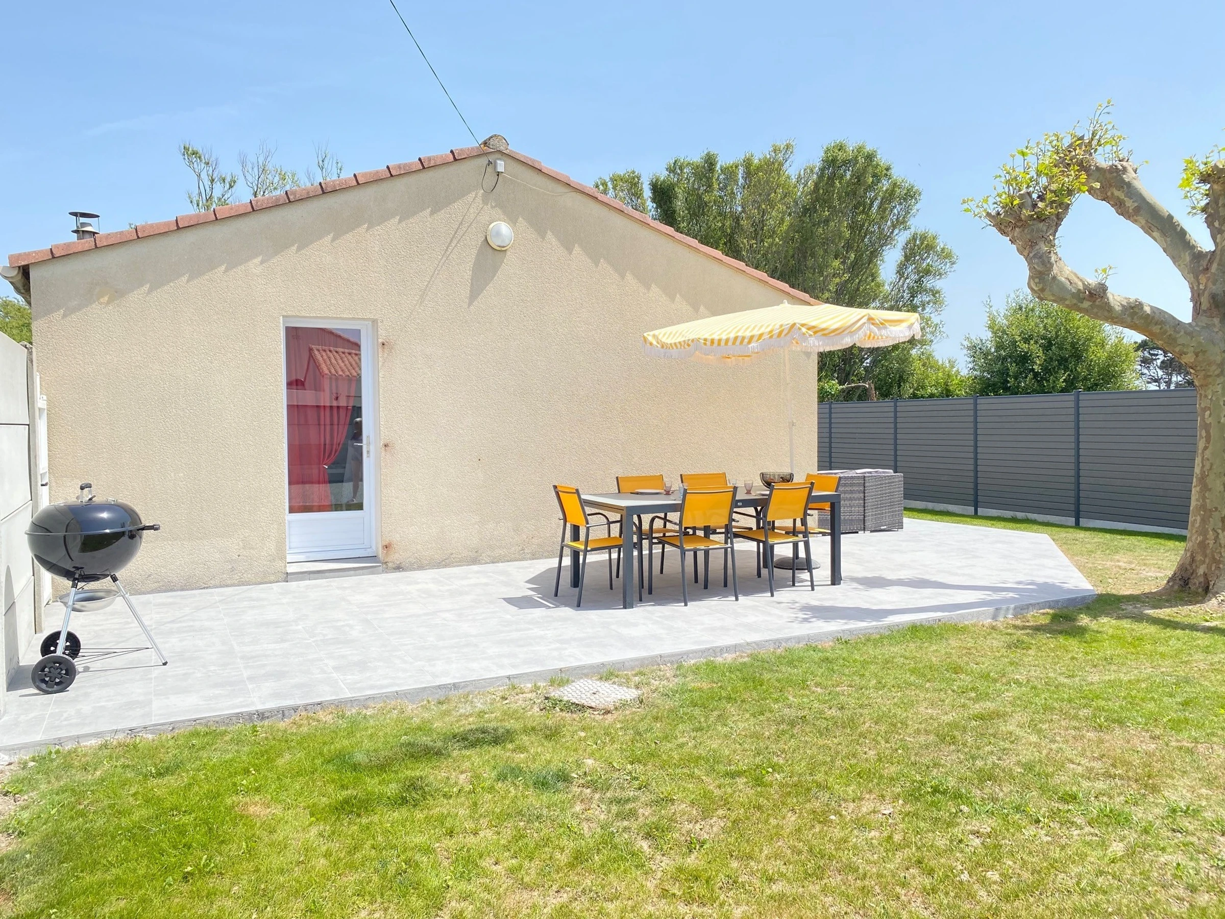 Approximately 600m from the Marais-Girard beach and approximately 1,200m from the town center, in a quiet cul-de-sac, this small, single-story country house with an enclosed garden features a direct entrance into the living room (corner sofa, coffee table, living room unit, TV, table, and chairs), and a fully fitted and equipped kitchen opening onto the living room (exhaust hood, induction hob, oven, microwave, dishwasher, refrigerator with freezer compartment, and storage).