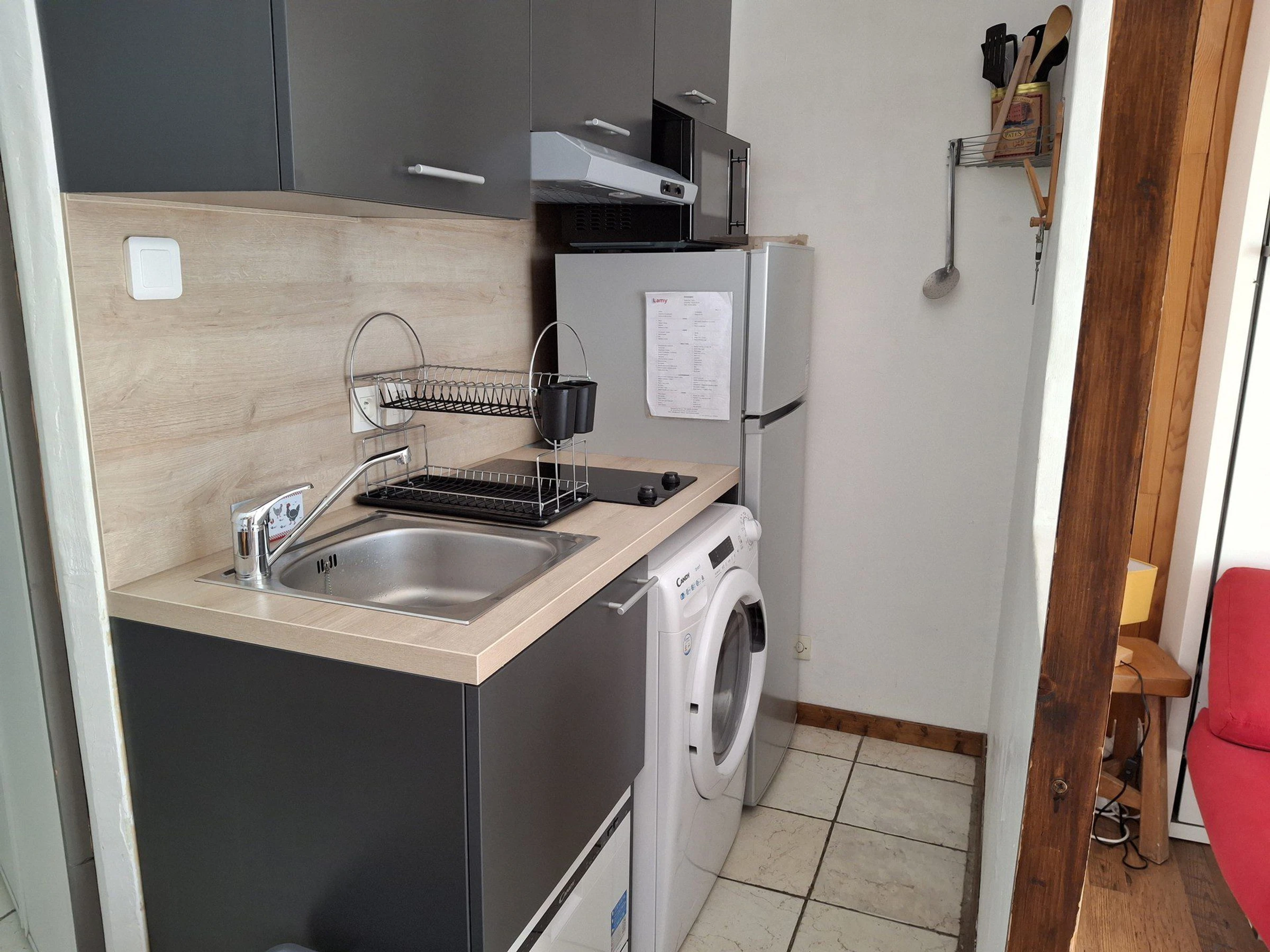 Fully equipped renovated kitchen area with 2-burner electric hob, combined microwave, dishwasher, fridge with freezer, electric coffee maker, washing machine and dryer.