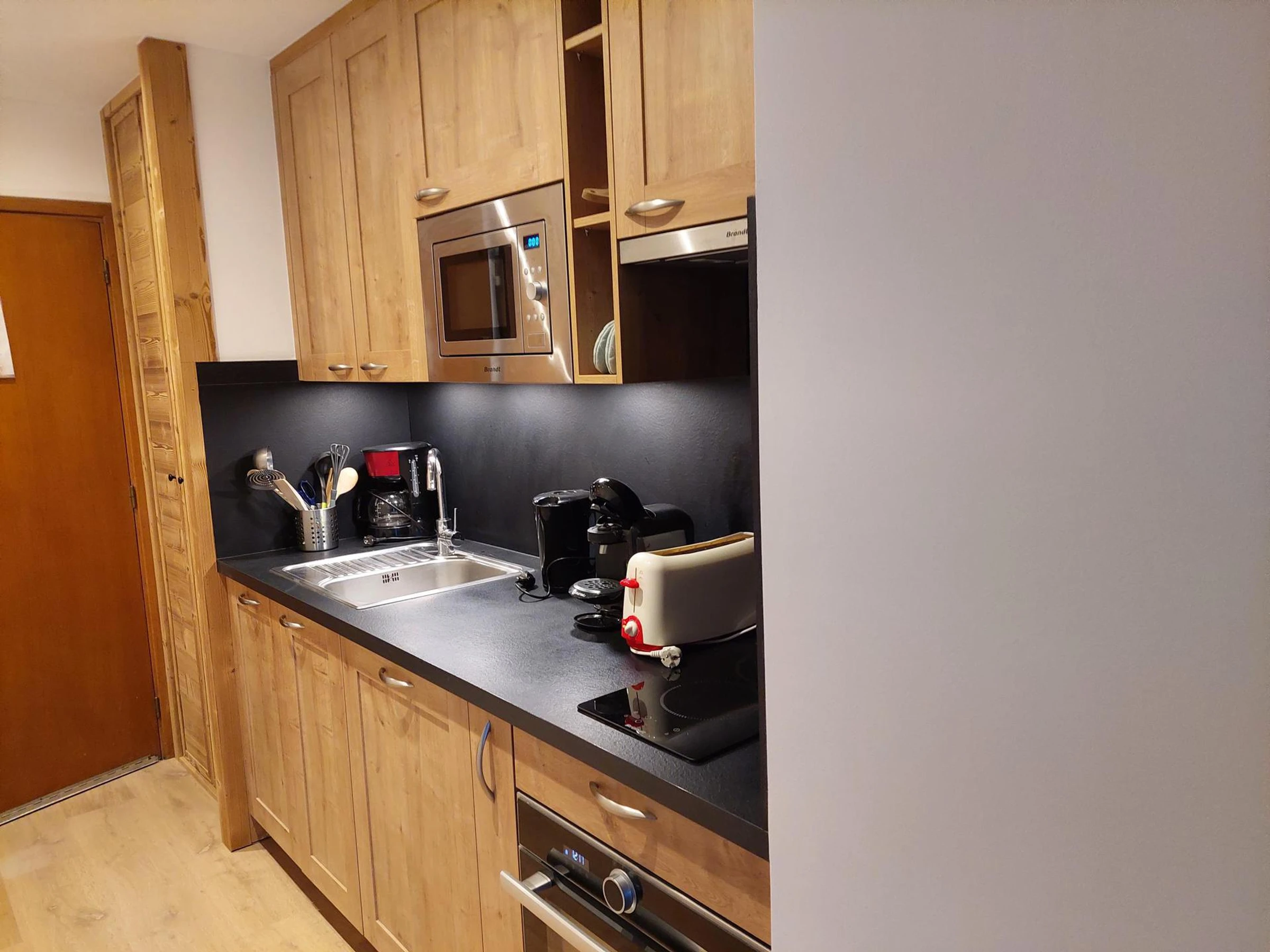 Kitchen area with 2-burner ceramic hob, oven, microwave, dishwasher and fridge.