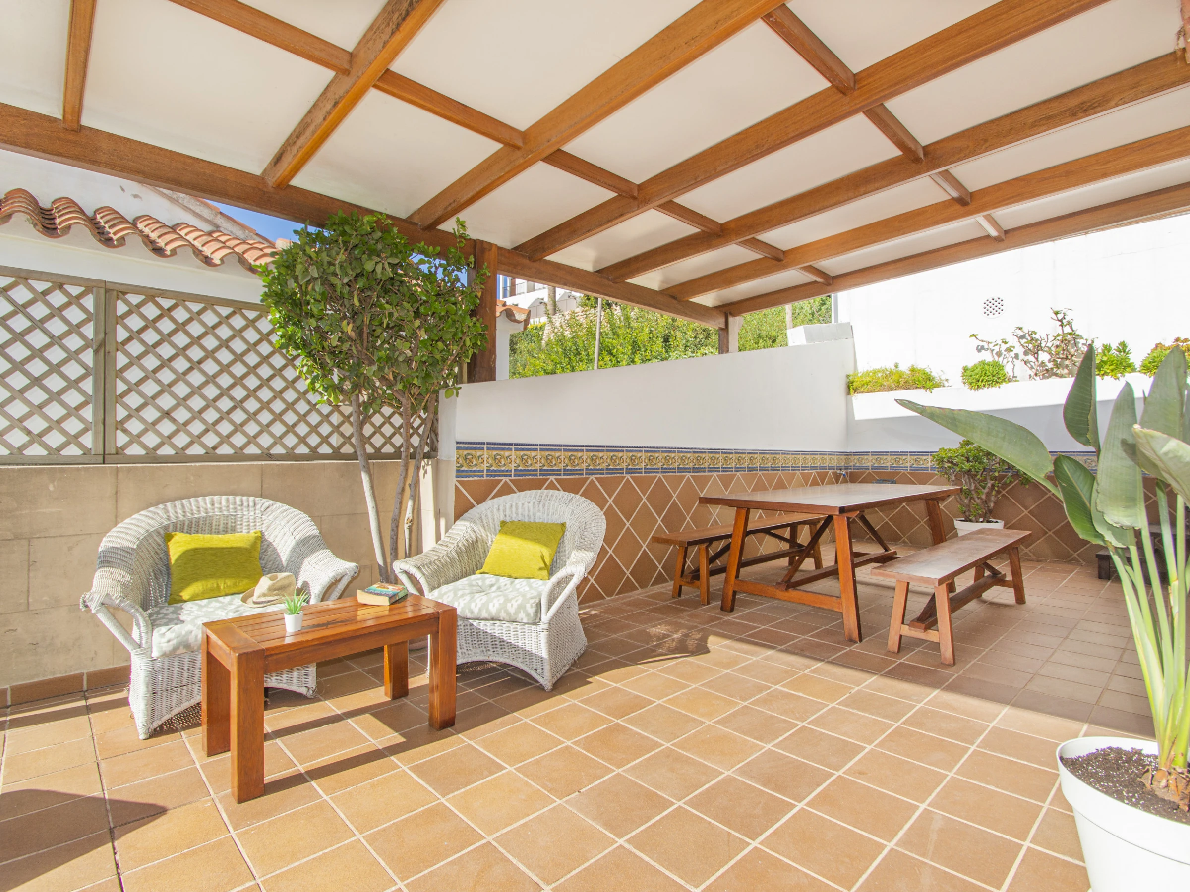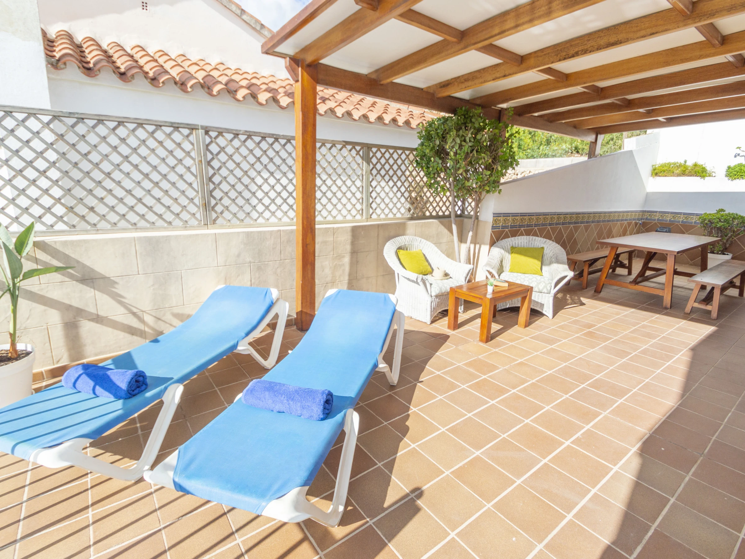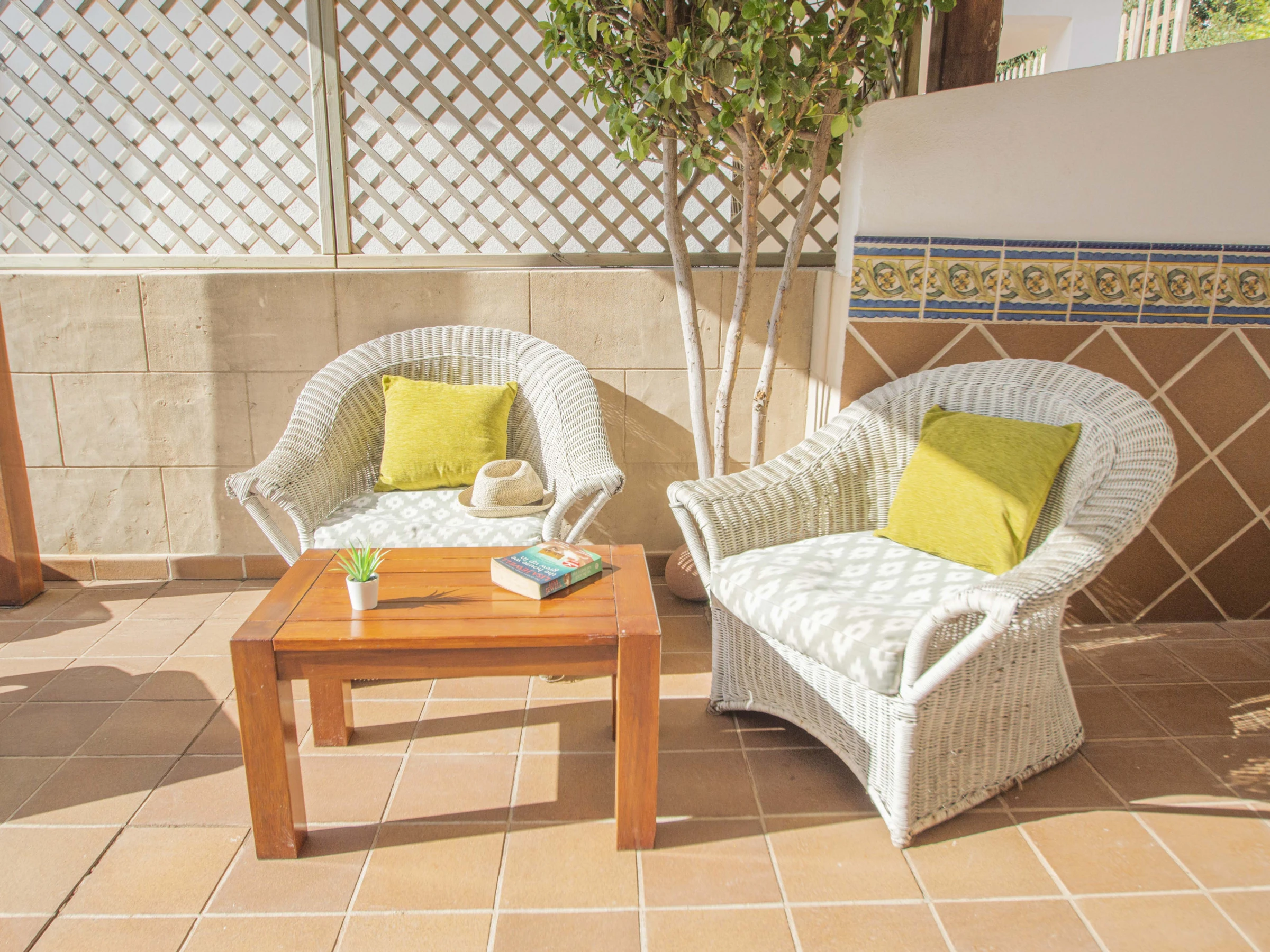 The outside area of this apartment for rent in Menorca is composed of a salt water pool overlooking the beach, an area with hammocks and an area covered by a pergola to enjoy outdoor meals with an outdoor table and chairs. The apartment also has a rear terrace with a barbecue.