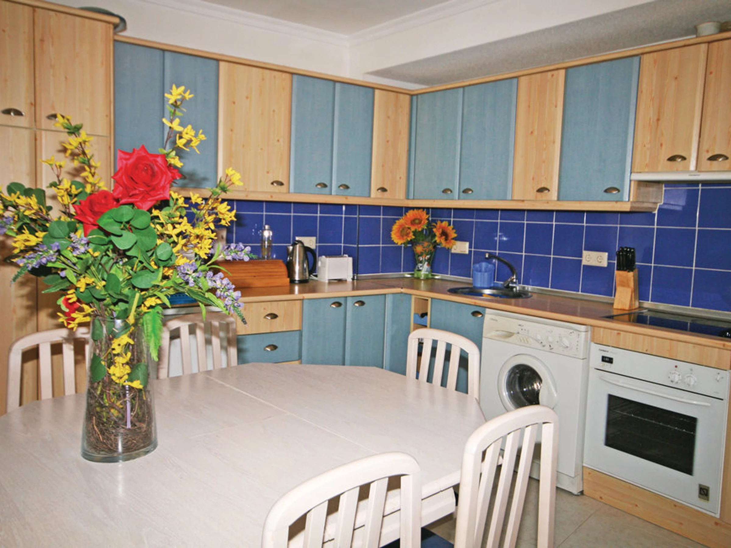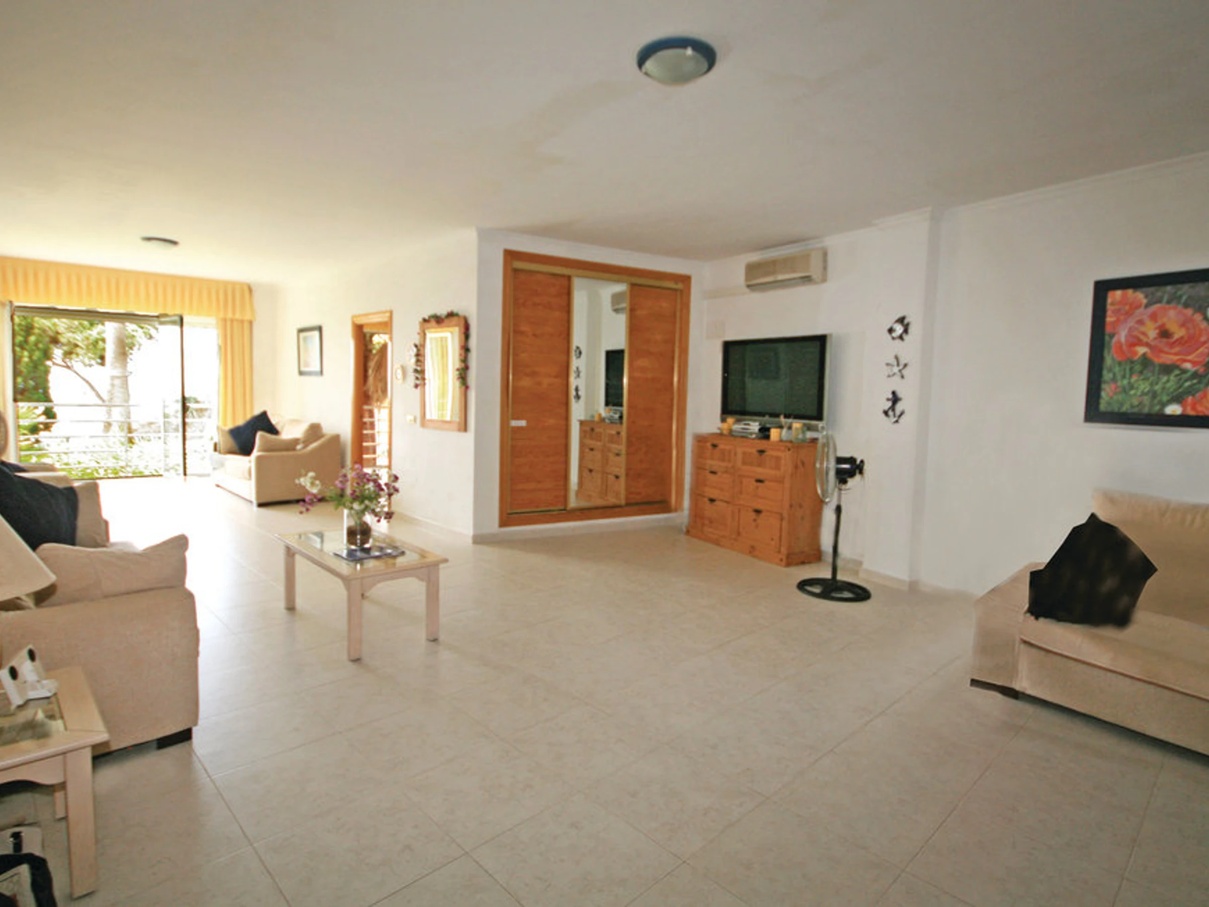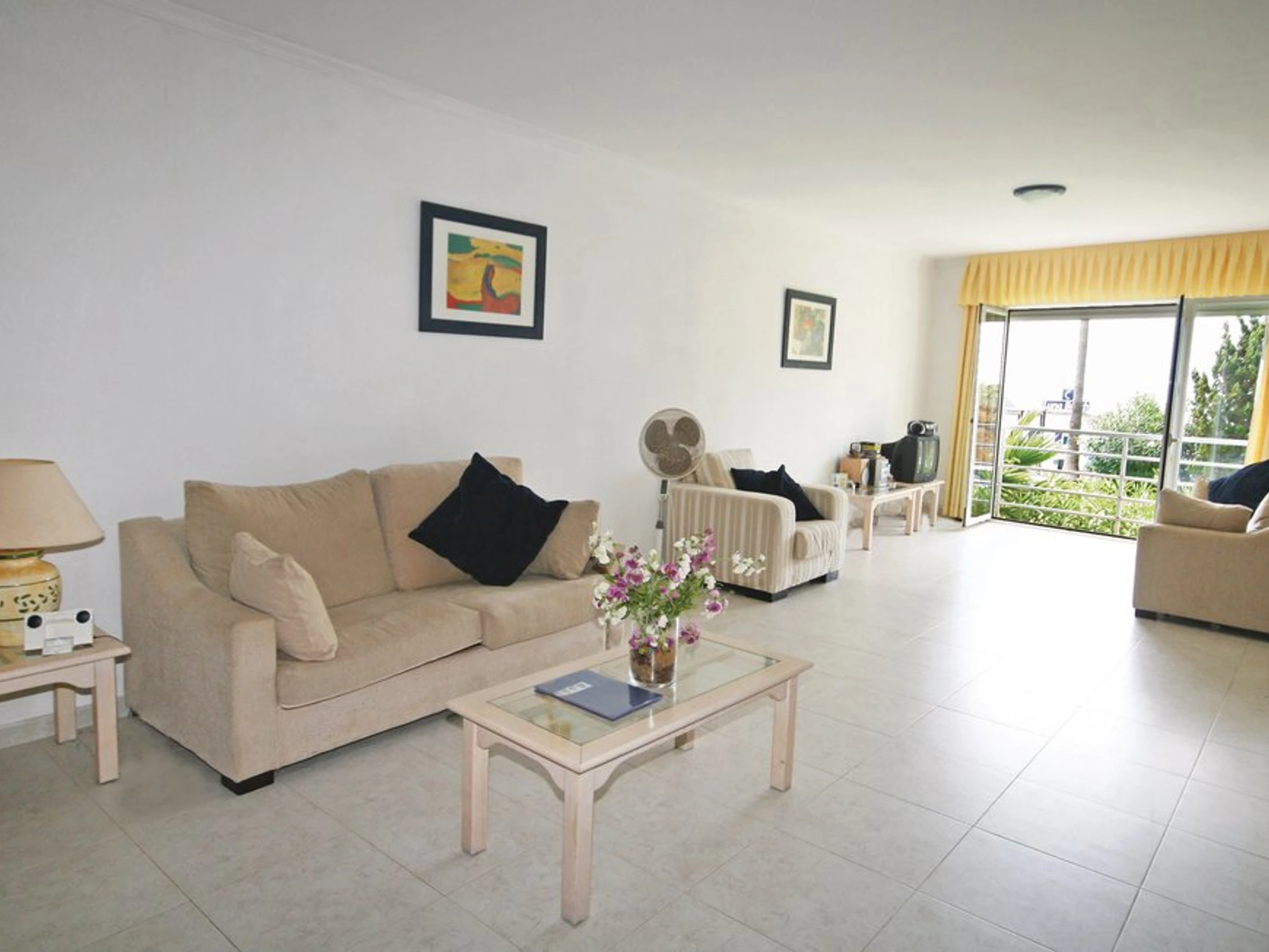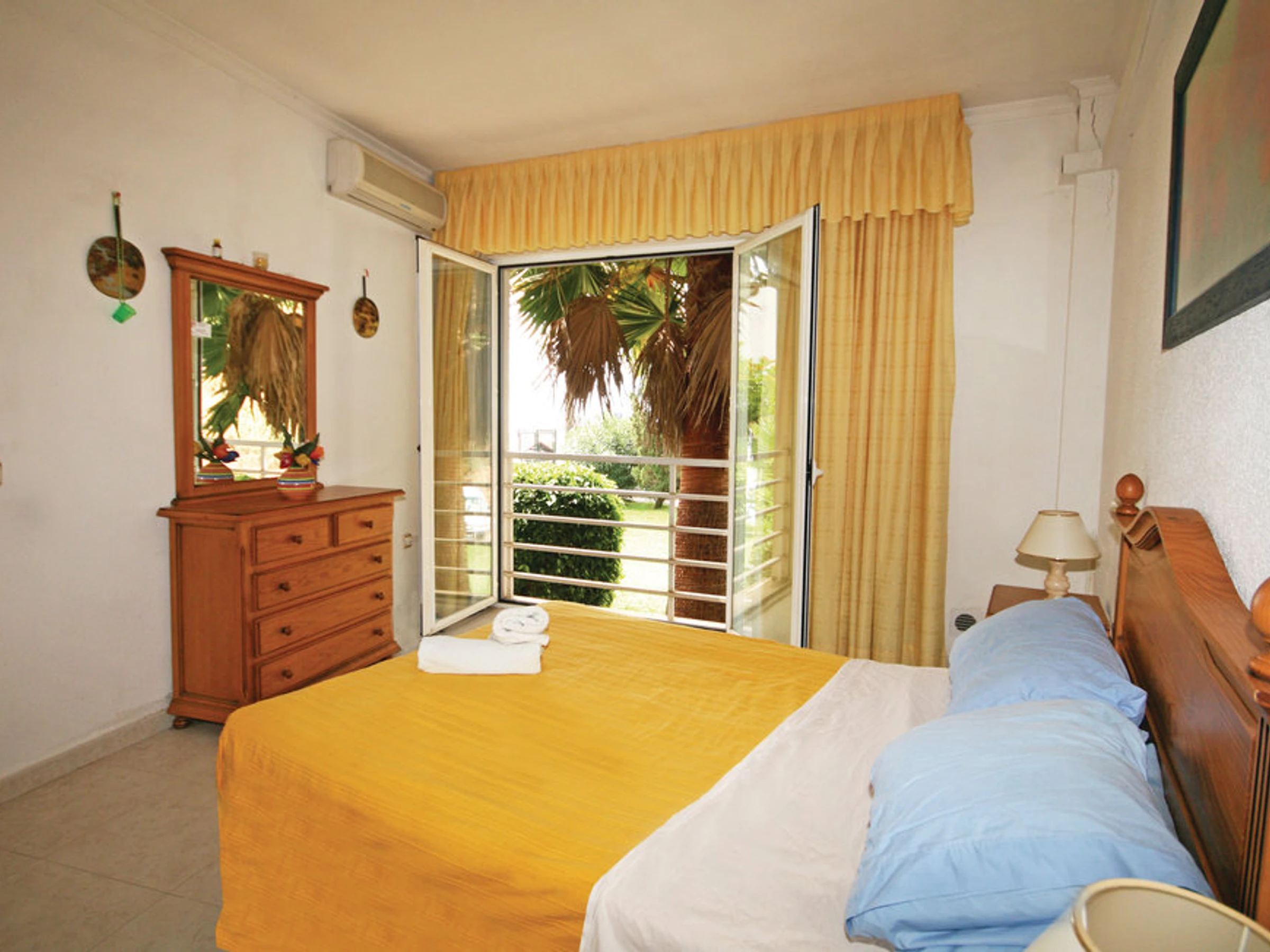 Although only 1 bedroom, this practical apartment can sleep up to 8, due to the expansive area of the lounge which is furnished with 3 sofa beds. The lounge is also furnished with a TV and DVD player. The open plan kitchen located at the entrance to the apartment is fully-equipped and is furnished with a table and chairs. Continue down a couple of steps and you enter the lounge area and the large windows which open up offering wonderful views and lets the sun and light streams in. The bedroom is also spacious and is fitted with a double bed, fitted wardrobes, an A/C unit and offers wonderful sea views. The fully tiled bathroom is fitted with a double sink unit and it has a bath with shower attachment.
