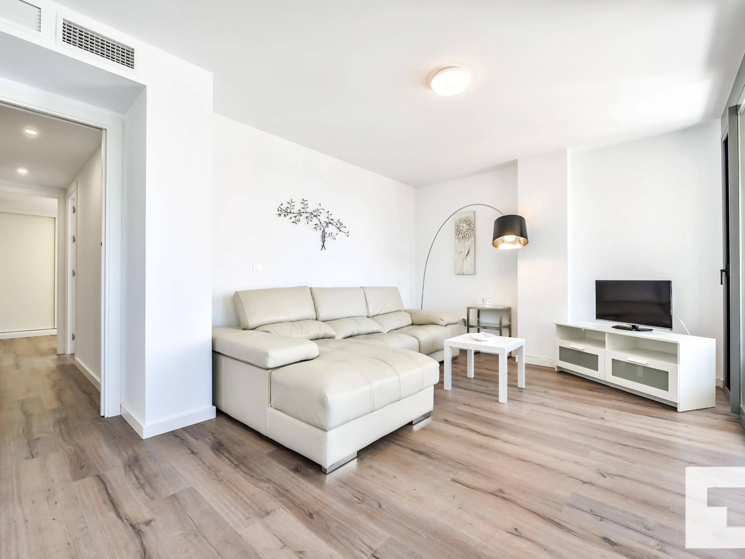 📺 Living/dining room with TV and access to the furnished terrace.