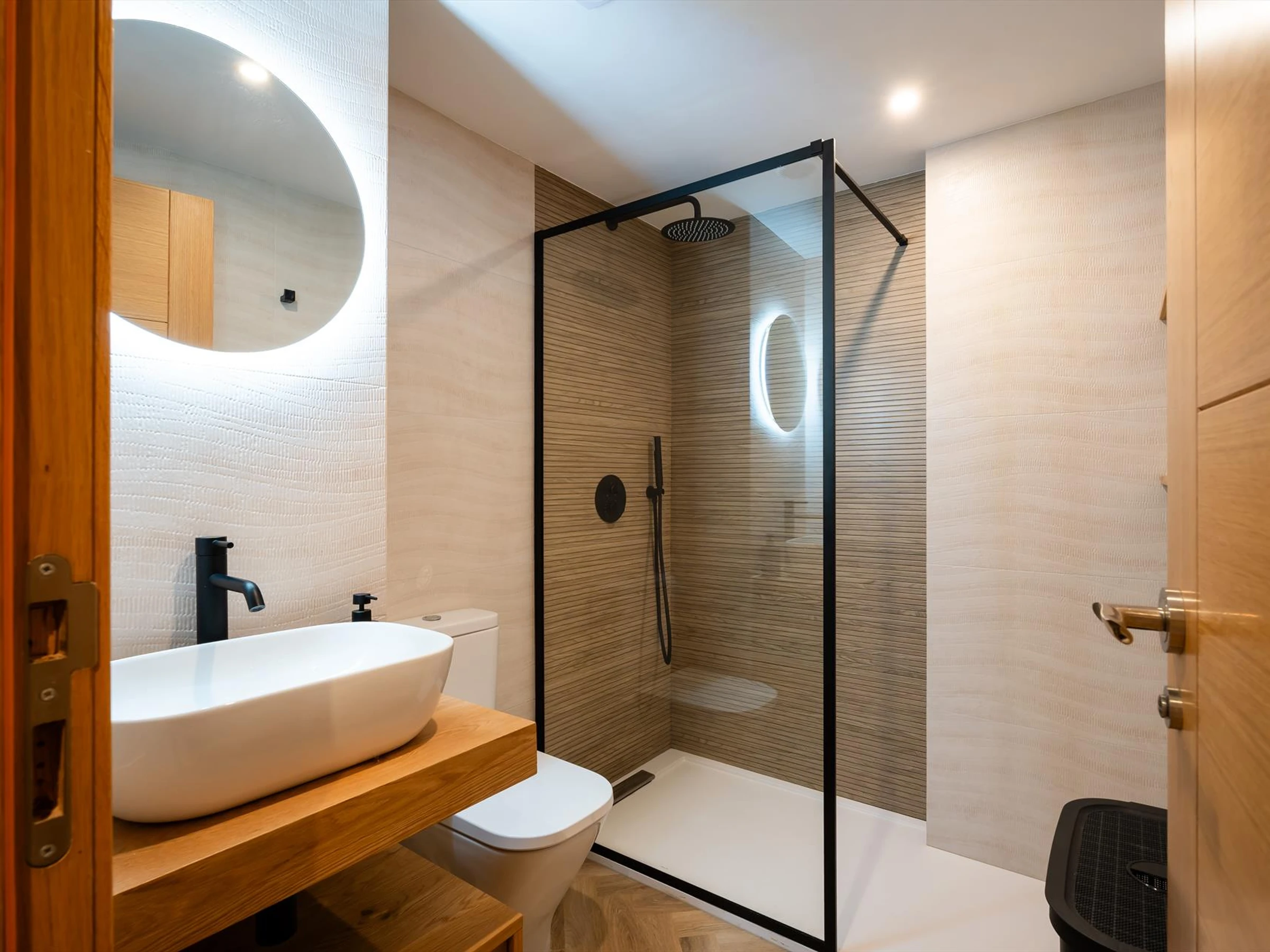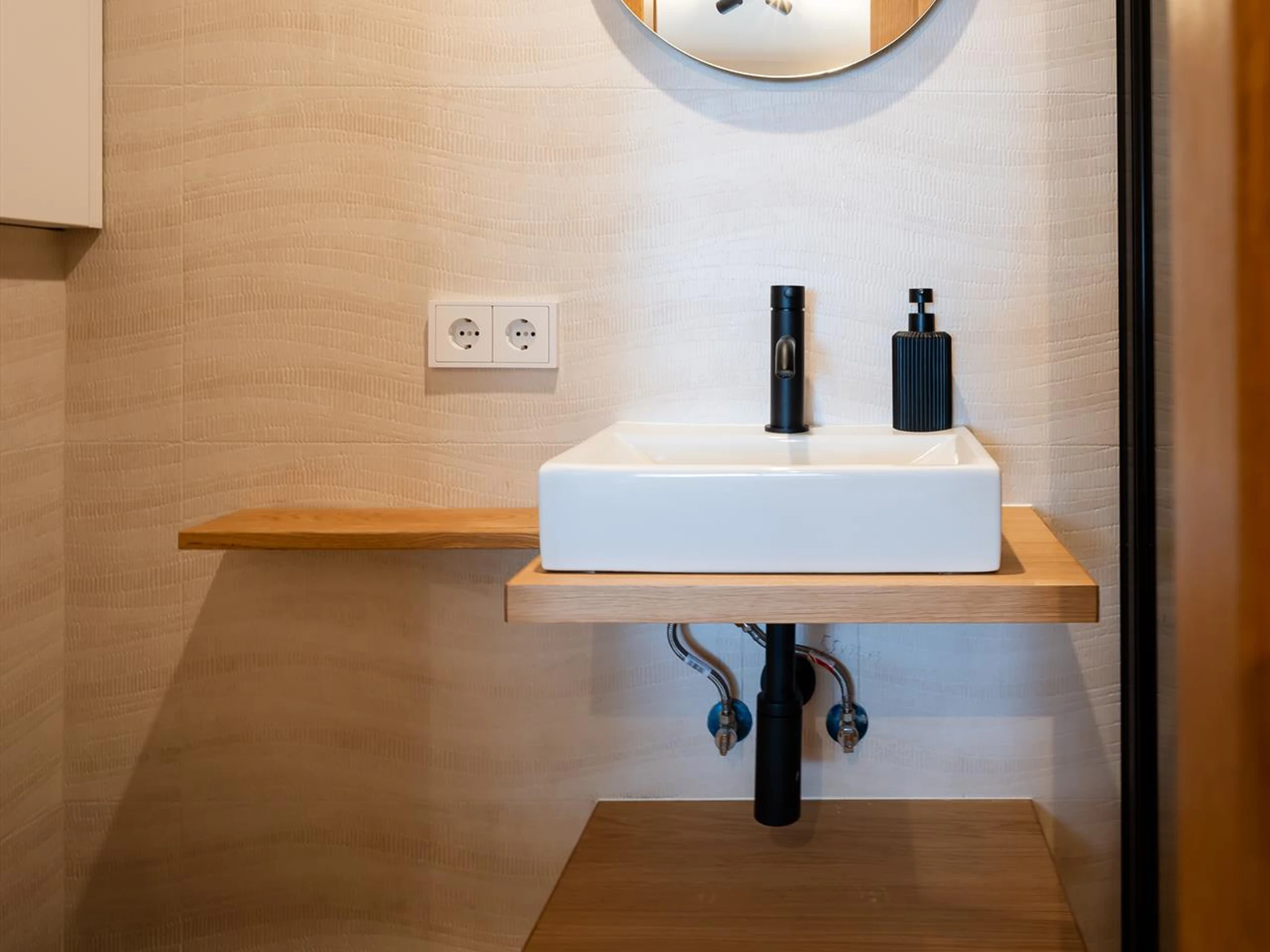 * bathroom with single washbasin, shower, bidet, toilet and hairdryerExterior