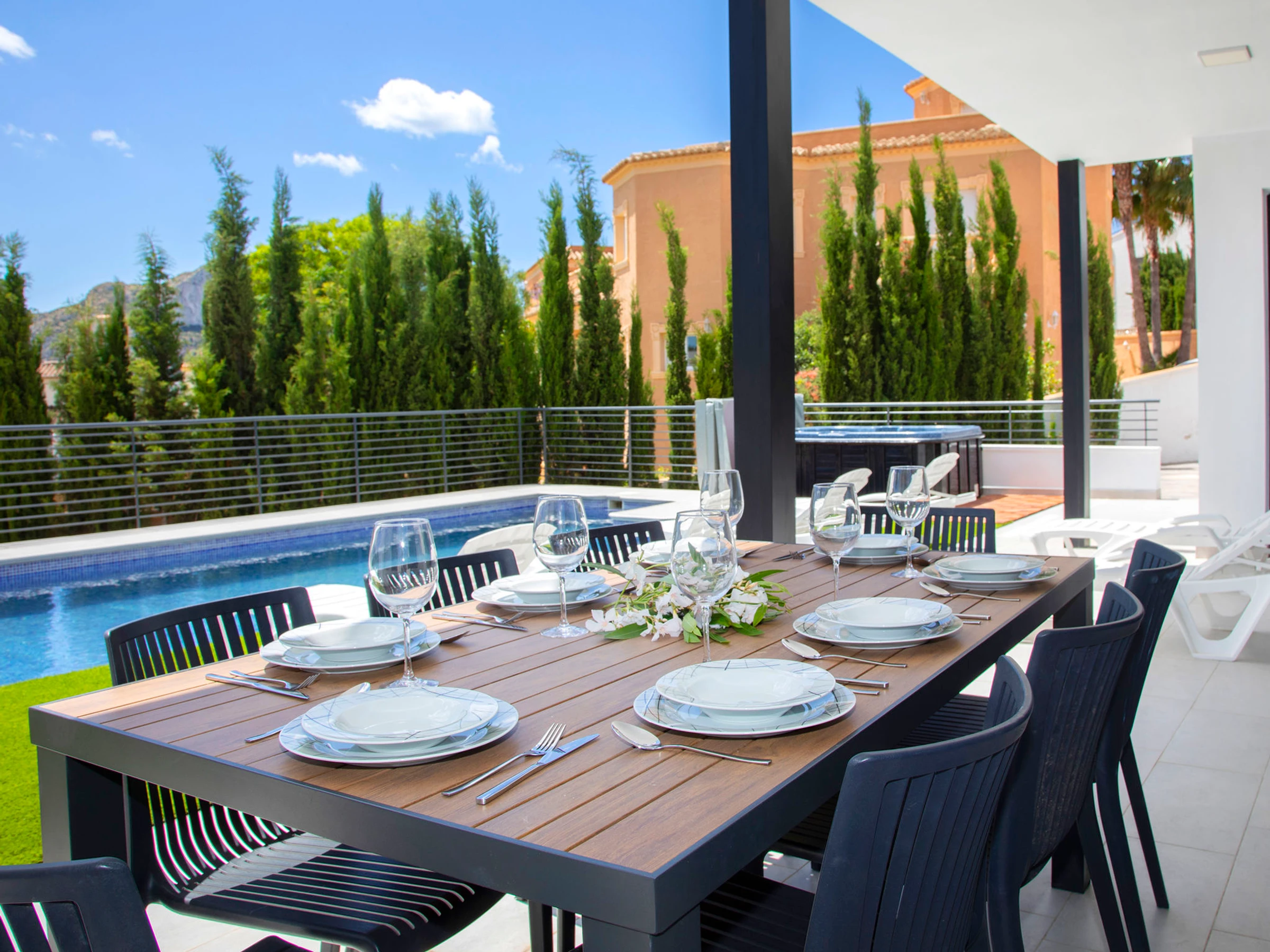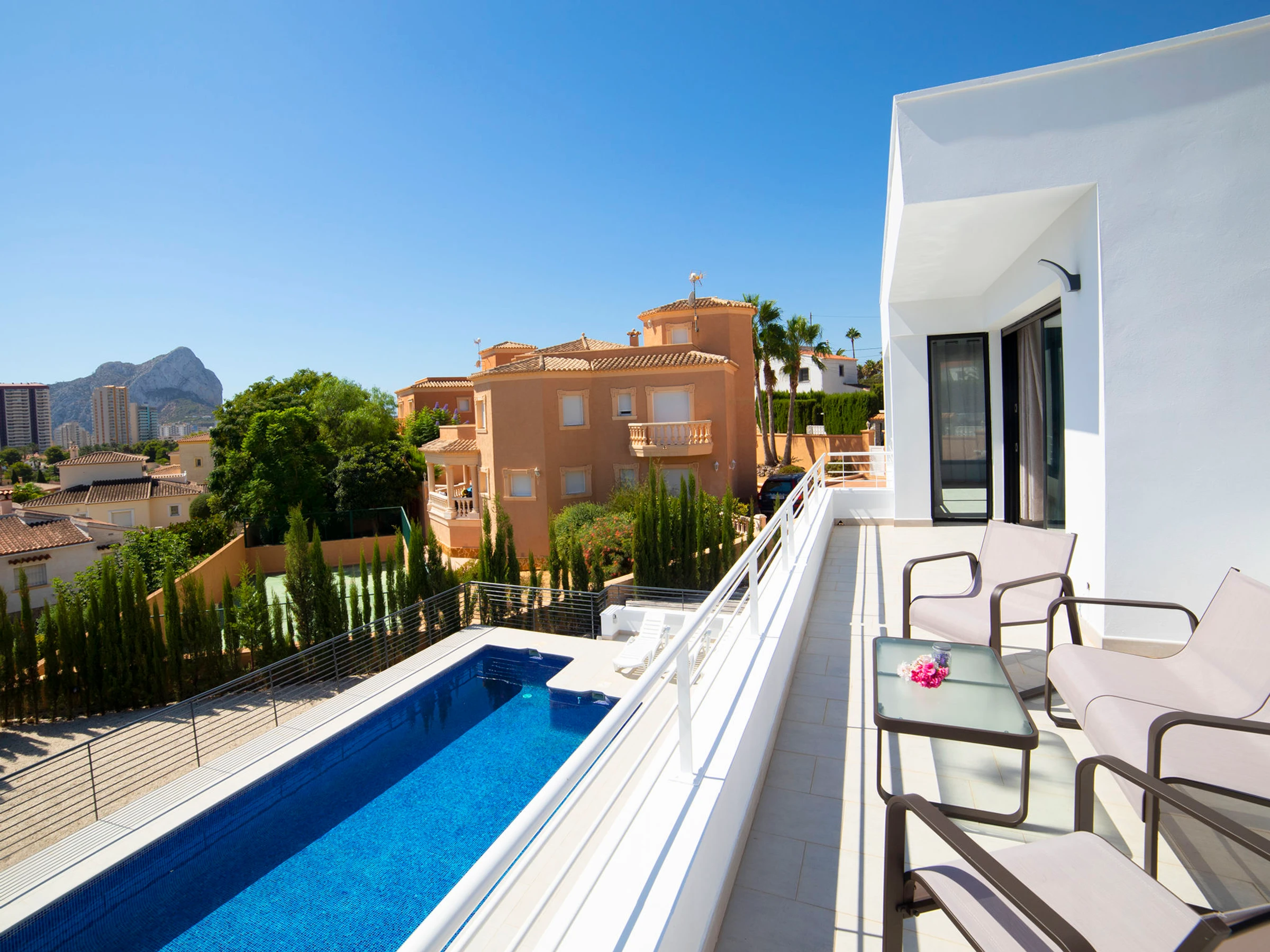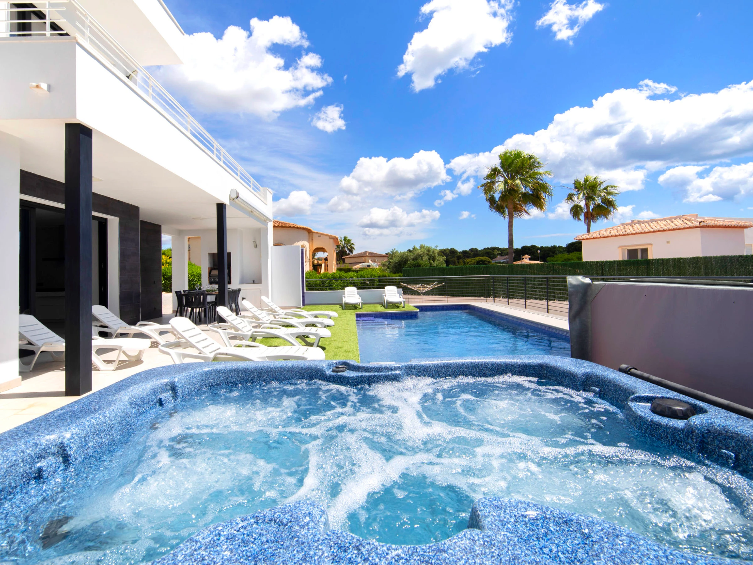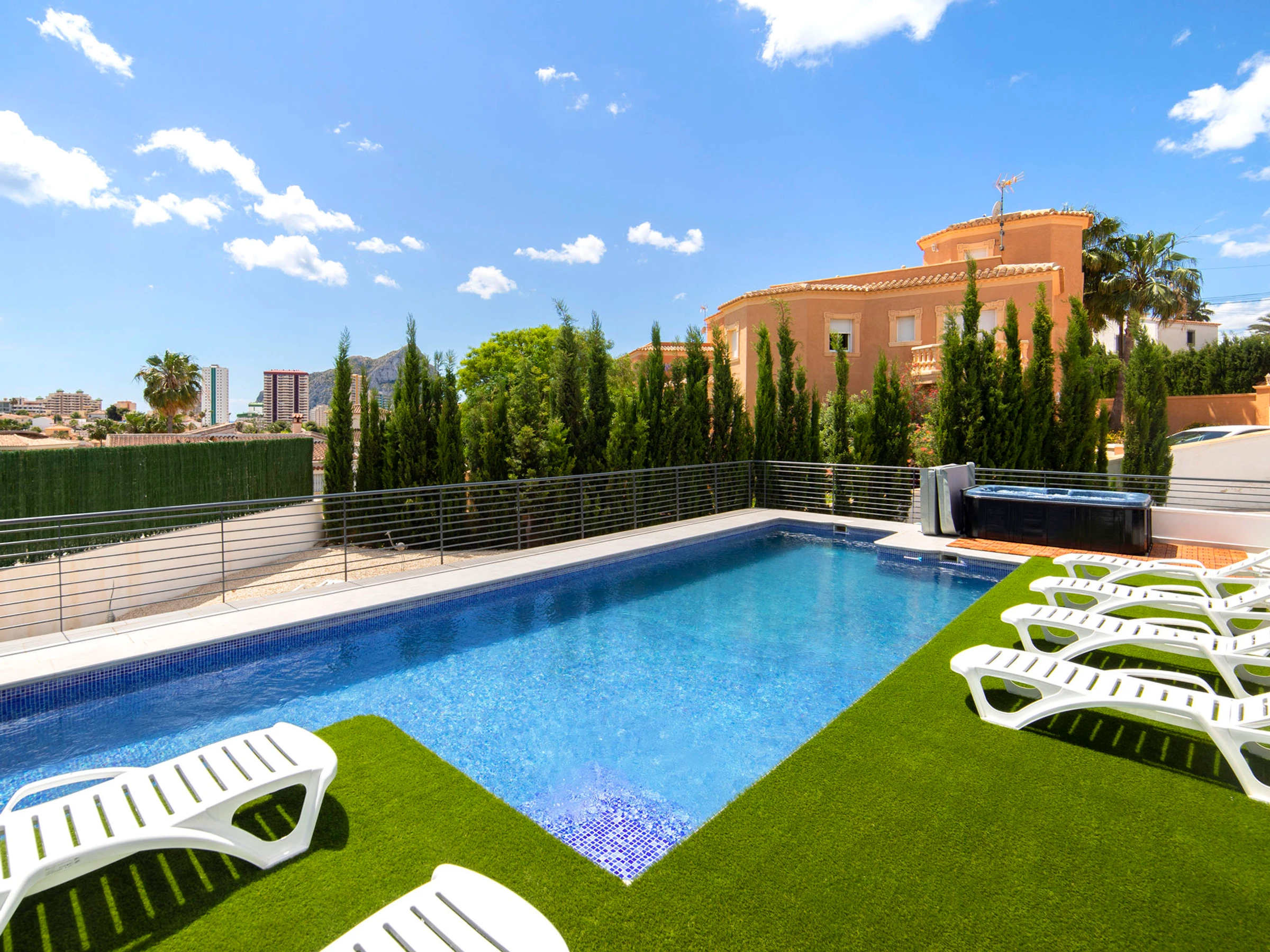 Costeres: Modern, beautiful villa "Costeres", 2 storeys, built in 2020. In the resort 3.6 km from the centre of Calpe, in the district Costeres, in a quiet, sunny position residential area (villas), traffic calmed area, 1.8 km from the sea, 1.8 km from the beach. Private: property 800 m2 (fenced), swimming pool (10 x 4 m, depth 110 - 200 cm, seasonal availability: [hidden] - [hidden] Outdoor shower, hot tub. Grocery 1.2 km, supermarket 1.2 km, restaurant, café 900 m, sandy beach "Playa de la Fosa" 1.8 km. Sports harbour 3 km, marina 3 km, golf course 15 km. Nearby attractions: Aqualandia, Mundomar, Terra Mítica, Terra Natura, Benidorm Palace (Benidorm). The owner does not accept any youth groups.