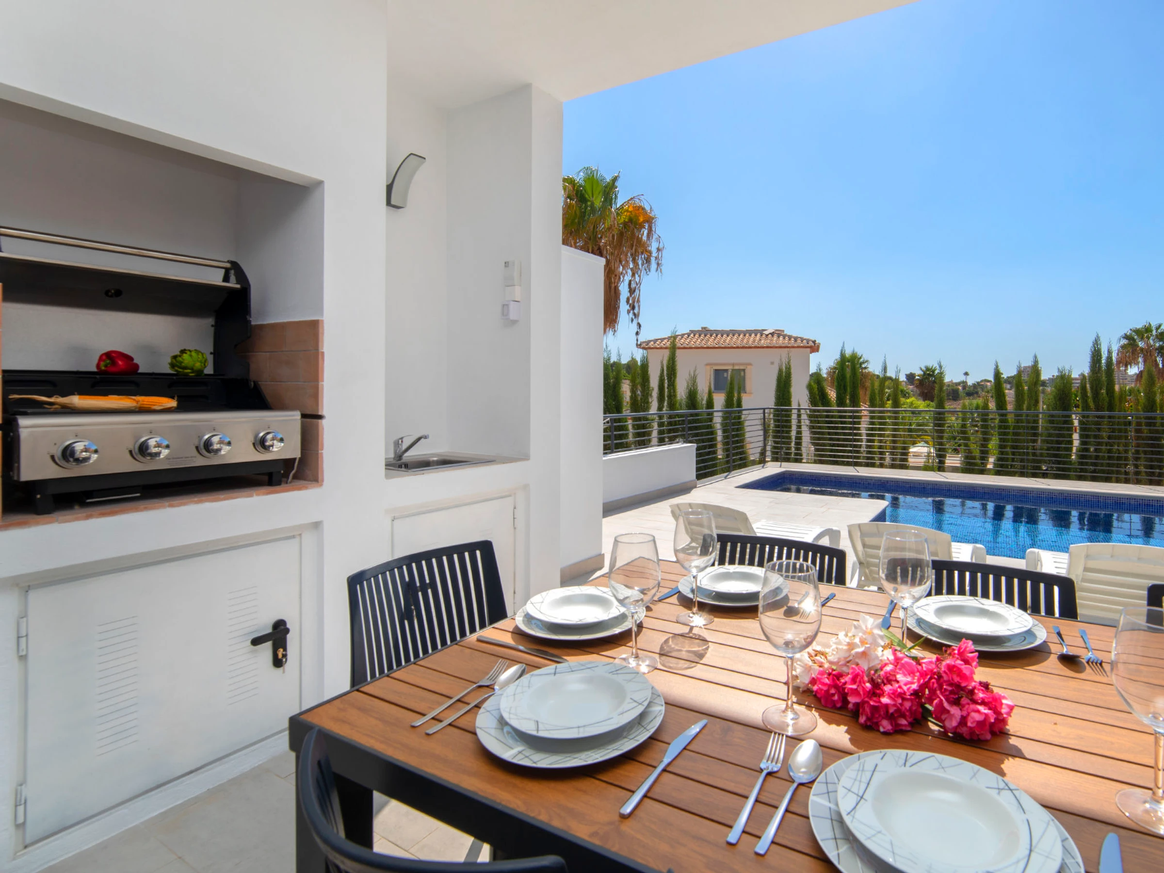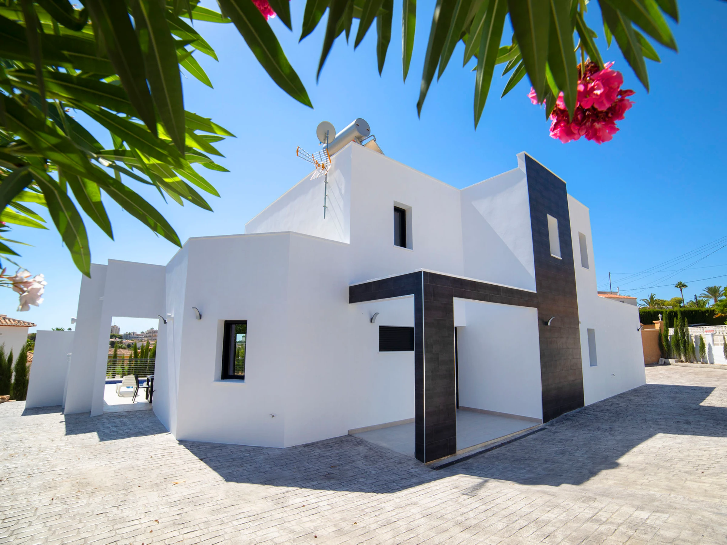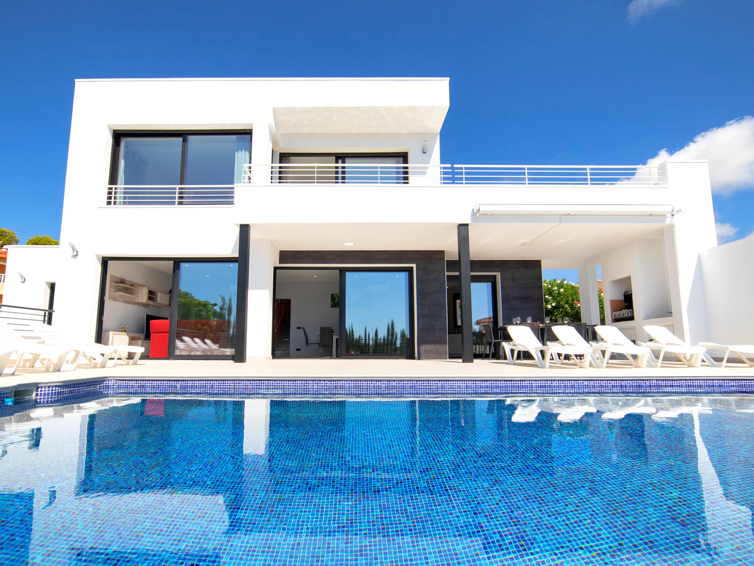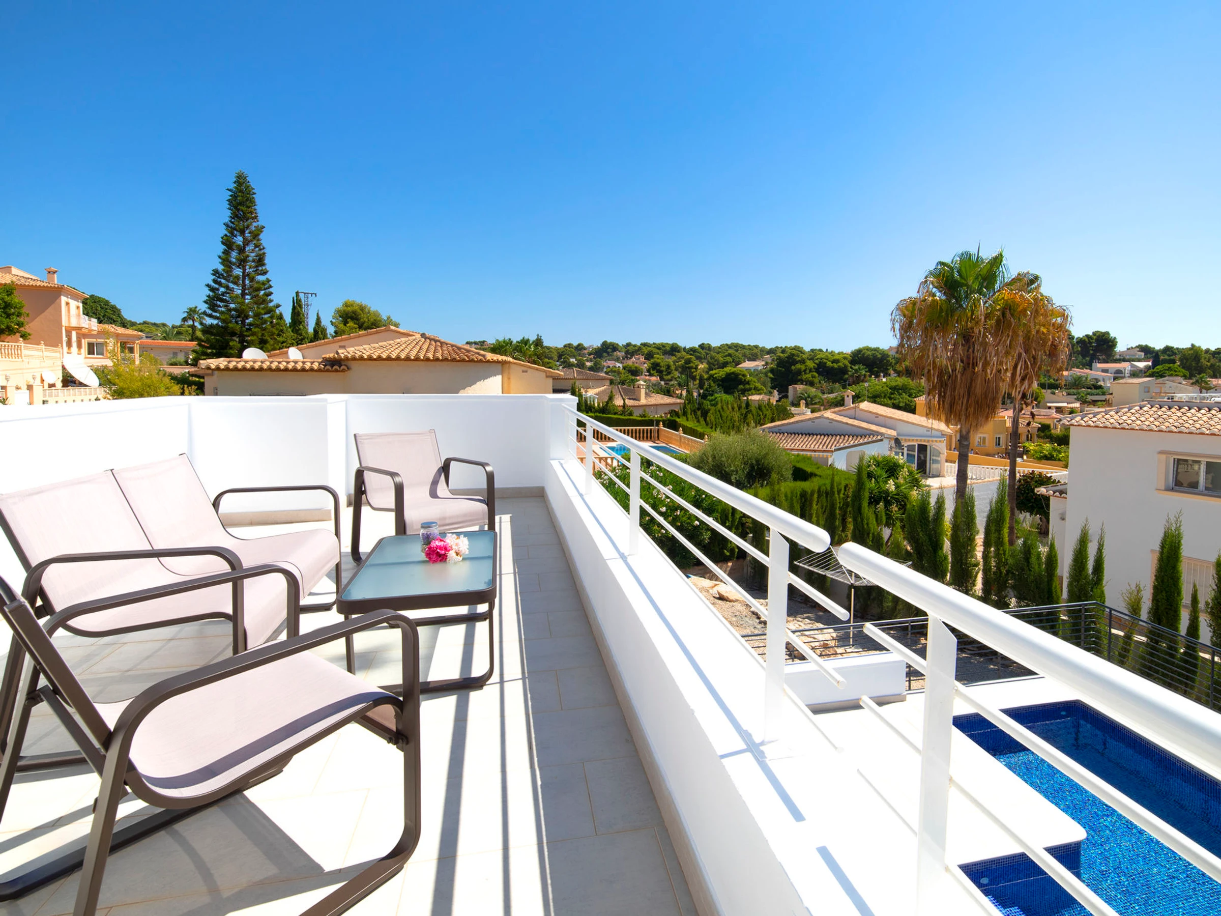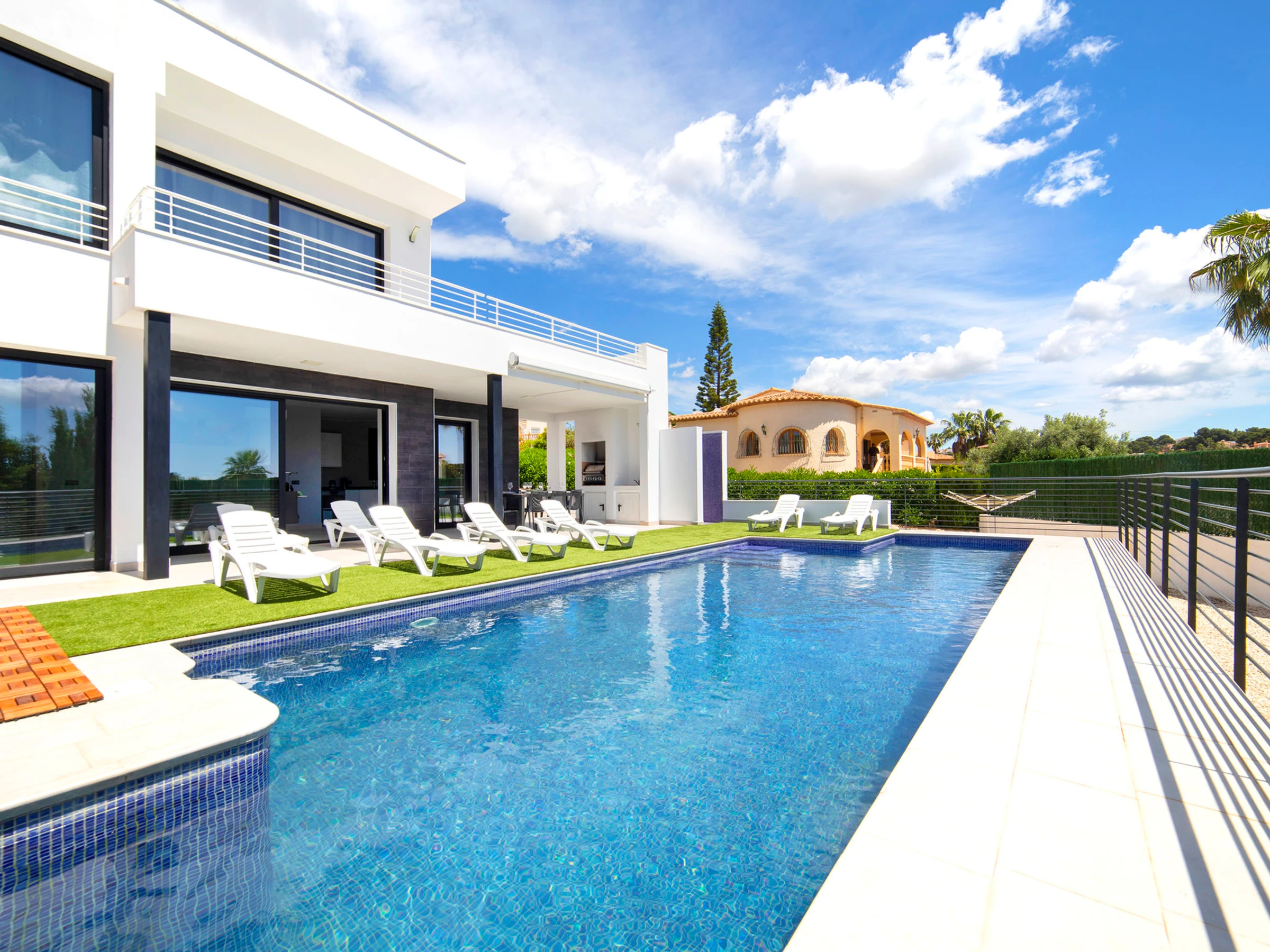Costeres: Modern, beautiful villa "Costeres", 2 storeys, built in 2020. In the resort 3.6 km from the centre of Calpe, in the district Costeres, in a quiet, sunny position residential area (villas), traffic calmed area, 1.8 km from the sea, 1.8 km from the beach. Private: property 800 m2 (fenced), swimming pool (10 x 4 m, depth 110 - 200 cm, seasonal availability: [hidden] - [hidden] Outdoor shower, hot tub. Grocery 1.2 km, supermarket 1.2 km, restaurant, café 900 m, sandy beach "Playa de la Fosa" 1.8 km. Sports harbour 3 km, marina 3 km, golf course 15 km. Nearby attractions: Aqualandia, Mundomar, Terra Mítica, Terra Natura, Benidorm Palace (Benidorm). The owner does not accept any youth groups.