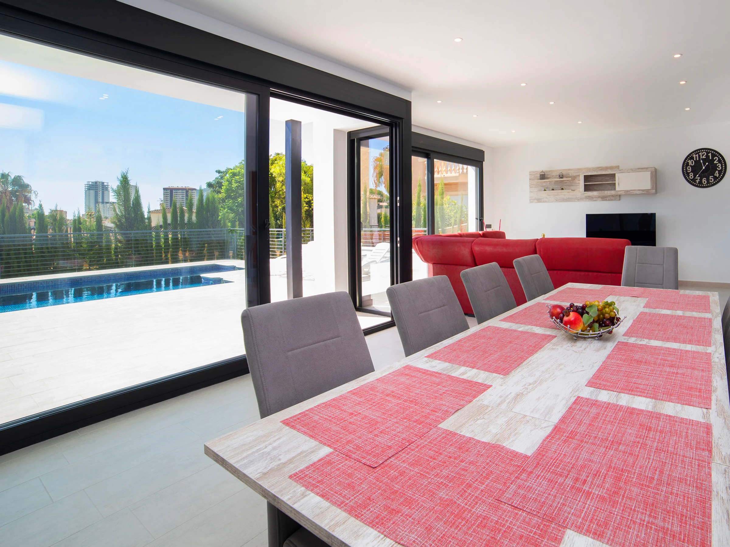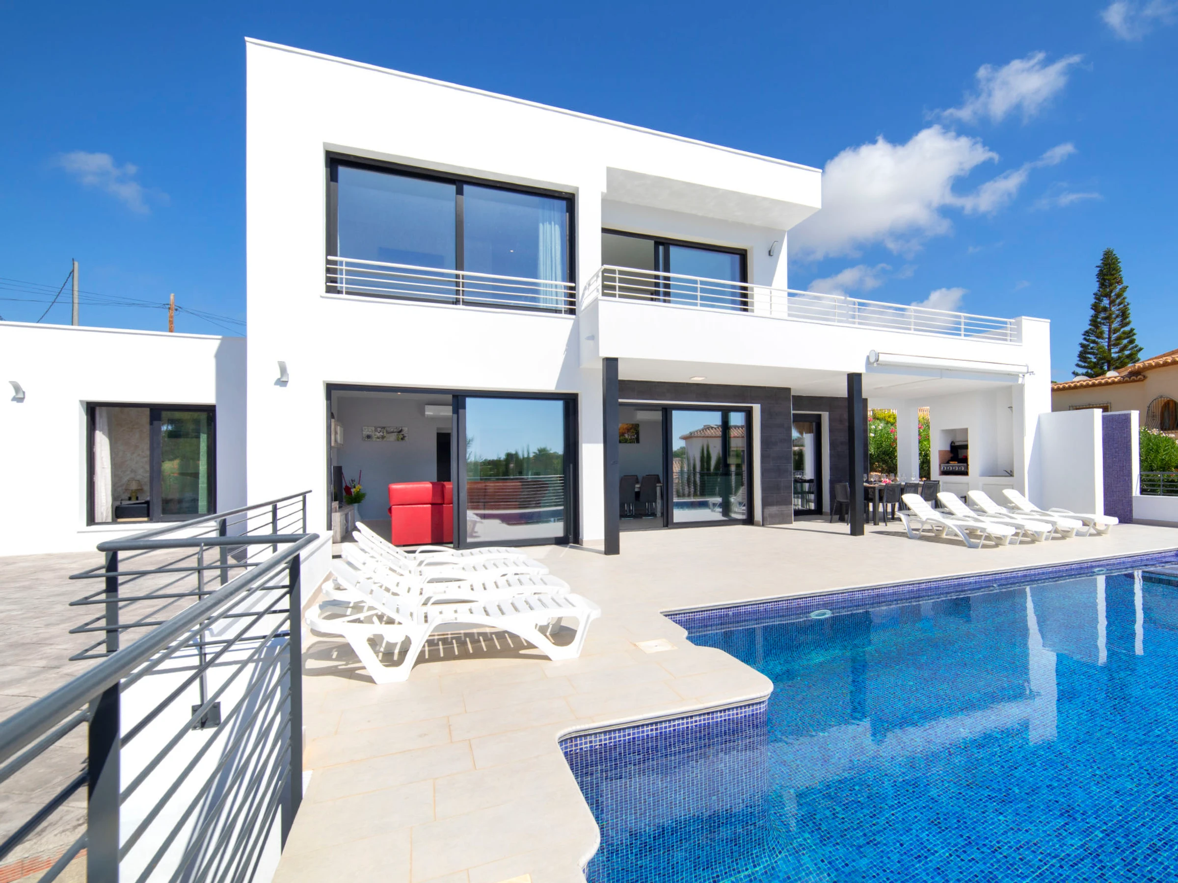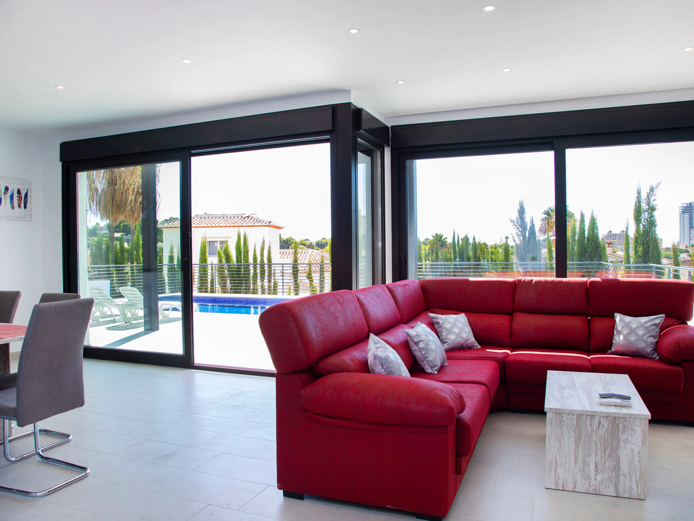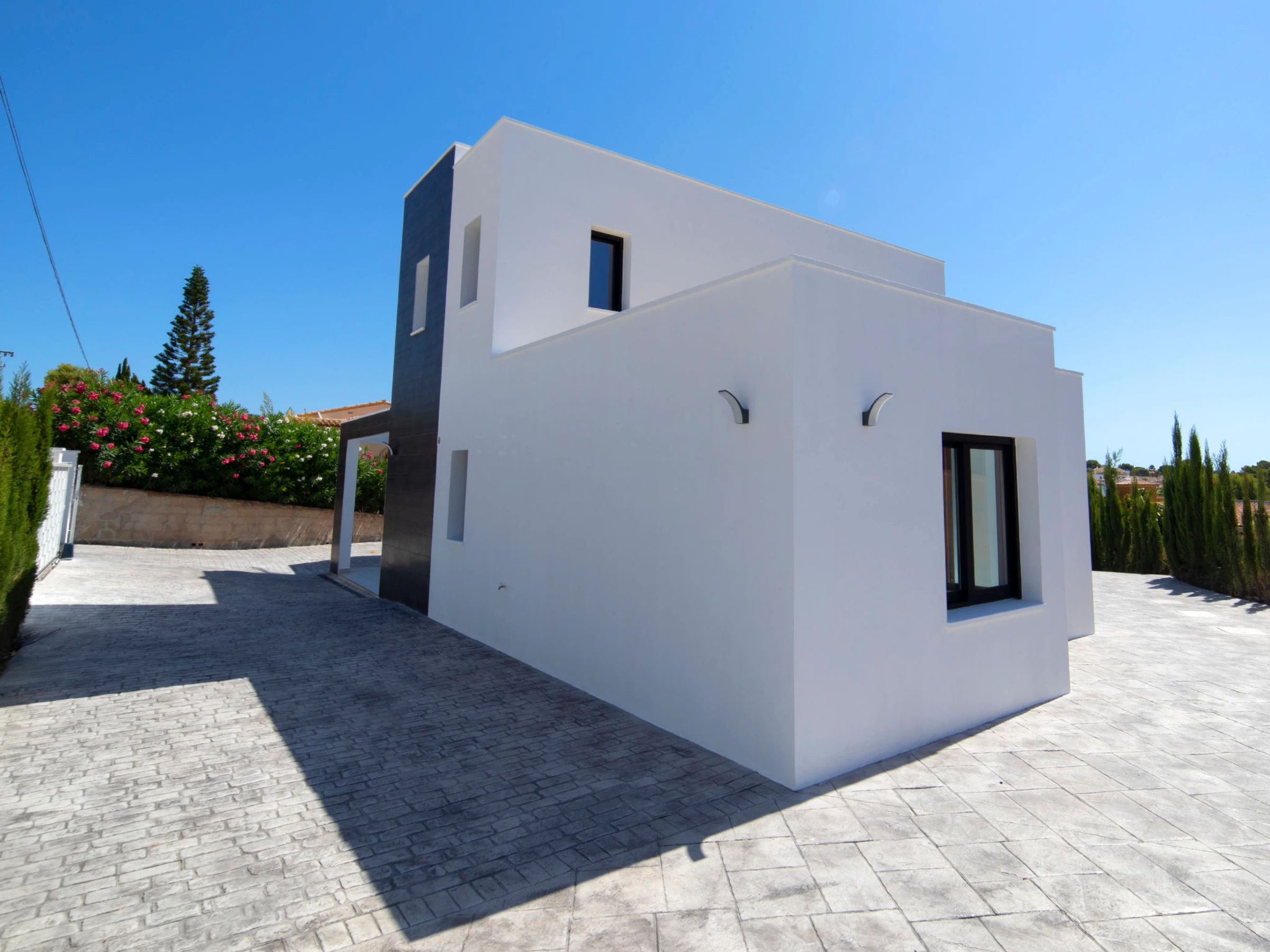 Costeres: Modern, beautiful villa "Costeres", 2 storeys, built in 2020. In the resort 3.6 km from the centre of Calpe, in the district Costeres, in a quiet, sunny position residential area (villas), traffic calmed area, 1.8 km from the sea, 1.8 km from the beach. Private: property 800 m2 (fenced), swimming pool (10 x 4 m, depth 110 - 200 cm, seasonal availability: [hidden] - [hidden] Outdoor shower, hot tub. Grocery 1.2 km, supermarket 1.2 km, restaurant, café 900 m, sandy beach "Playa de la Fosa" 1.8 km. Sports harbour 3 km, marina 3 km, golf course 15 km. Nearby attractions: Aqualandia, Mundomar, Terra Mítica, Terra Natura, Benidorm Palace (Benidorm). The owner does not accept any youth groups.