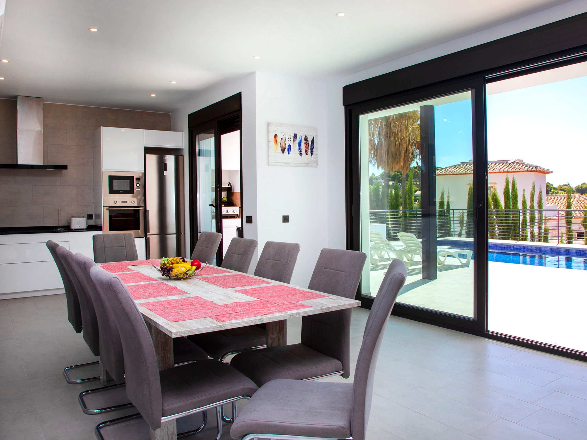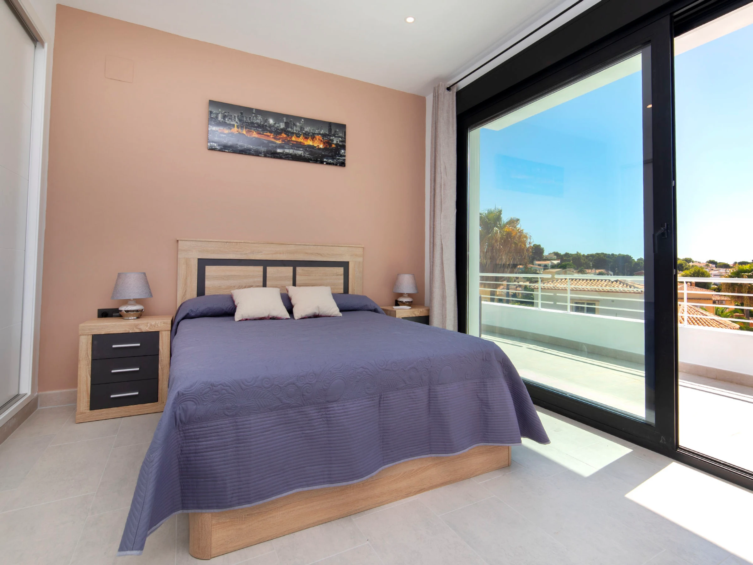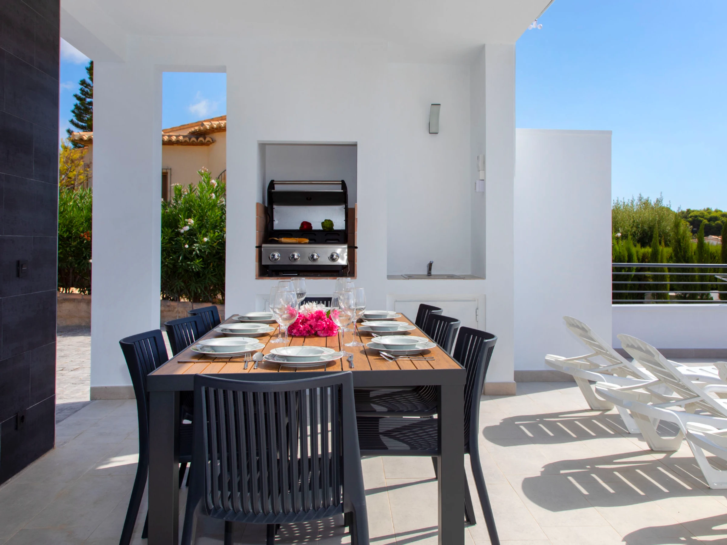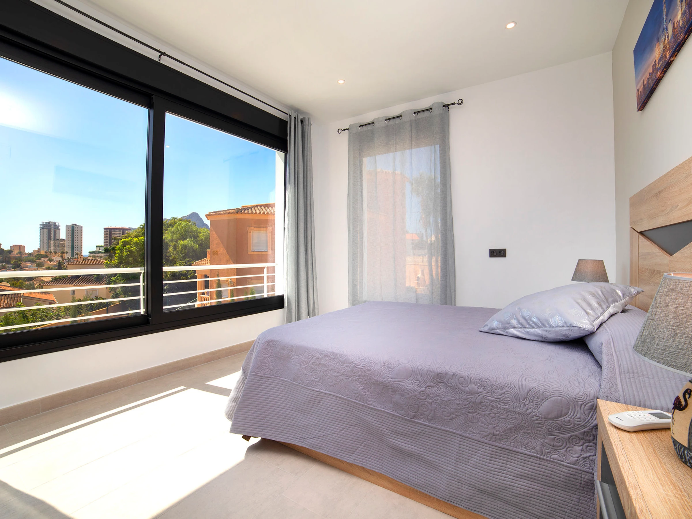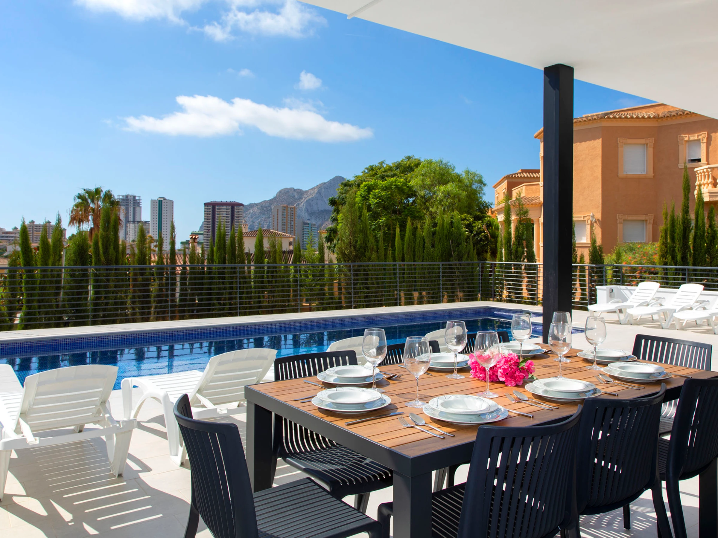 Costeres: Modern, beautiful villa "Costeres", 2 storeys, built in 2020. In the resort 3.6 km from the centre of Calpe, in the district Costeres, in a quiet, sunny position residential area (villas), traffic calmed area, 1.8 km from the sea, 1.8 km from the beach. Private: property 800 m2 (fenced), swimming pool (10 x 4 m, depth 110 - 200 cm, seasonal availability: [hidden] - [hidden] Outdoor shower, hot tub. Grocery 1.2 km, supermarket 1.2 km, restaurant, café 900 m, sandy beach "Playa de la Fosa" 1.8 km. Sports harbour 3 km, marina 3 km, golf course 15 km. Nearby attractions: Aqualandia, Mundomar, Terra Mítica, Terra Natura, Benidorm Palace (Benidorm). The owner does not accept any youth groups.