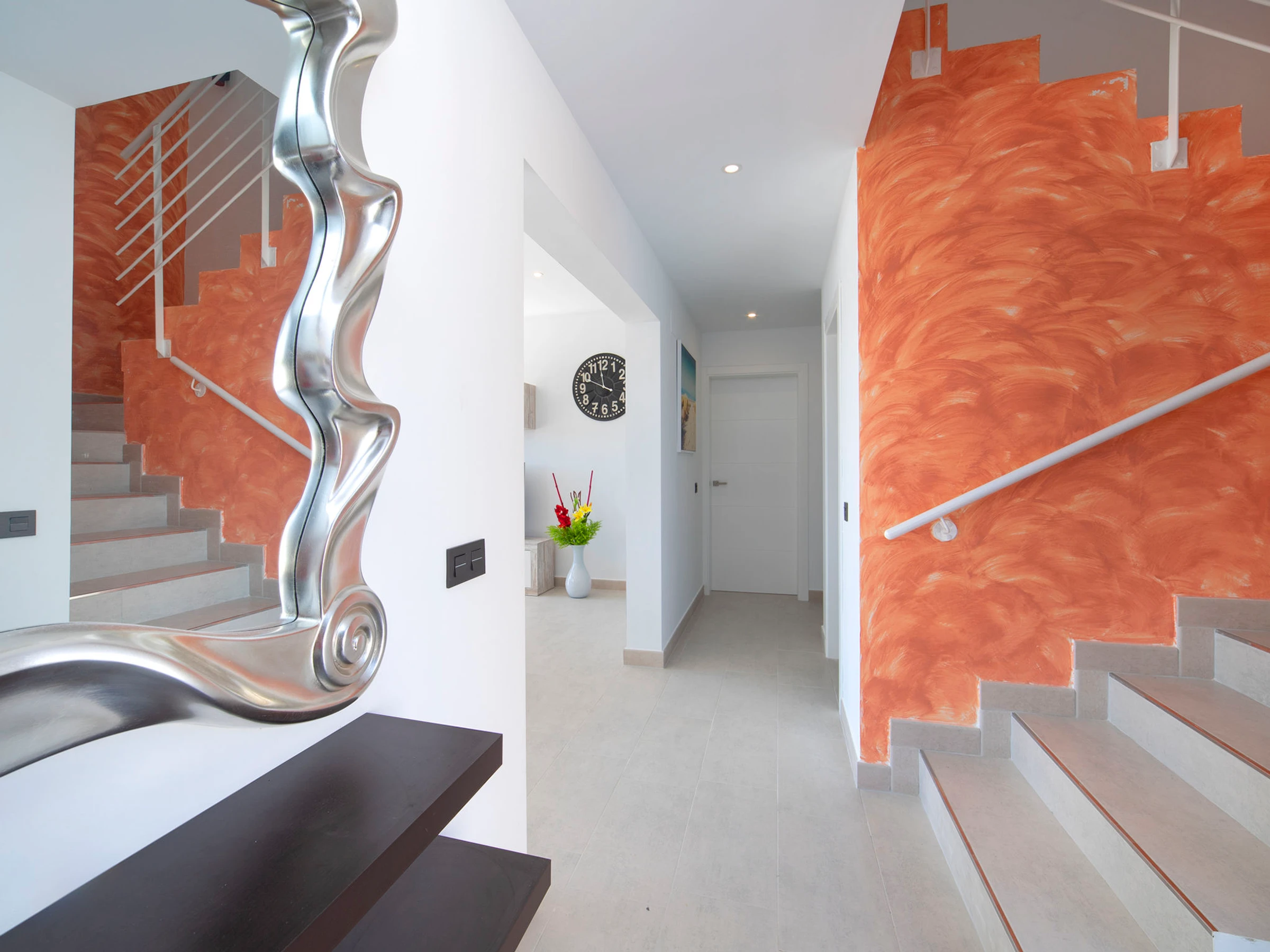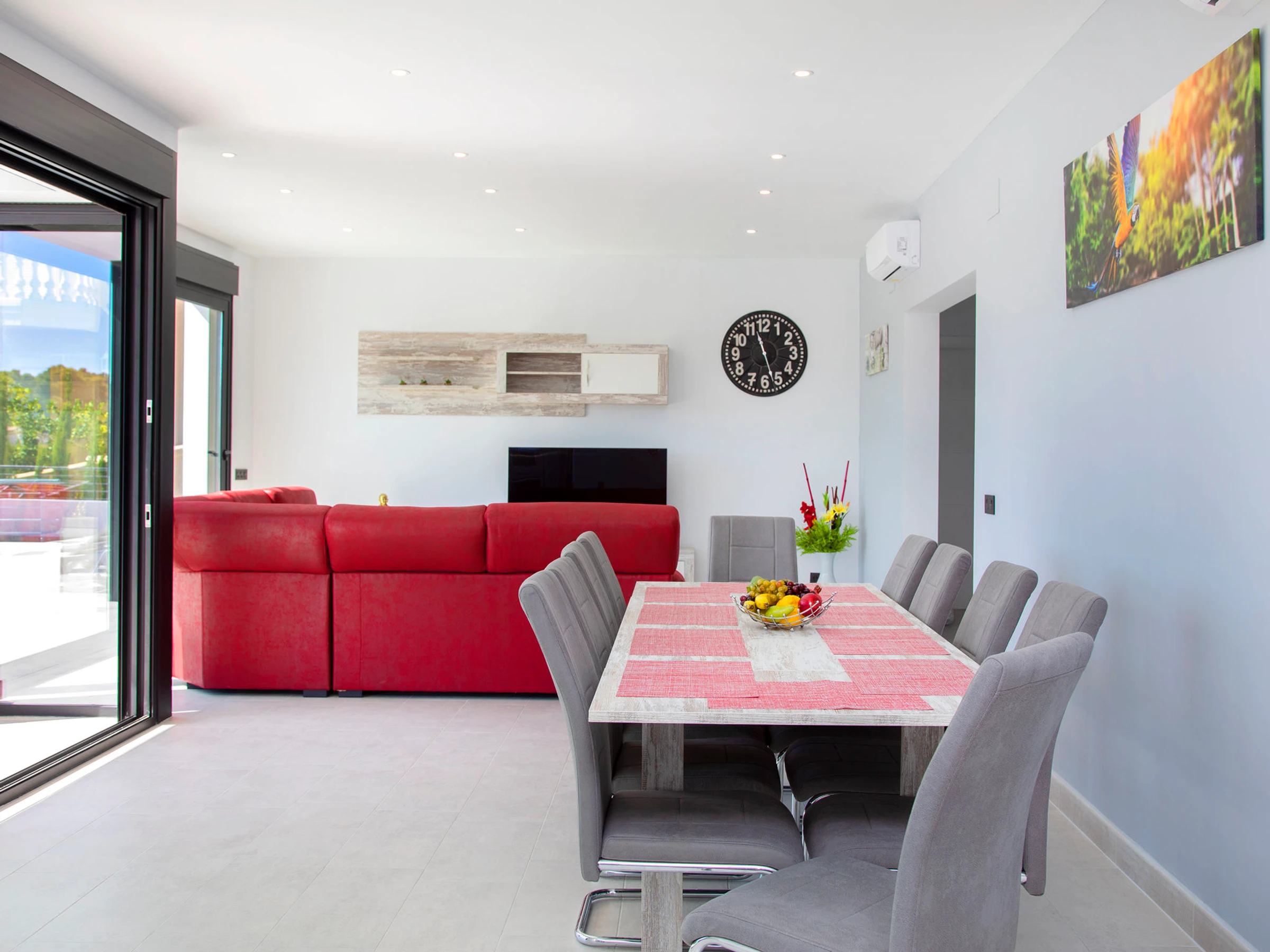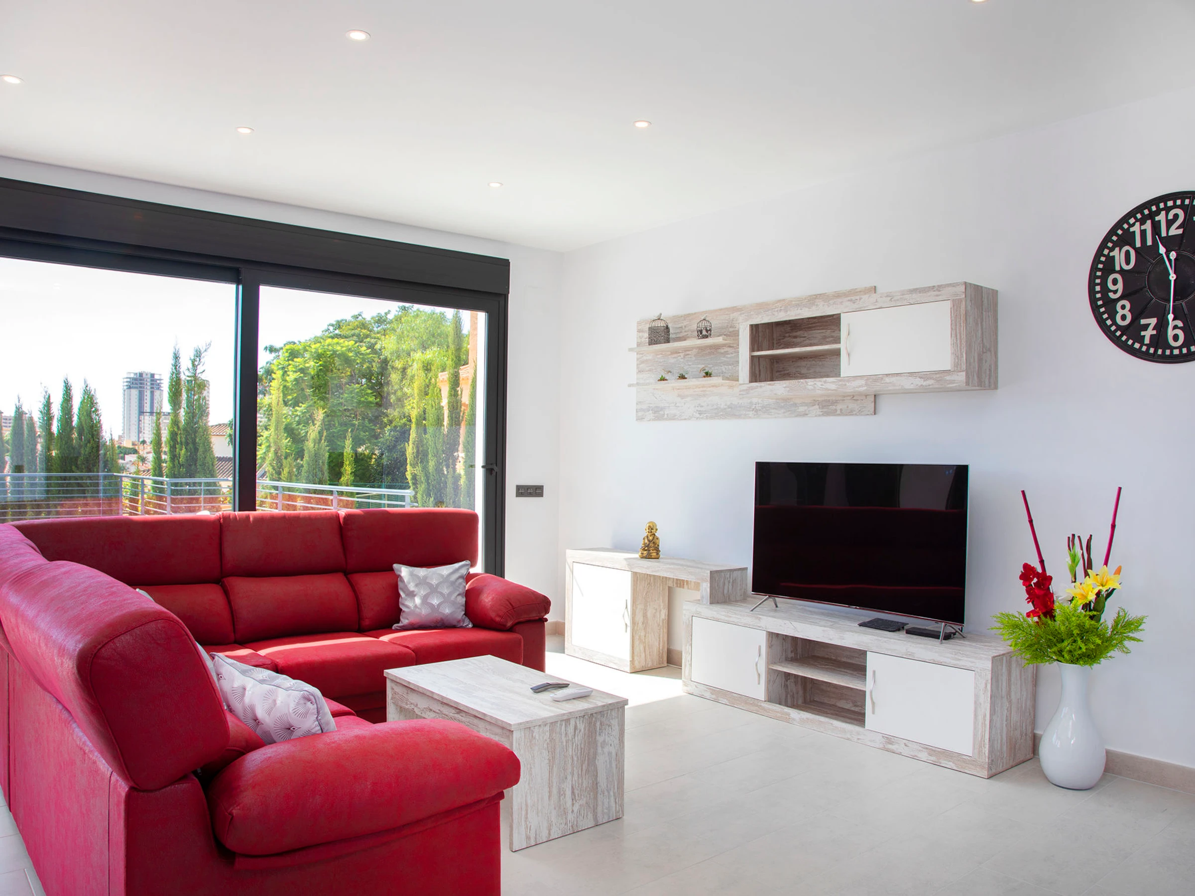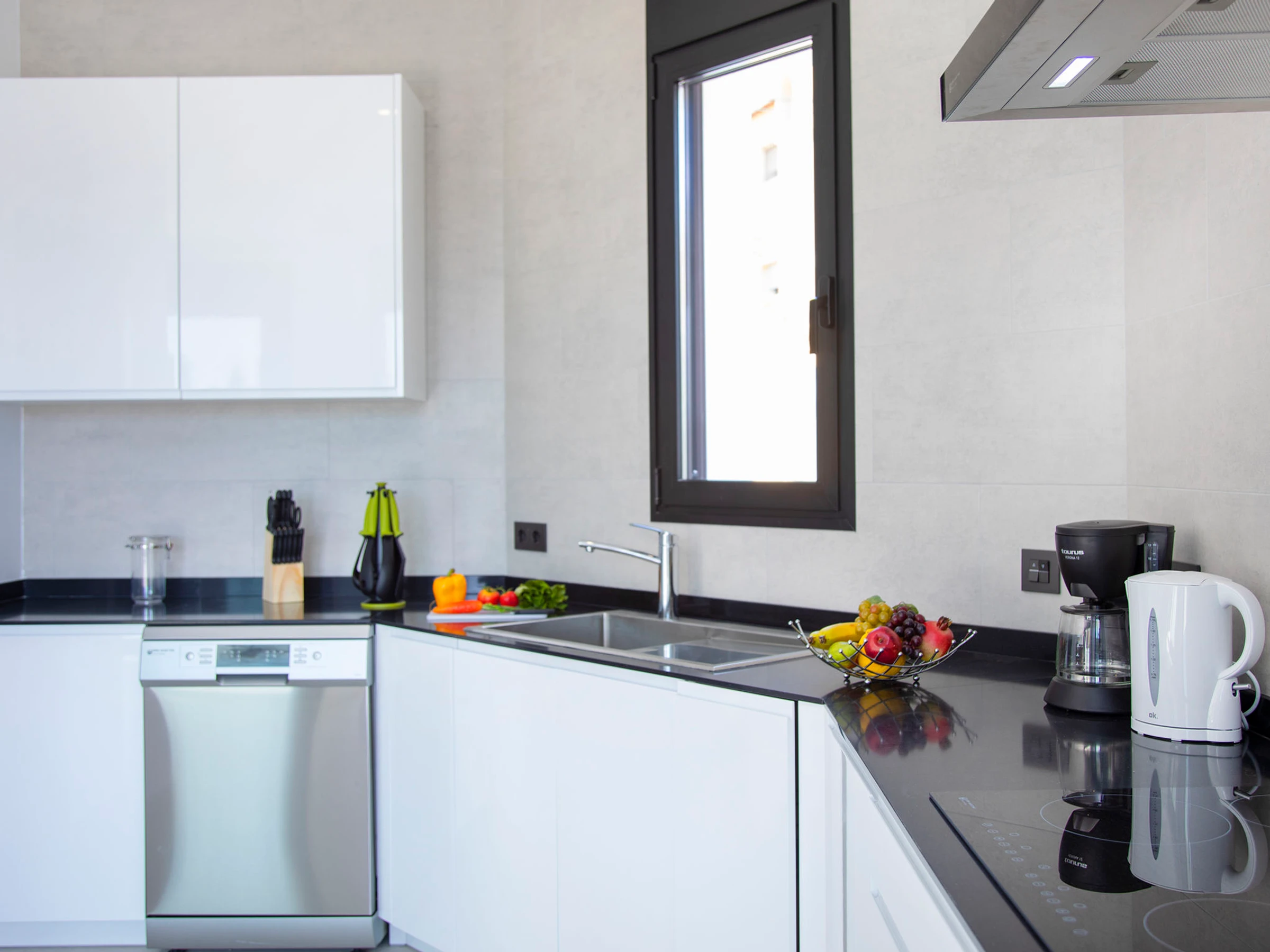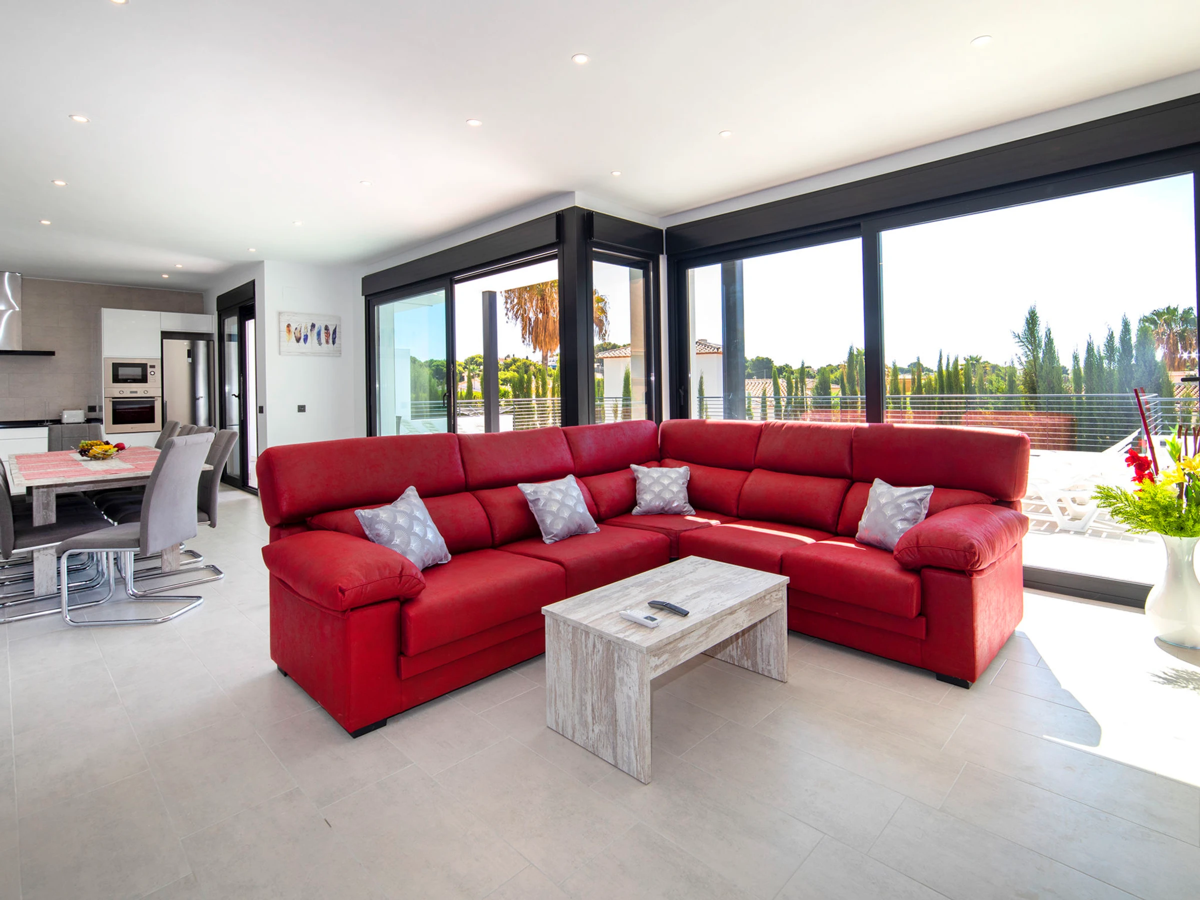 Costeres: Modern, beautiful villa "Costeres", 2 storeys, built in 2020. In the resort 3.6 km from the centre of Calpe, in the district Costeres, in a quiet, sunny position residential area (villas), traffic calmed area, 1.8 km from the sea, 1.8 km from the beach. Private: property 800 m2 (fenced), swimming pool (10 x 4 m, depth 110 - 200 cm, seasonal availability: [hidden] - [hidden] Outdoor shower, hot tub. Grocery 1.2 km, supermarket 1.2 km, restaurant, café 900 m, sandy beach "Playa de la Fosa" 1.8 km. Sports harbour 3 km, marina 3 km, golf course 15 km. Nearby attractions: Aqualandia, Mundomar, Terra Mítica, Terra Natura, Benidorm Palace (Benidorm). The owner does not accept any youth groups.