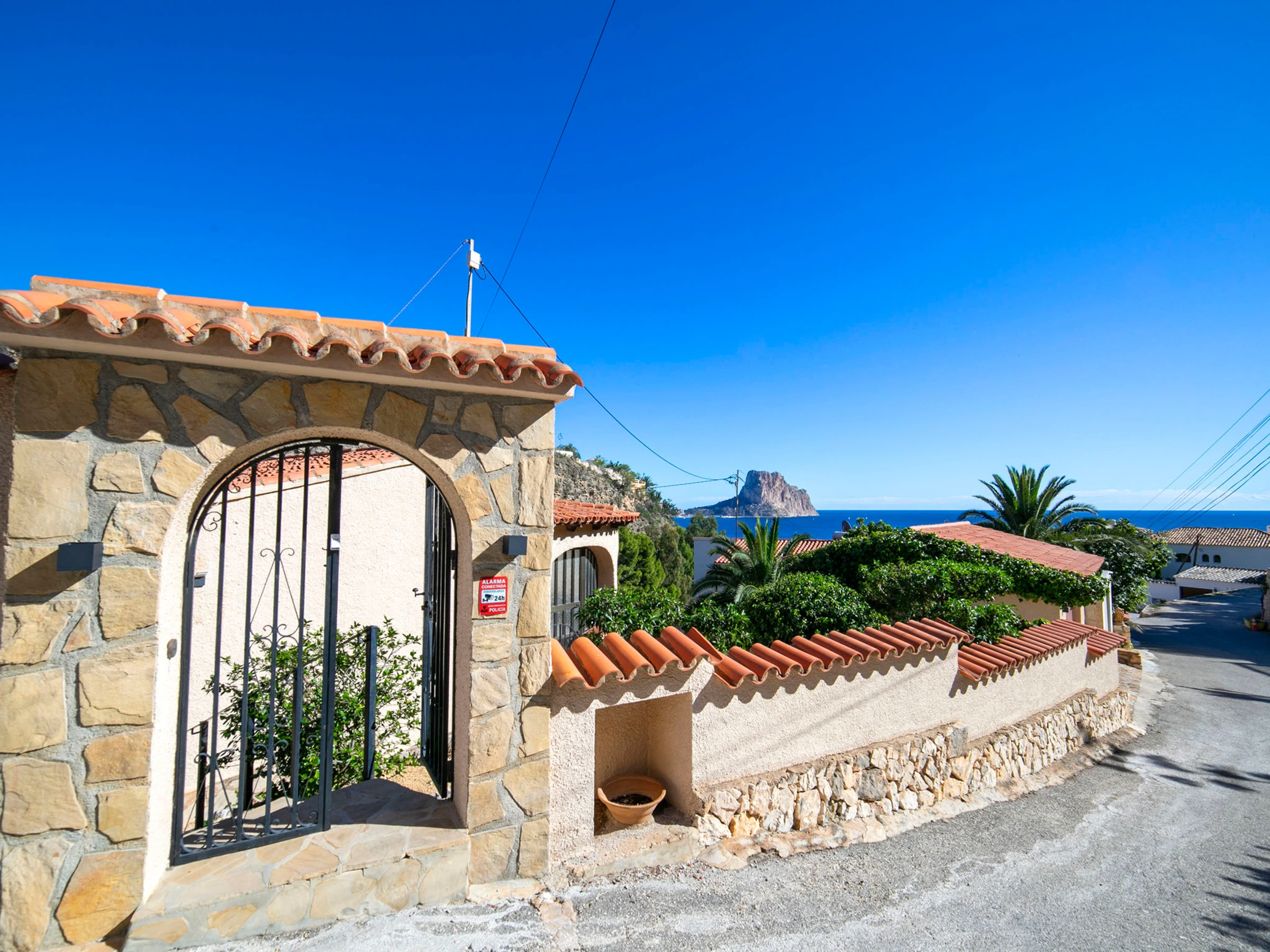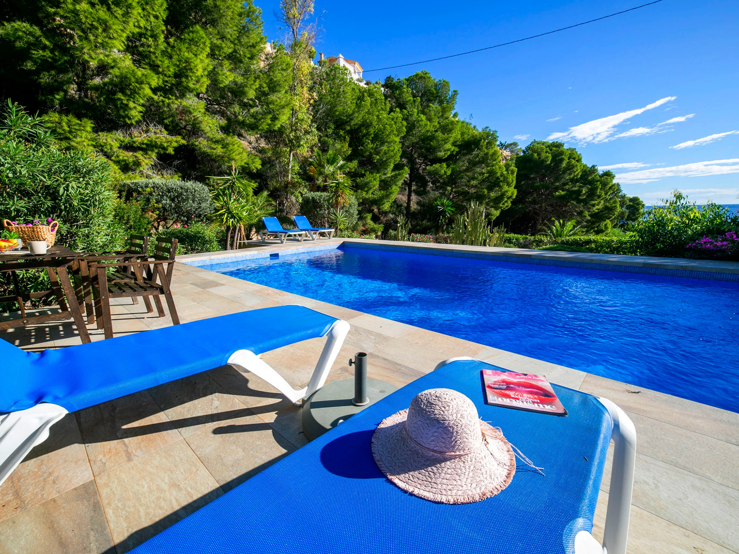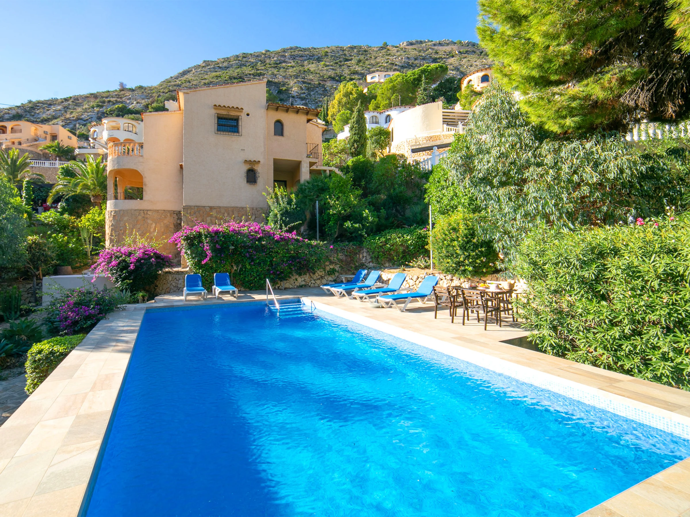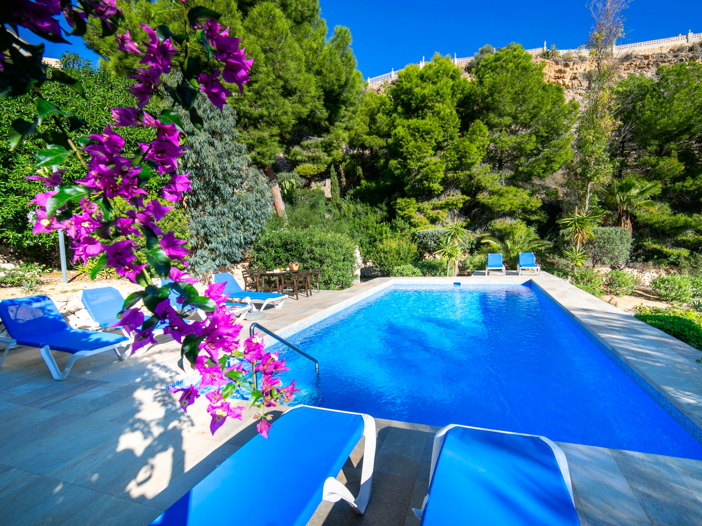 Beautiful villa "Buena Vista", 2 storeys. 3 km from the centre of Calpe, in the district Maryvilla, in a quiet, sunny position residential area (villas), traffic calmed area, 120 m from the sea, 1 km from the beach. Private: property 1'466 m2 (fenced), garden, swimming pool (10 x 5 m, seasonal availability: [hidden] - [hidden] with internal staircase. Terrace, garden furniture, barbecue. Stepped path (37 steps) to the house. Shop 3 km, grocery 2 km, supermarket 2 km, shopping centre 3 km, restaurant, café 550 m, bus stop 2 km, sandy beach "Playa Puerto Blanco" 1 km, swimming bay 120 m. Sports harbour 1 km, marina 1 km, golf course (12 hole) 12 km. Nearby attractions: Aqualandia, Mundomar, Terra Mítica, Terra Natura, Benidorm Palace (Benidorm), Les Fonts de l'Algar, Castillo de Guadalest. The owner does not accept any youth groups.