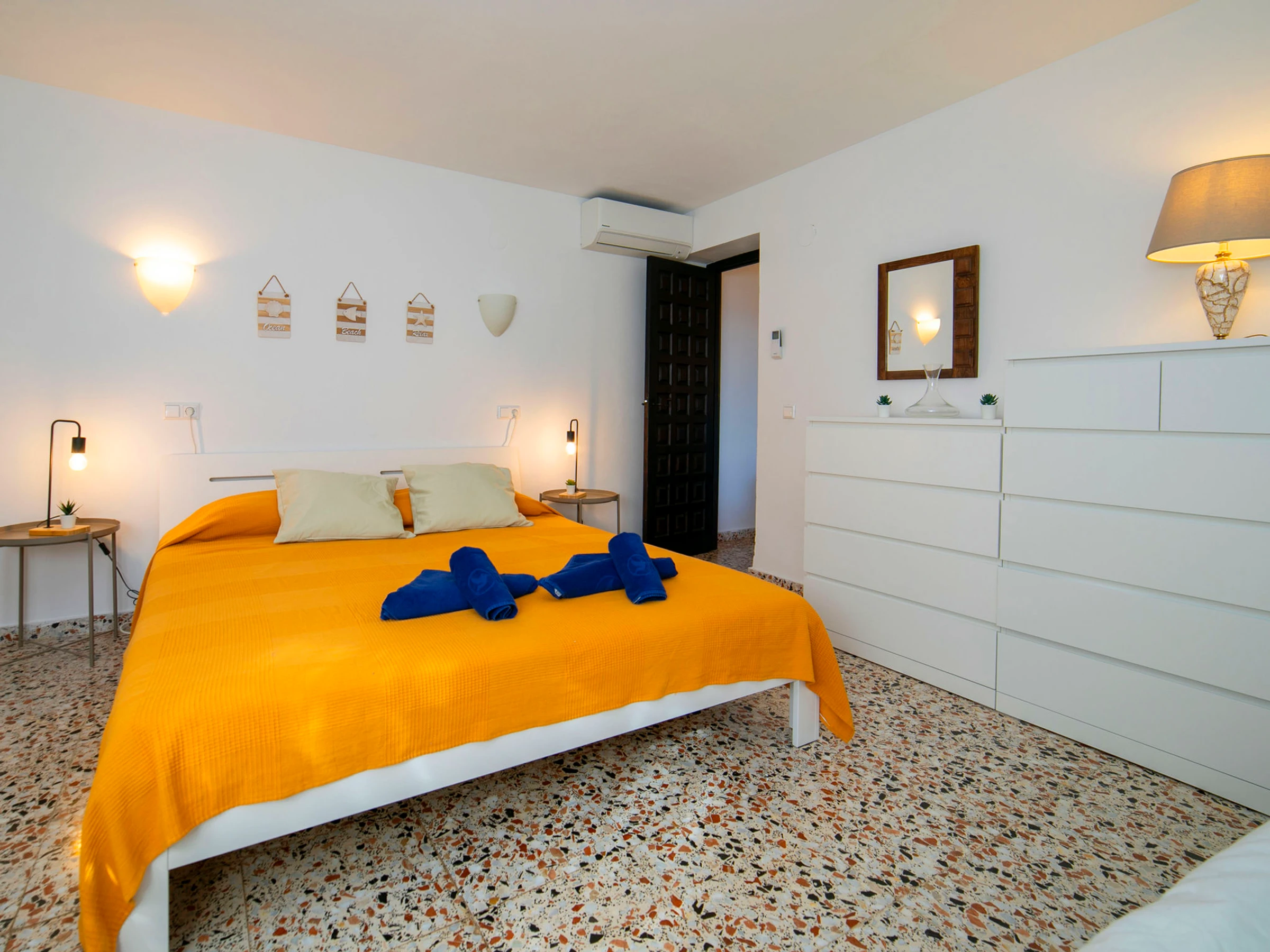 "Buena Vista", 6-room villa 235 m2 on 2 levels. Spacious and bright, comfortable and beautiful furnishings: open living/dining room with satellite TV, air conditioning and forced-air heating. Exit to the terrace. 1 room with 1 double bed (2 x 90 cm, length 200 cm), air conditioning and forced-air heating. 1 room with 2 beds (90 cm, length 200 cm), air conditioning and forced-air heating. Open kitchen (oven, dishwasher, 3 induction hot plates, toaster, kettle, microwave). Shower/WC. Electric heating. On the lower ground floor: (exterior staircase) living/dining room with satellite TV. 1 room with 1 french bed (150 cm, length 190 cm), air conditioning and forced-air heating. 1 room with 1 double bed (2 x 90 cm, length 200 cm), air conditioning and forced-air heating. Kitchen (4 gas rings, toaster, kettle, microwave, electric coffee machine). Shower/WC. Large terrace. Terrace furniture, barbecue, deck chairs, sitting area. Beautiful view of the sea and the resort. Facilities: washing machine, iron, children's high chair, baby cot for up to 2 year olds, hair dryer. Internet (WiFi, free). Parking, garage. Please note: non-smoking house. No internal connecting door between the floors. [hidden]