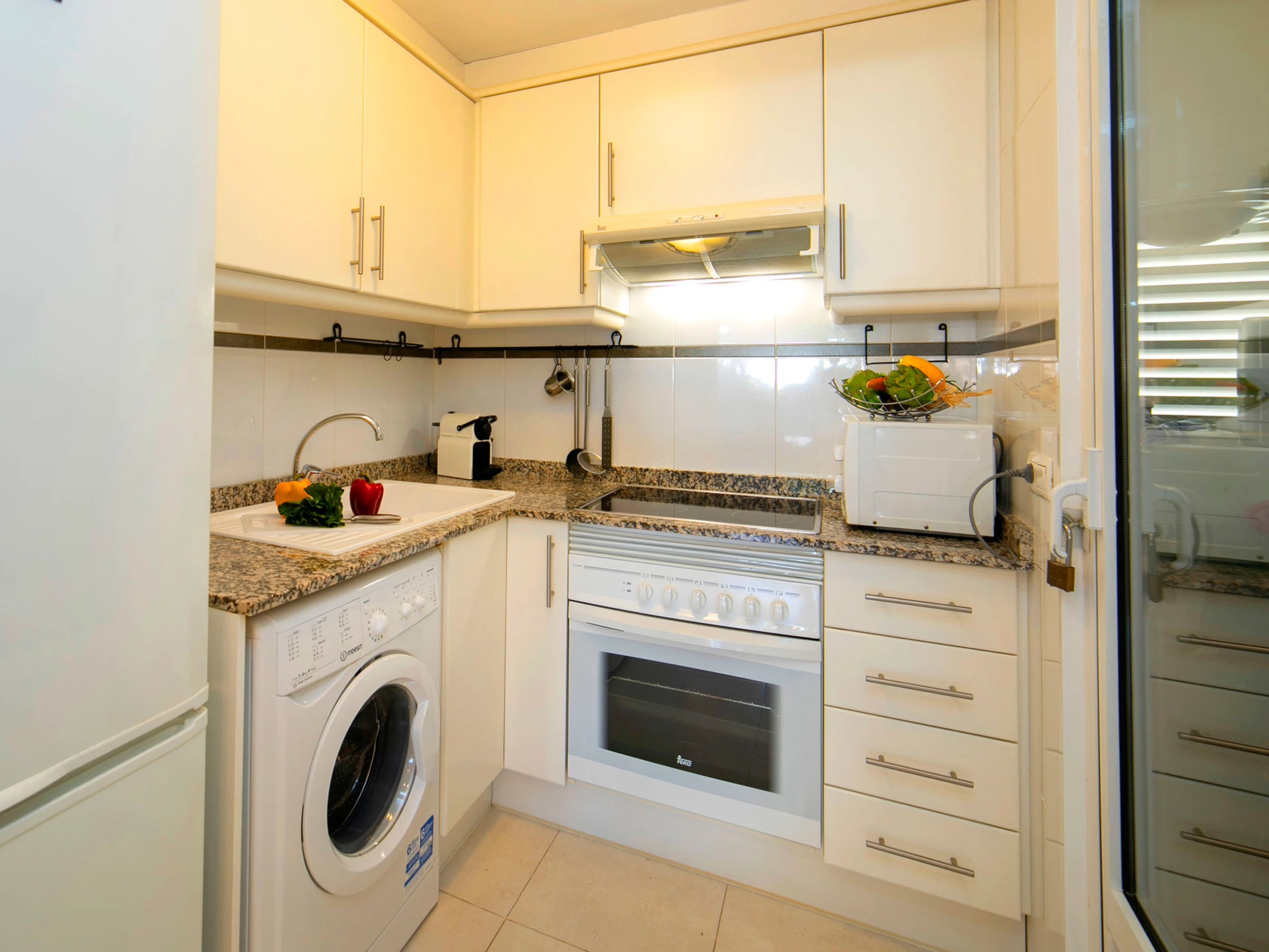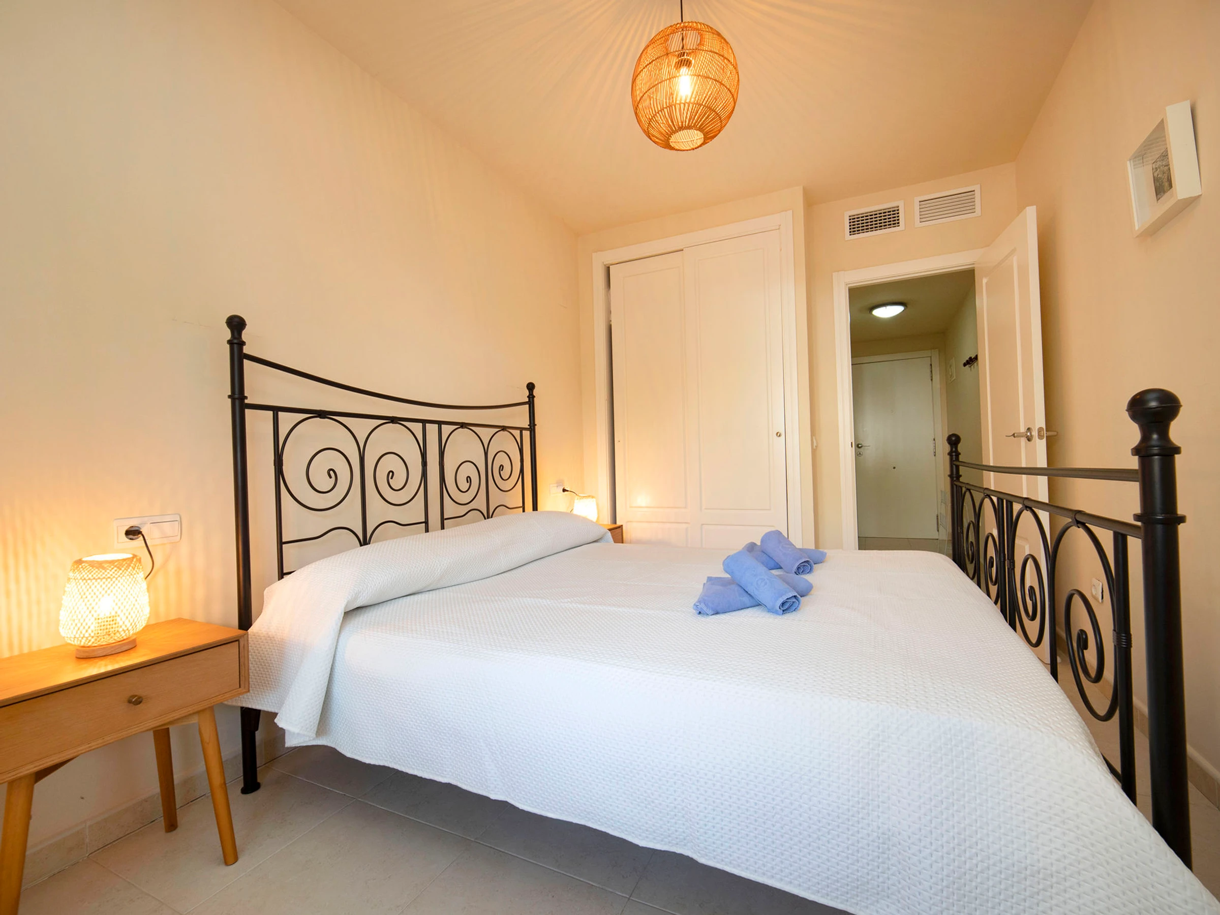 "Apolo XVIII", 2-room apartment 83 m2 on 1st floor. Object suitable for 2 adults + 1 child. Spacious, comfortable and beautiful furnishings: living/dining room with 1 sofabed, digital TV, air conditioning and forced-air heating. Exit to the terrace. 1 room with 1 french bed (1 x 160 cm, length 200 cm), air conditioning and forced-air heating. Exit to the terrace. Kitchen (oven, 2 ceramic glass hob hotplates, 2 gas rings, toaster, kettle, microwave, electric coffee machine). Bath/bidet/WC. Forced-air heating. Large terrace. Balcony furniture. View of the swimming pool and the garden. Facilities: washing machine, iron, hair dryer. Internet (WiFi, free). Please note: non-smoking house. [hidden] // Reg. Nr.: ESFCTU00000302900059204600000000000000000[hidden]1