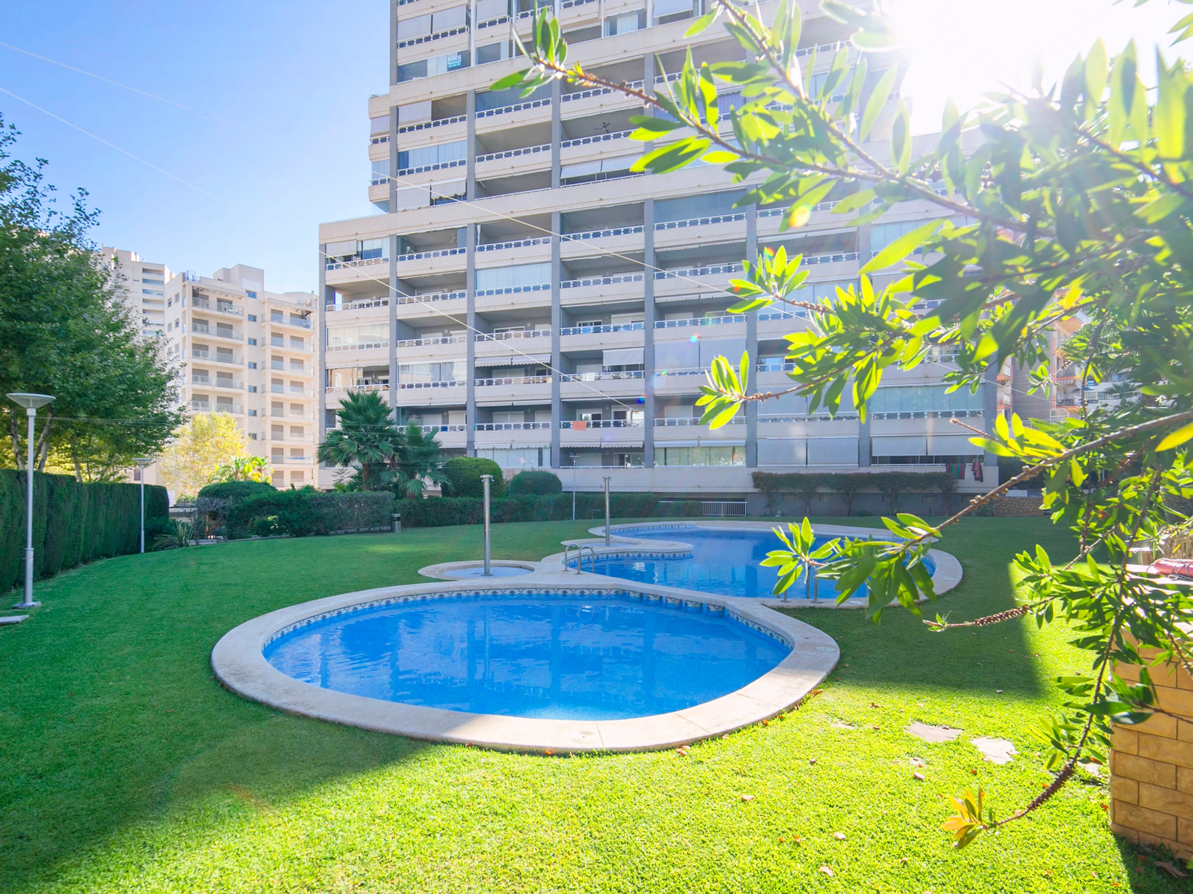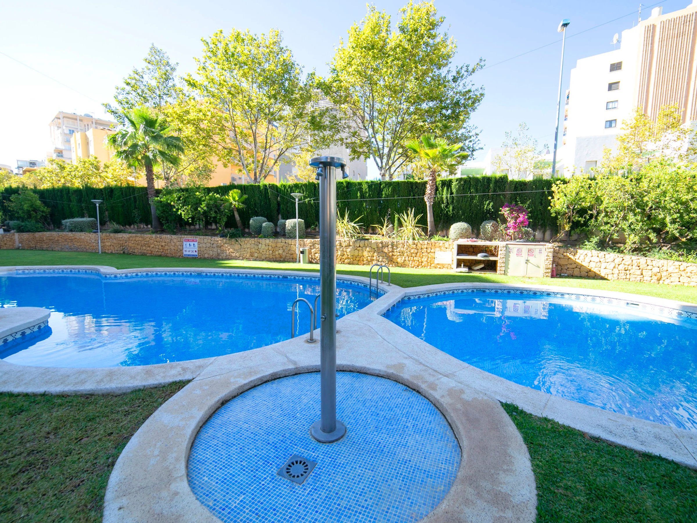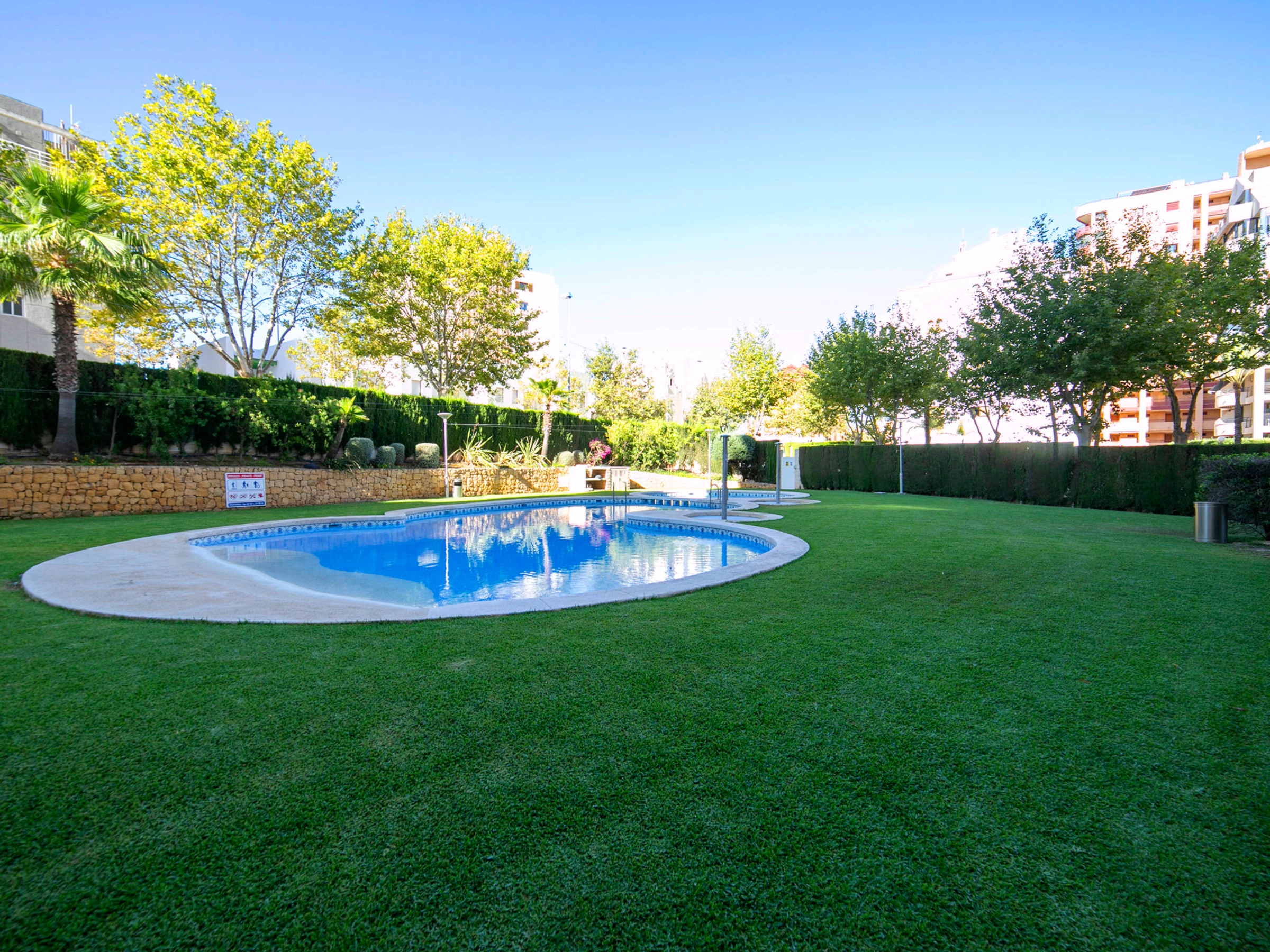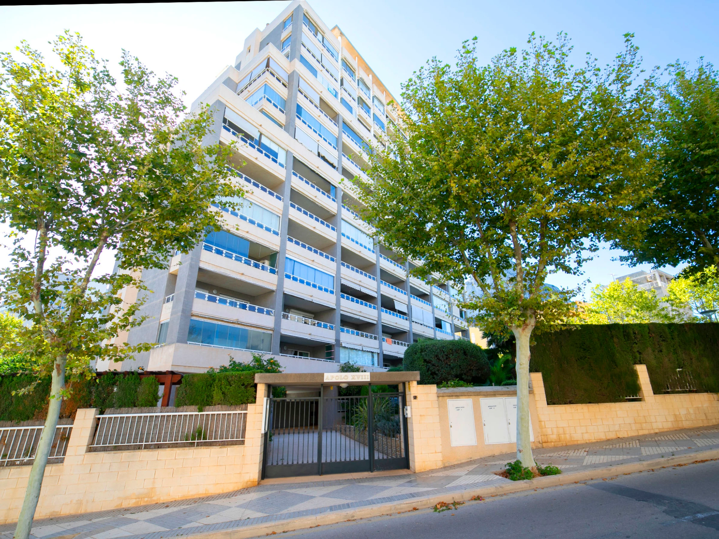 Beautiful apartment block "Apolo XVIII". 2 km from the centre of Calpe, 100 m from the sea, 100 m from the beach. For shared use: property (fenced), garden, lawn for sunbathing, swimming pool (20 x 9 m, seasonal availability: [hidden] - [hidden] Children's pool, outdoor shower. In the house: lift. Public car park at 50 m. Shop, grocery, supermarket 250 m, restaurant, bar, café 50 m, bus stop "Parada Bus" 130 m, sandy beach "Playa Cantal Roig" 100 m. Sports harbour, marina 350 m. Nearby attractions: Aqualandia, Mundomar, Terra Mítica, Terra Natura, Benidorm Palace (Benidorm), Les Fonts de l'Algar, Castillo de Guadalest.