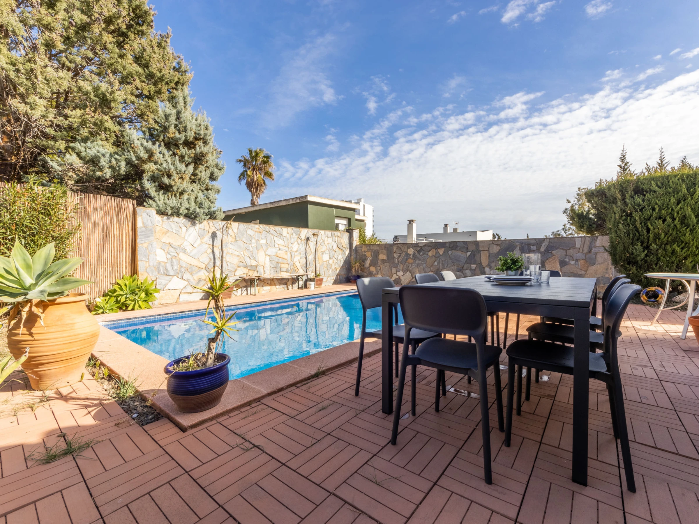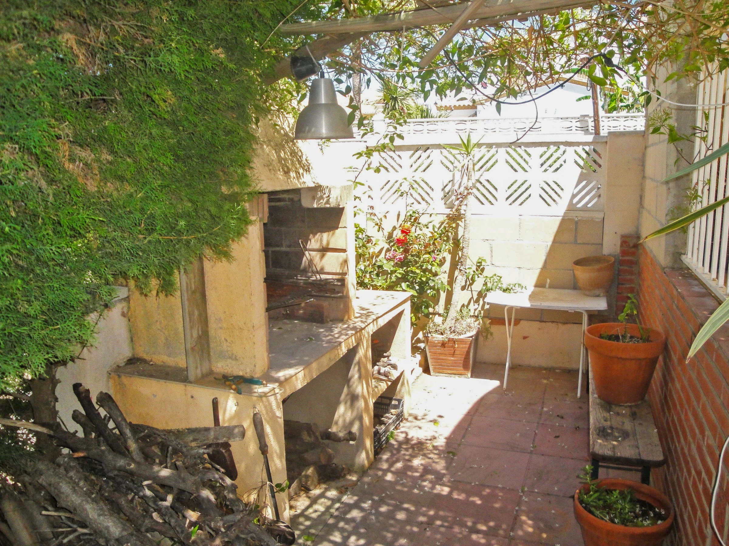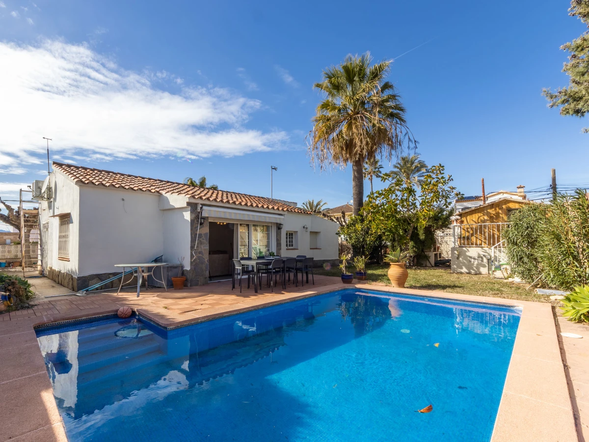 Cambrils Mediterranea: Beautiful house "Cambrils", detached. Outside the resort, 3 km from the centre of Cambrils, from the sea, 800 m from the beach, located by a road. Private: property 500 m2 (fenced), wildlife garden and flowers, swimming pool angular (7 x 4 m, depth 90 - 200 cm, seasonal availability: [hidden] - [hidden] Arbour, garden furniture, barbecue. Stepped path (6 steps) to the house. Public parking on the road. Shop 1 km, bar 1 km, bus stop 300 m, railway station 3 km. Golf course (18 hole) 4 km. Nearby attractions: Parque temático PORTAVENTURA 8 km, Parque aquático AQUOPOLIS 10 km, Spa AQUUM 10 km, Karting 7 km, Paintball 10 km. Groups of teenagers on request only.