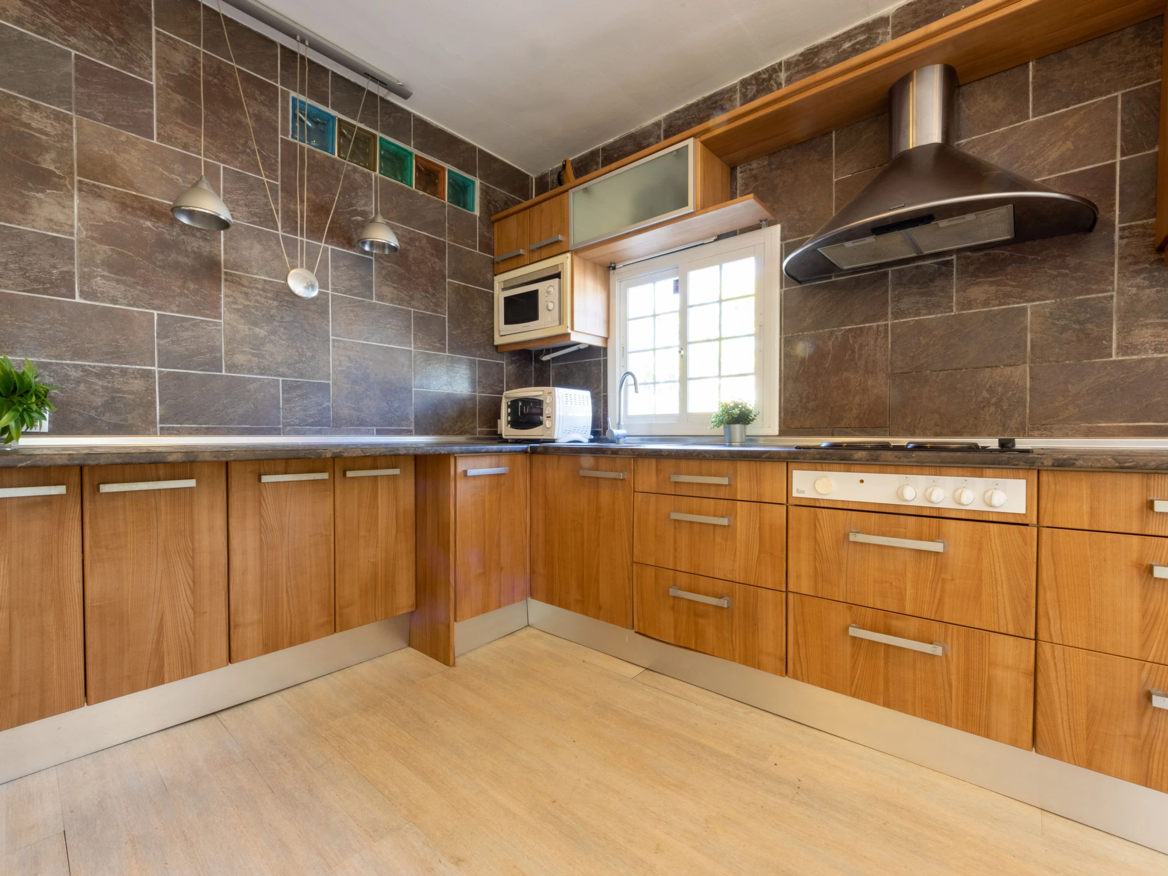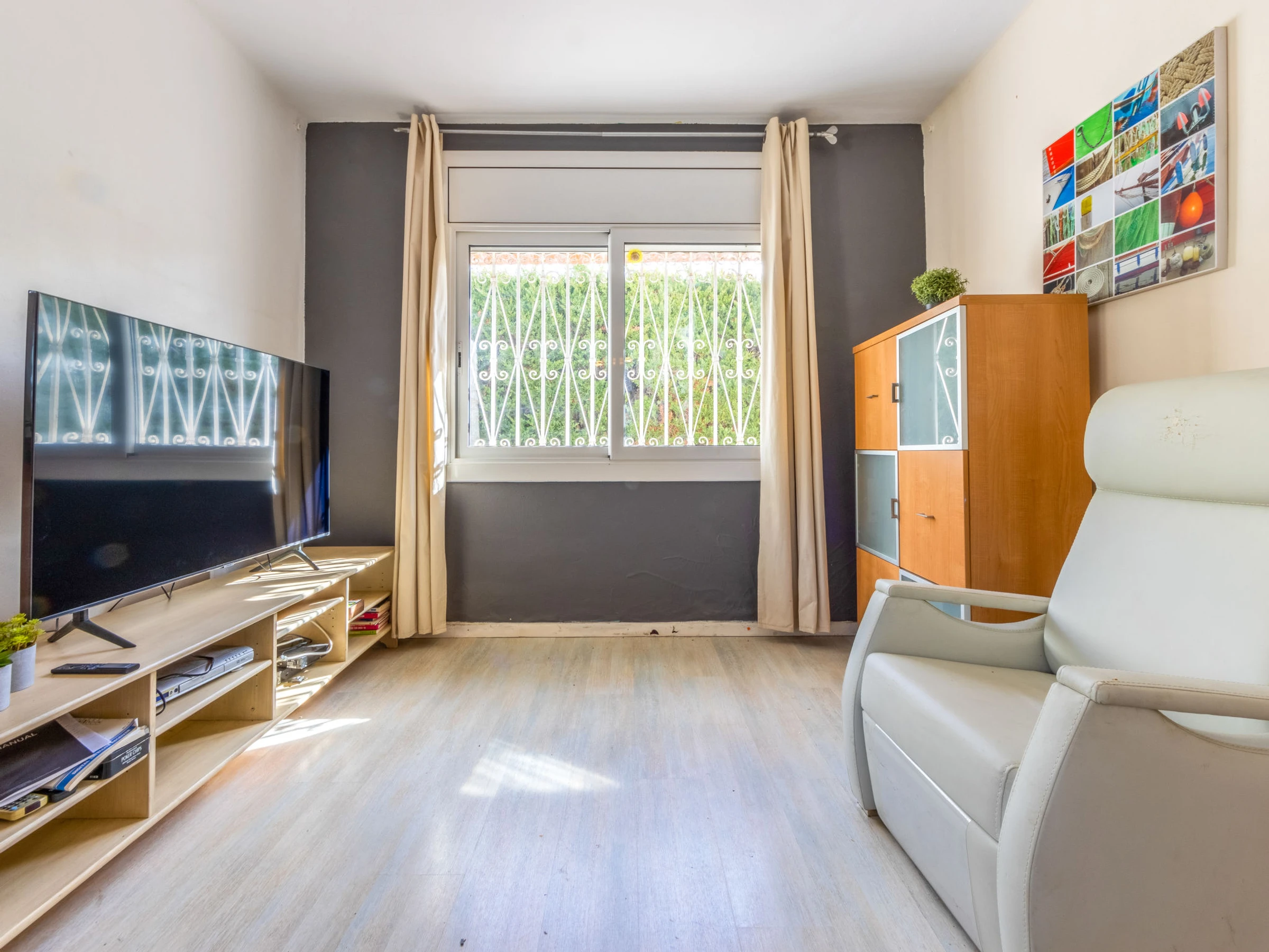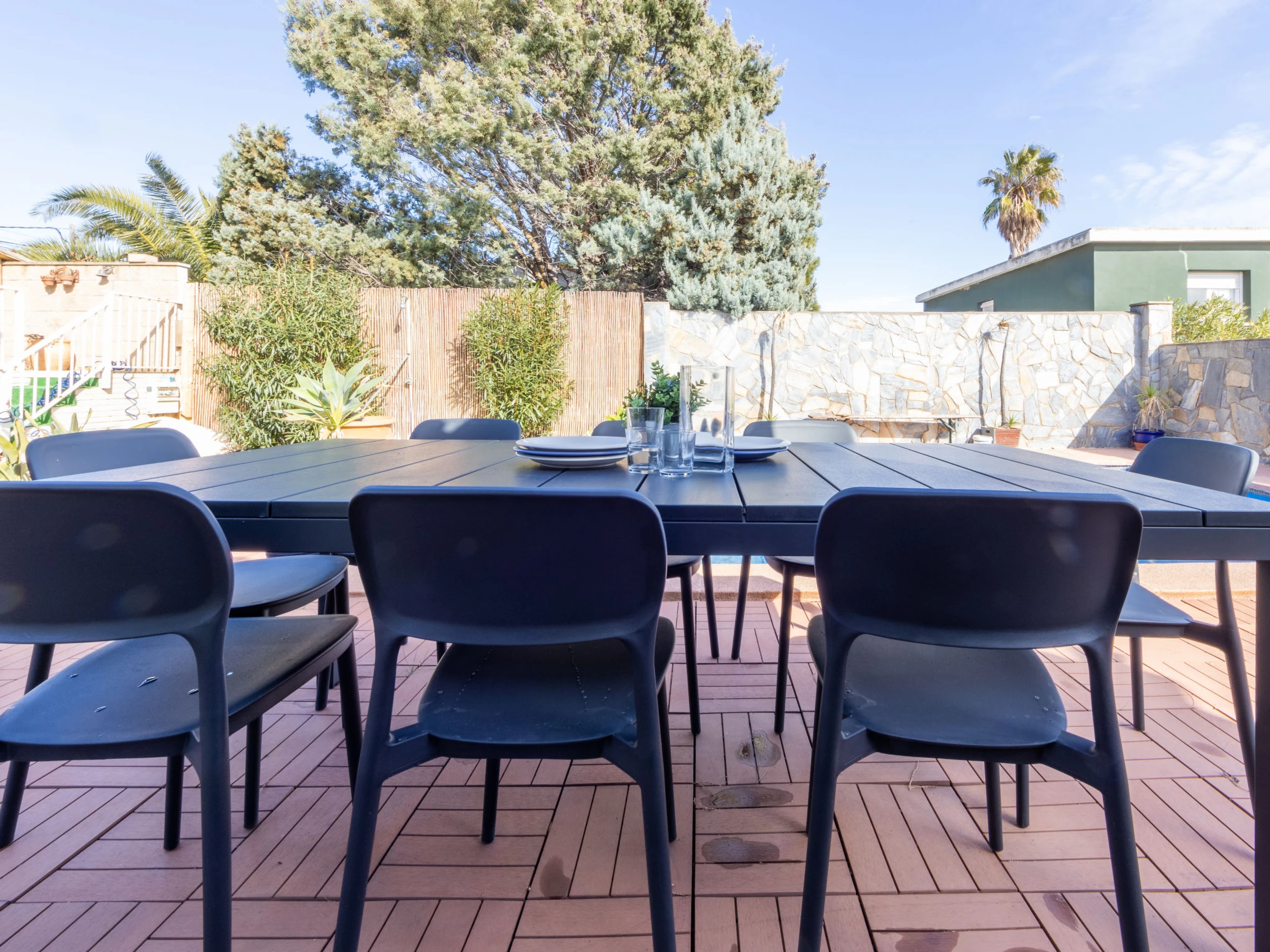 Cambrils Mediterranea: Beautiful house "Cambrils", detached. Outside the resort, 3 km from the centre of Cambrils, from the sea, 800 m from the beach, located by a road. Private: property 500 m2 (fenced), wildlife garden and flowers, swimming pool angular (7 x 4 m, depth 90 - 200 cm, seasonal availability: [hidden] - [hidden] Arbour, garden furniture, barbecue. Stepped path (6 steps) to the house. Public parking on the road. Shop 1 km, bar 1 km, bus stop 300 m, railway station 3 km. Golf course (18 hole) 4 km. Nearby attractions: Parque temático PORTAVENTURA 8 km, Parque aquático AQUOPOLIS 10 km, Spa AQUUM 10 km, Karting 7 km, Paintball 10 km. Groups of teenagers on request only.