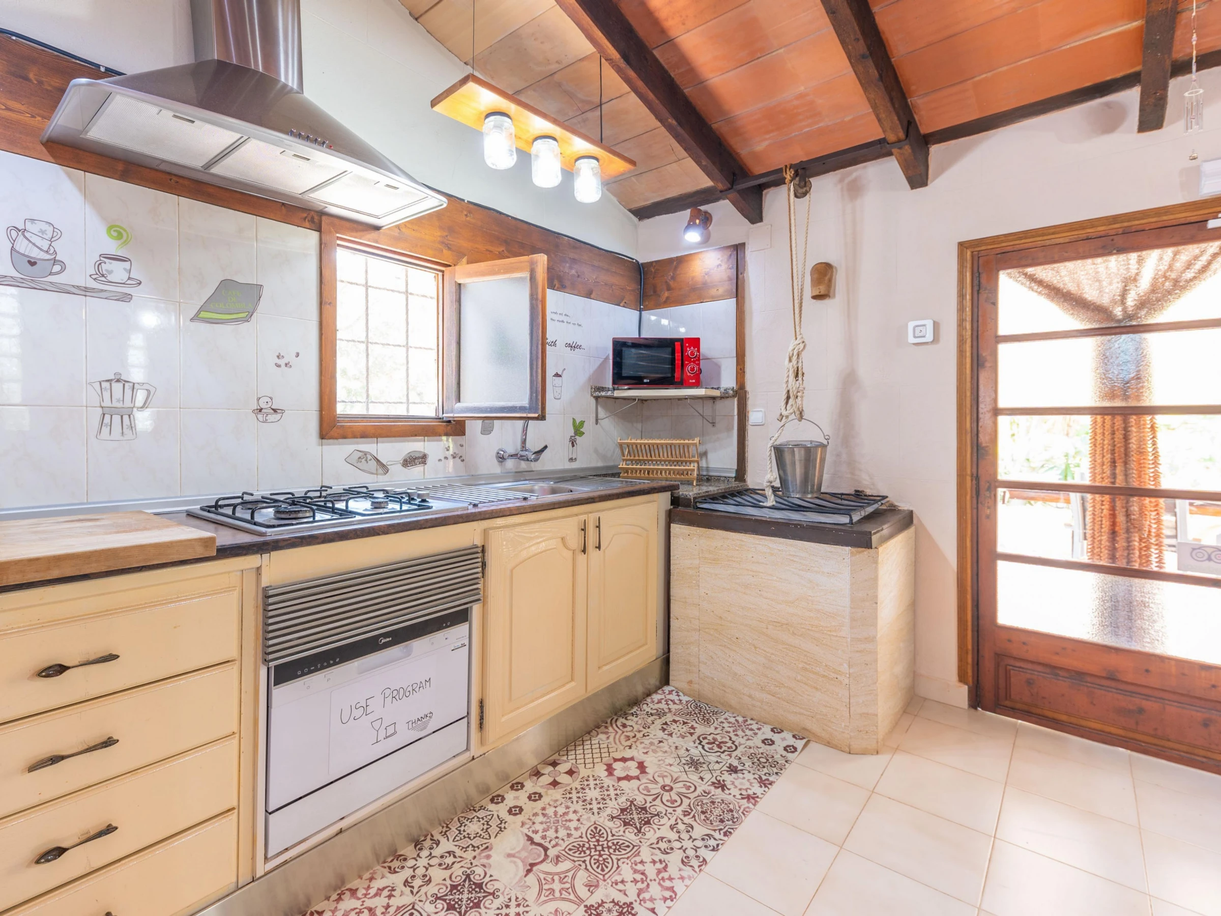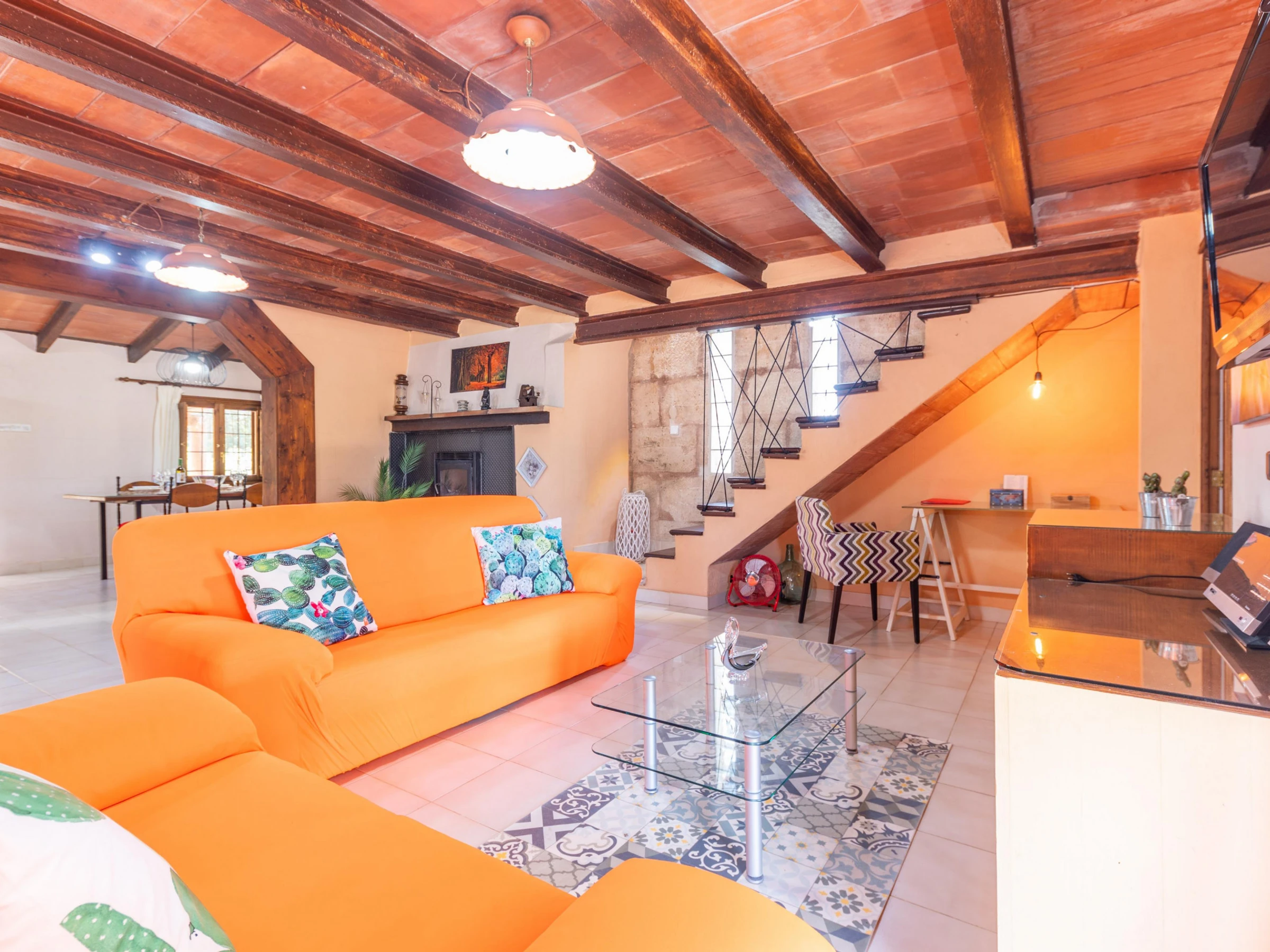 Entering the rustic interior of the house distributed over 3 floors, it offers a spacious living room with two sofas ideal for enjoying a movie night with all the guests thanks to the Smart TV. The gas cooker is fully equipped with all the necessary utensils to cook comfortably during your stay. The kitchen space also has a dining table with 4 chairs to enjoy delicious meals with all the guests. To complete this ground floor, there is a complete bathroom equipped with a shower. Going up to the first floor, you will find the 2 bedrooms of the house, one with a double bed and the other with two single beds. To serve this floor, there is a second bathroom which is divided into two floors: downstairs you will find the washbasin and the toilet, and going upstairs, you will find the bathtub. Finally, the house has a washing machine, iron and a cot and high chair if you are travelling with a baby.