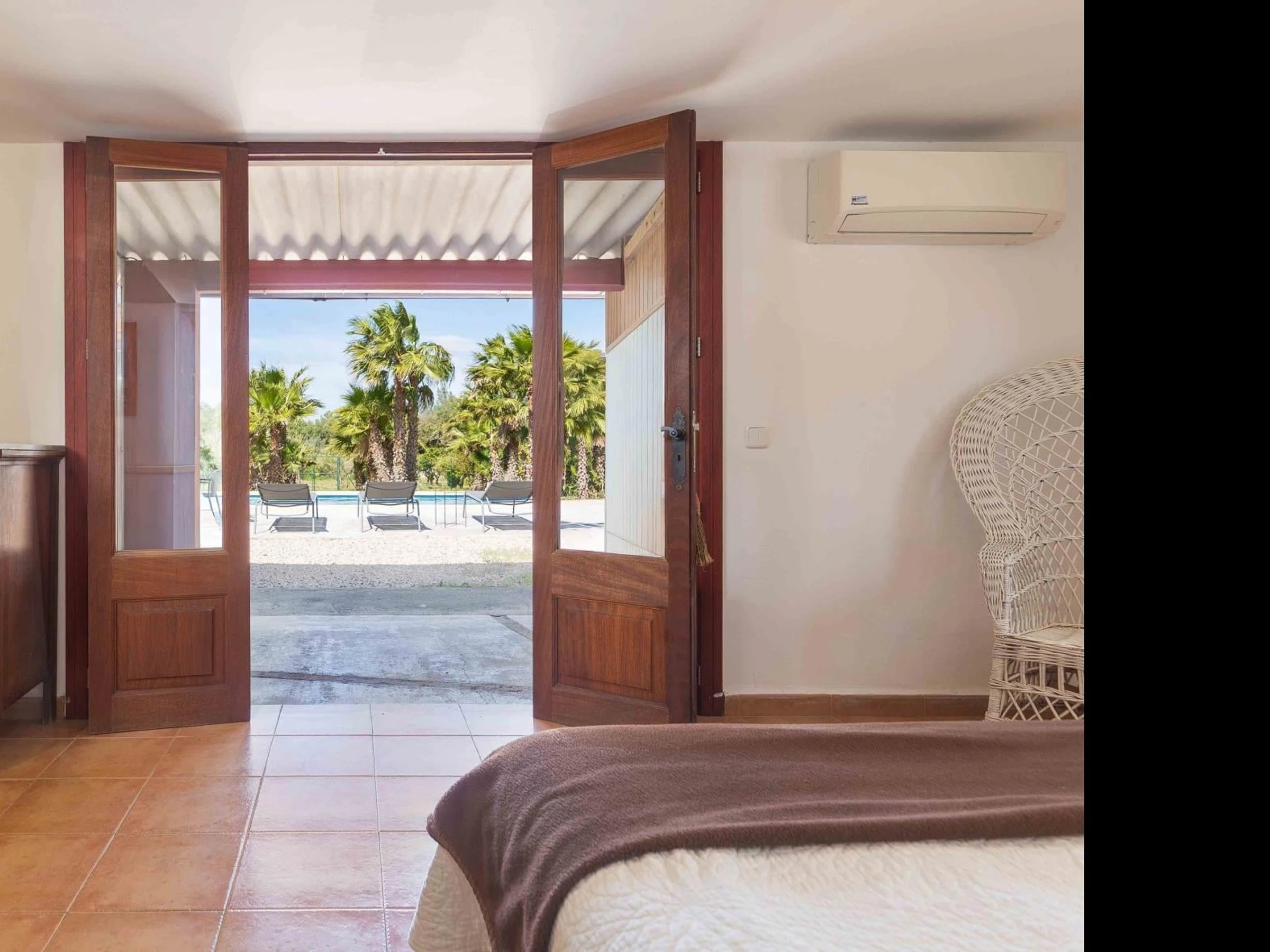 The house offers two double bedrooms, both with air conditioning and wardrobes, and one with direct access to the garden. The bathroom has a shower. For those traveling with a baby, a crib and highchair can be provided. The house also has a washing machine, iron, ironing board, and fans.