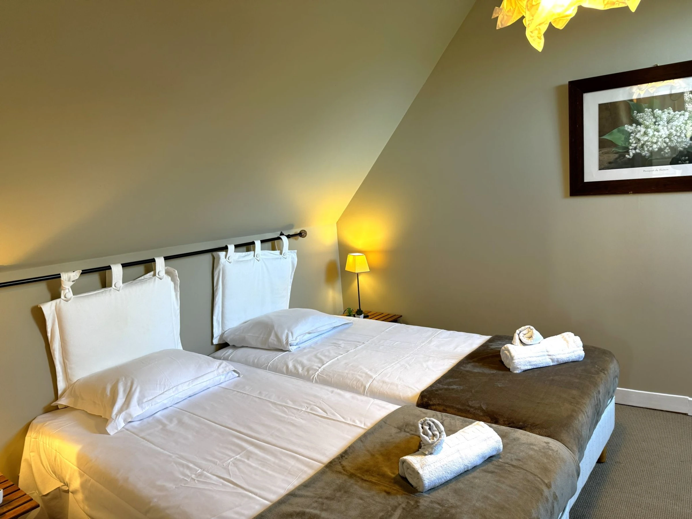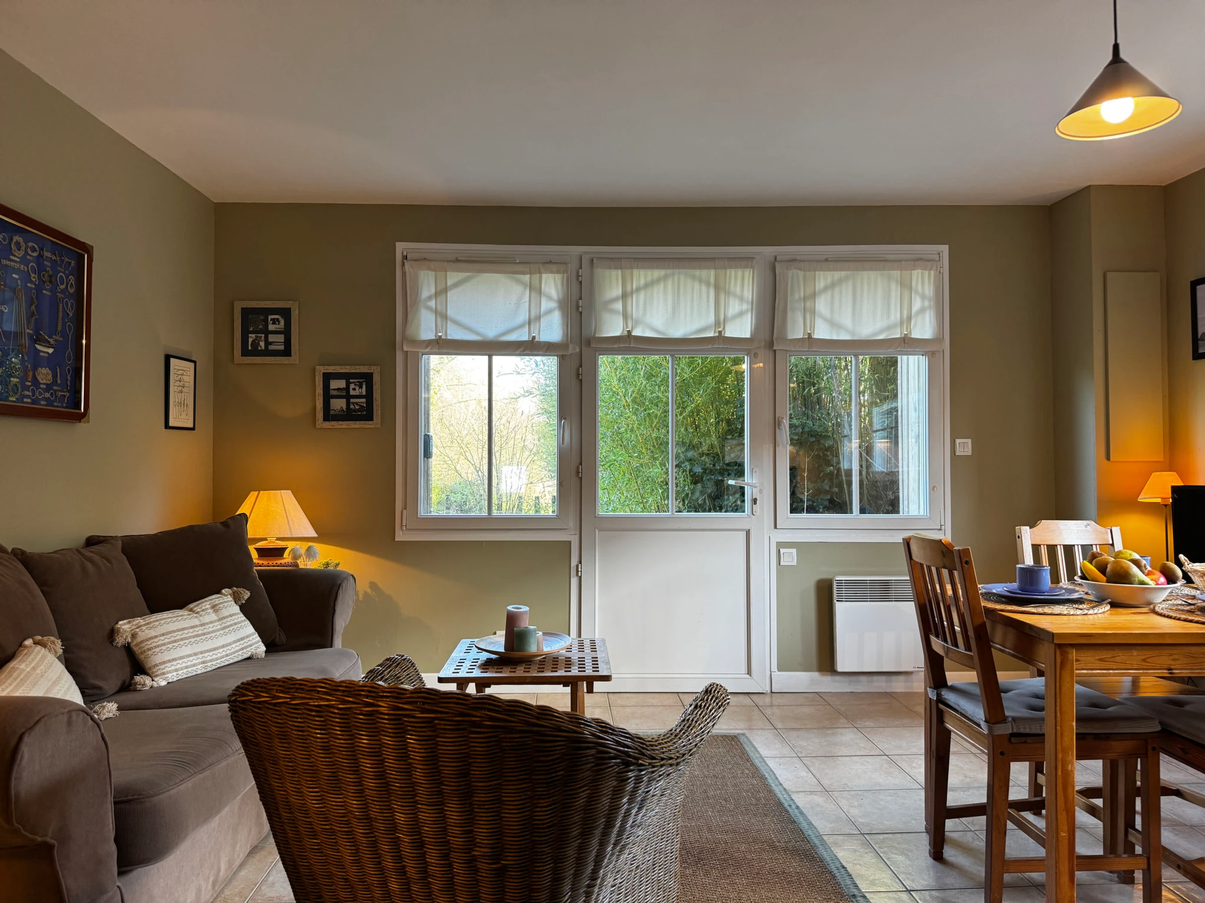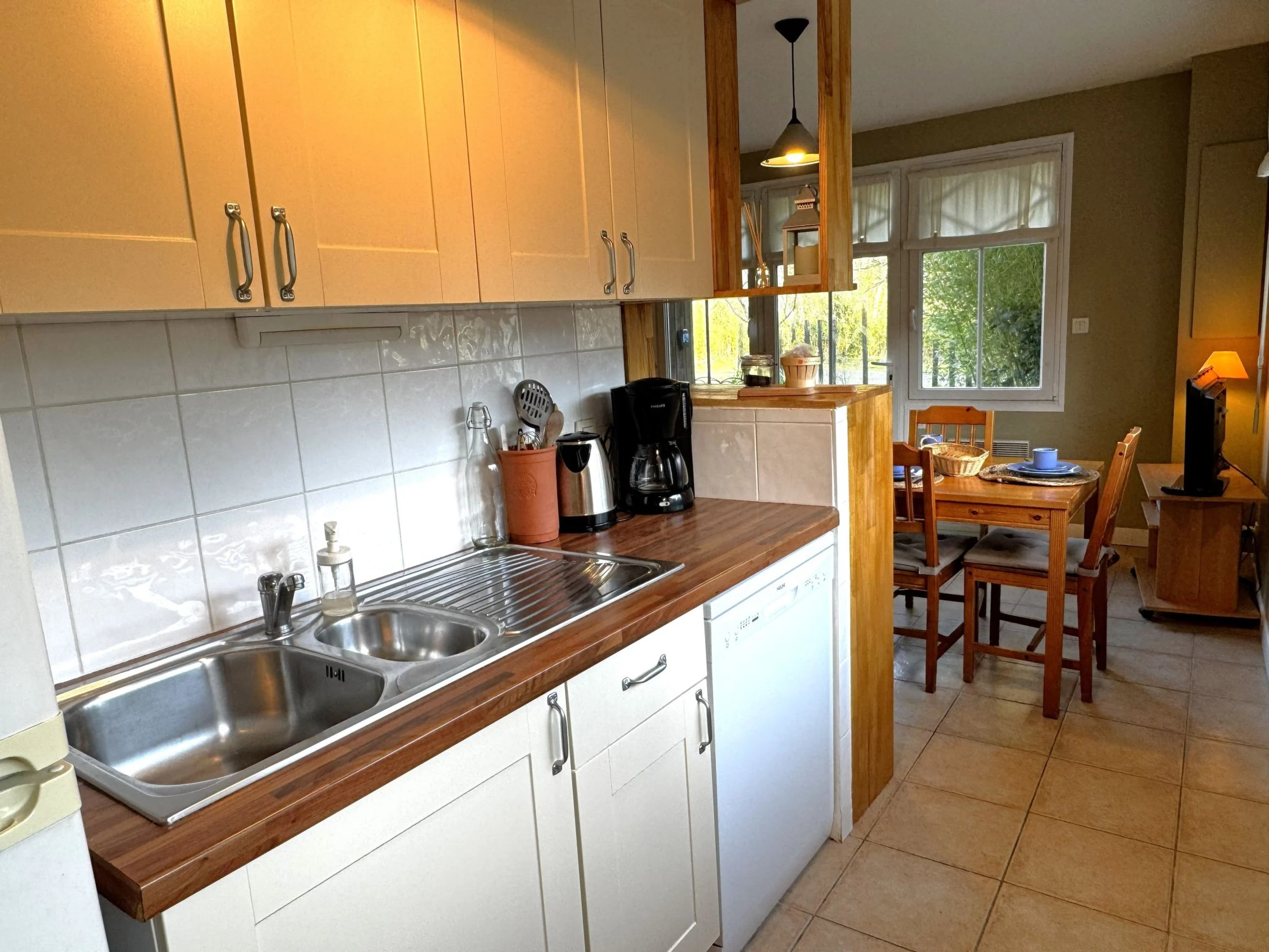 "Gîte La Cormorandière", 3-room apartment 60 m2 on 2 levels. Comfortable and beautiful furnishings: large living/dining room with dining table and TV (flat screen). Exit to the garden, to the terrace. Open kitchen (oven, dishwasher, 3 ceramic glass hob hotplates, toaster, kettle, microwave, freezer, electric coffee machine). Sep. WC. Upper floor: 1 room with 1 french bed (1 x 140 cm, length 190 cm). 1 room with 2 beds. Shower/WC. Electric heating. Terrace 14 m2. Terrace furniture. Facilities: iron, children's high chair, baby cot for up to 2 year olds, hair dryer. Internet (WiFi, free). Parking. Offer by a private individual according to Art. 155, IV of CGI.