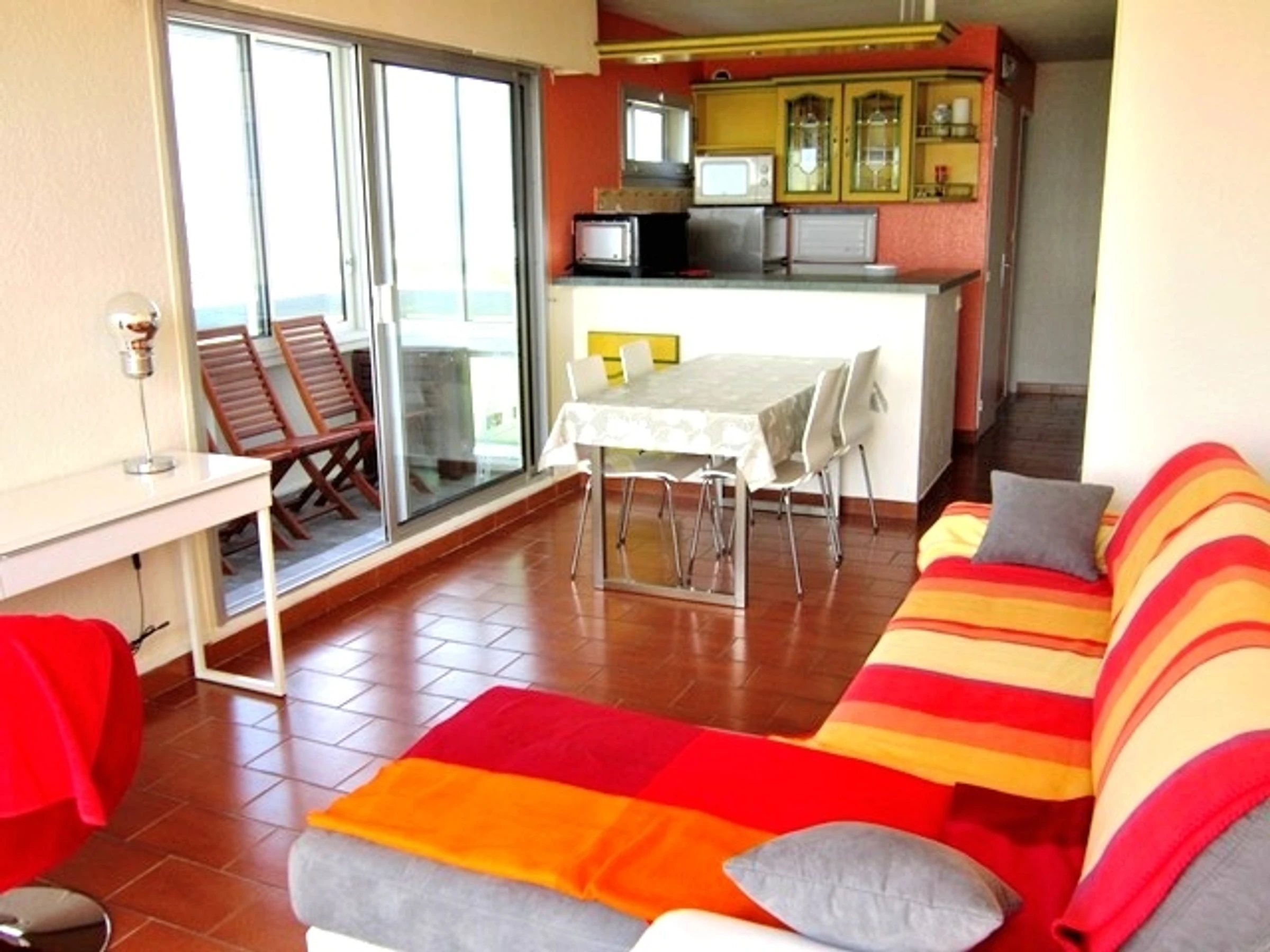 Beautiful bright living room (convertible corner sofa 140), on a spacious 15 m² terrace with sea view, equipped kitchen area, small loggia facing south. Beautiful bedroom (140 cm bed) access to a pretty loggia & a breathtaking view of the Canigou and the Canet pond, shower room and separate WC.