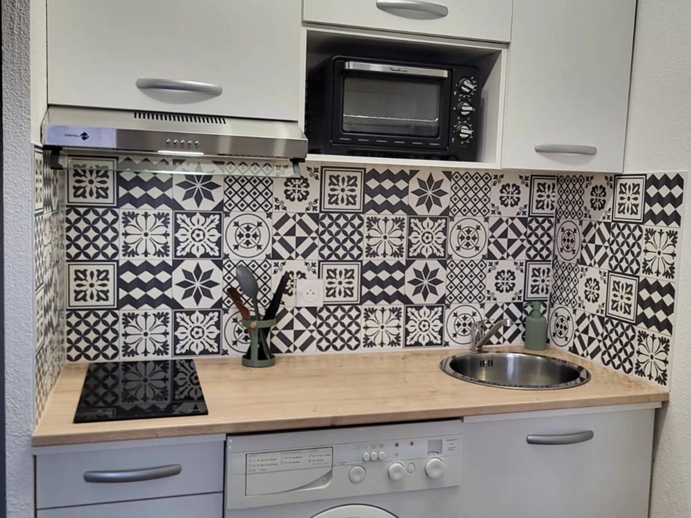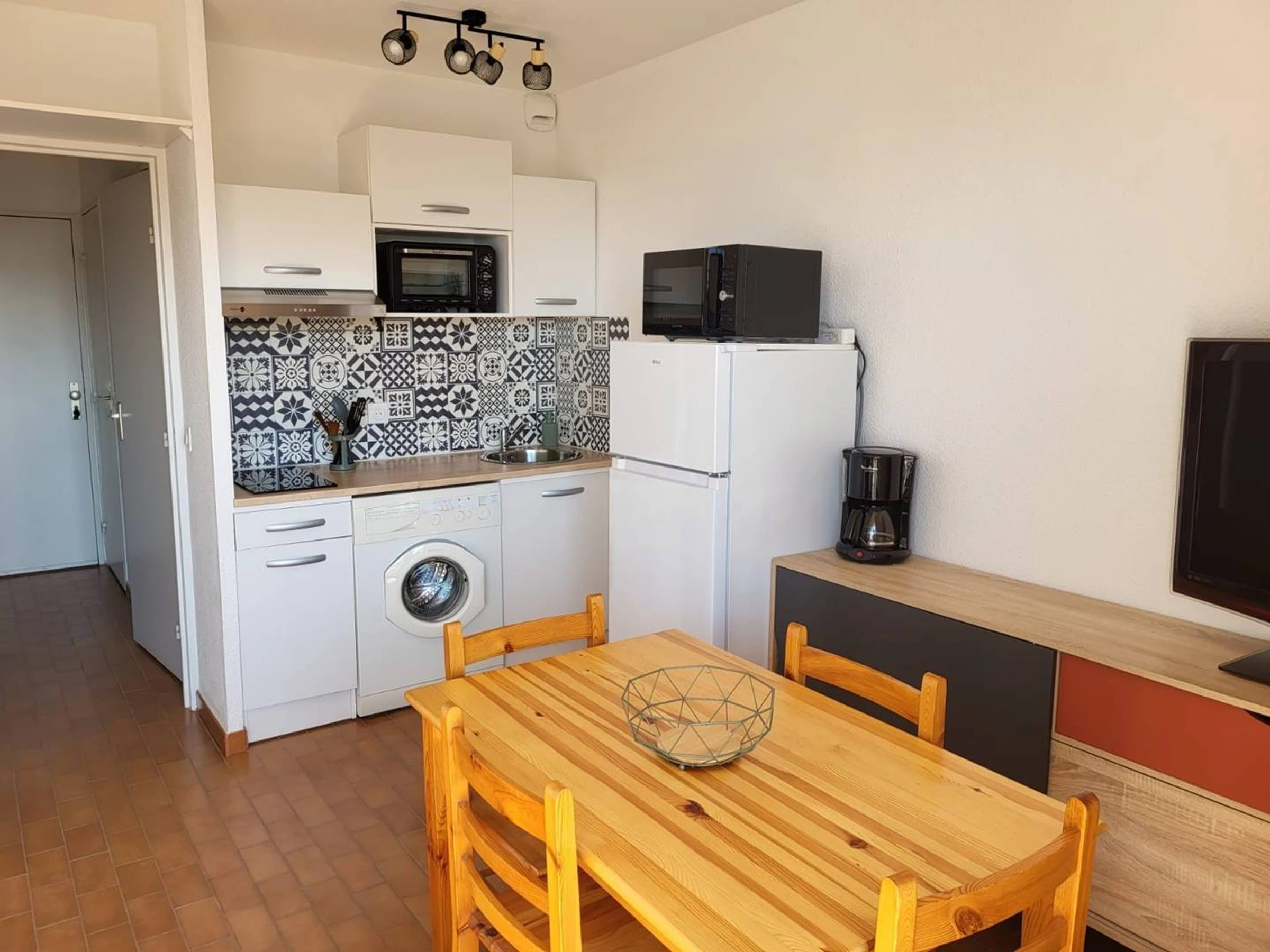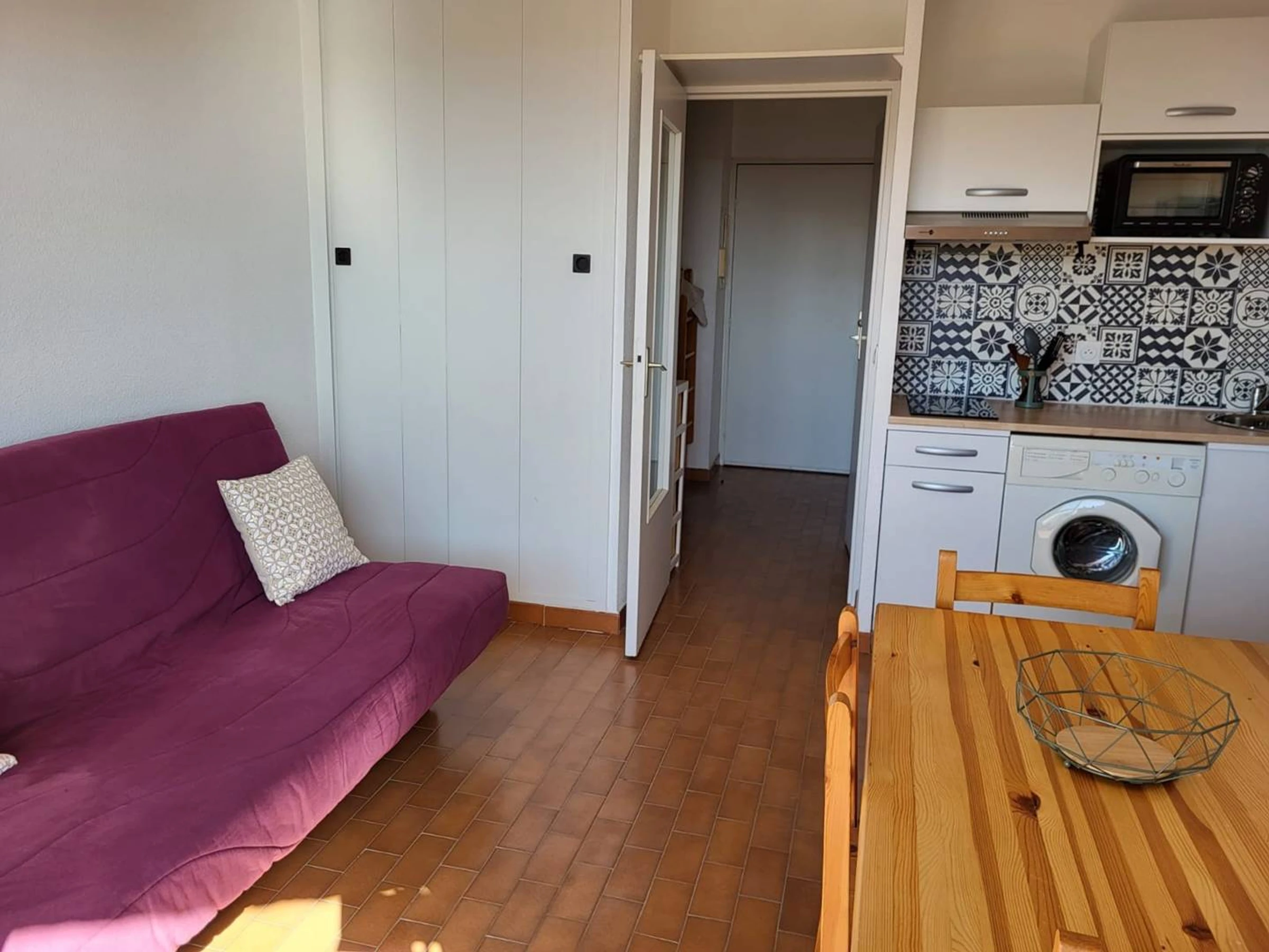 Studio cabine lumineux de 22 m², situé au 5ème étage. Aménagement agréable : cuisine ouverte et équipée avec four, machine à laver, 2 plaques de cuisson induction, hotte aspirante, frigo/congélateur, micro-ondes et nécessaire vaisselle. Espace séjour avec canapé convertible, table, chaises et TV. Une salle d’eau avec baignoire. WC séparés. Une cabine avec lits gigognes. Exposé Ouest. Équipé pour 4 personnes (idéal 2 adultes/2 enfants).Linge de maison et draps non fournis. Le ménage n'est pas inclus. Animaux non acceptés.