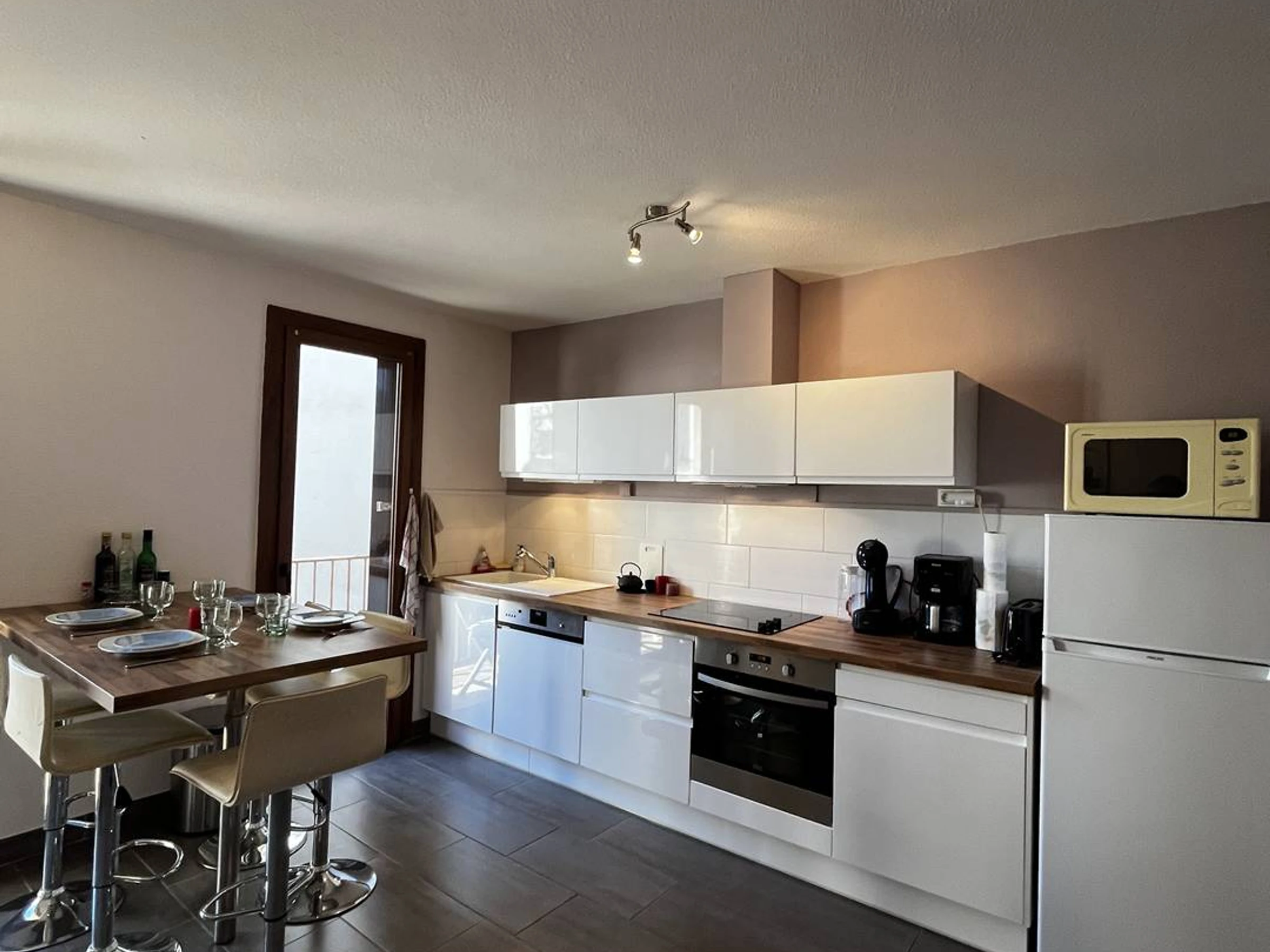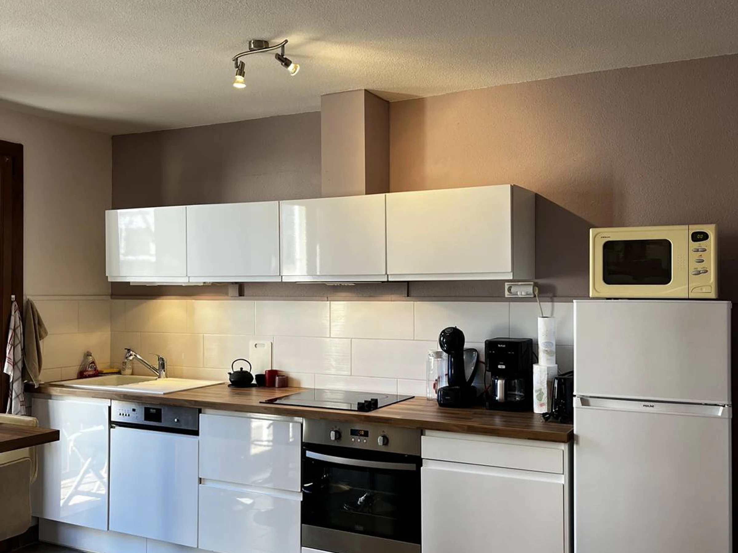 The apartment features a bright main living area with a 140x200 cm sofa bed (clic-clac), a TV, dining table, and an open-plan kitchen fully equipped with a stovetop, oven, microwave, fridge-freezer, dishwasher, Dolce Gusto and drip coffee makers, and a kettle.