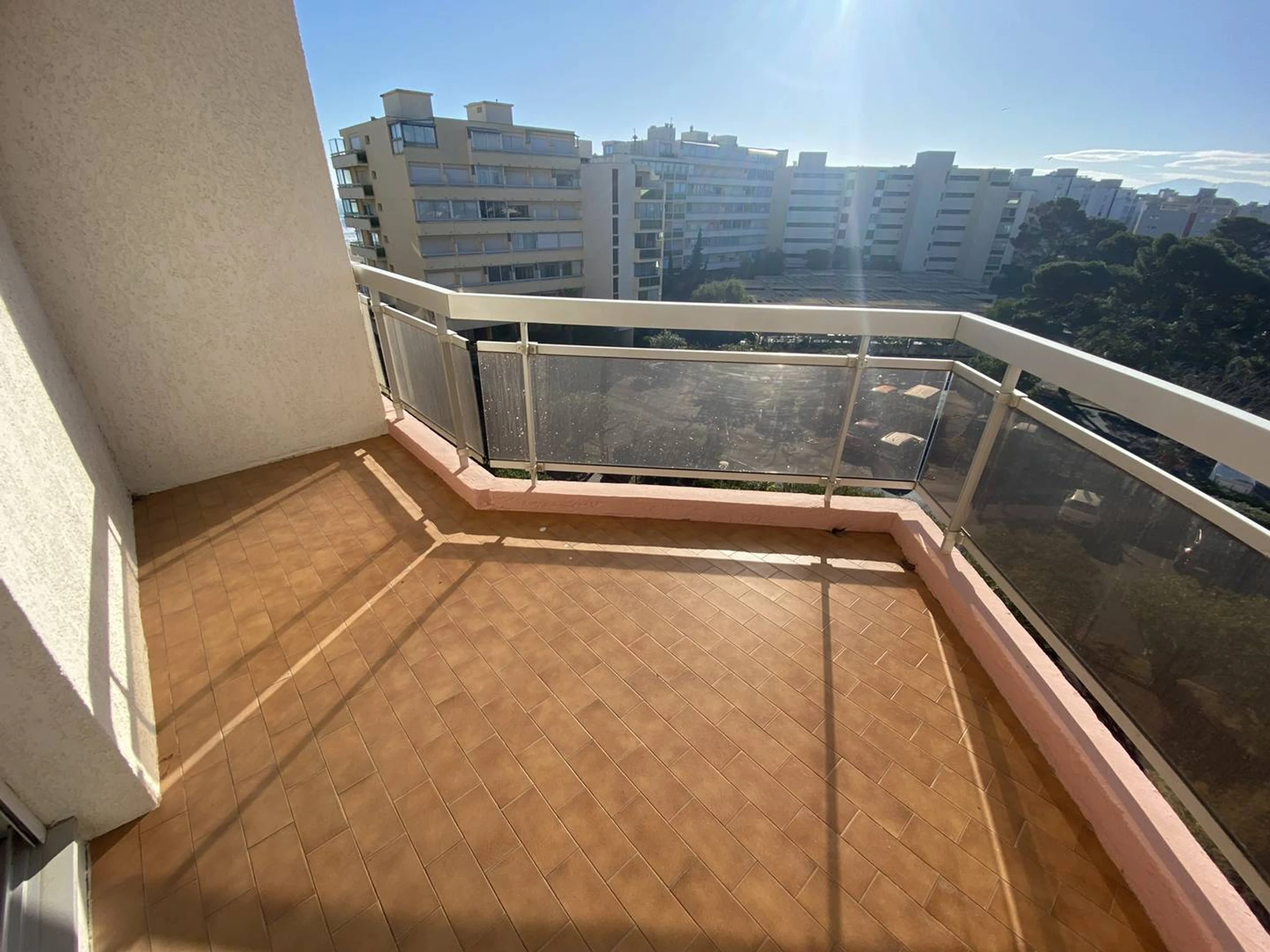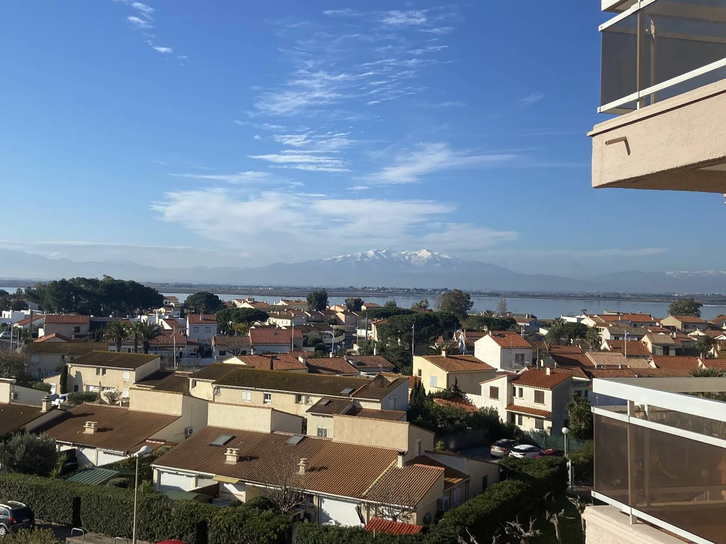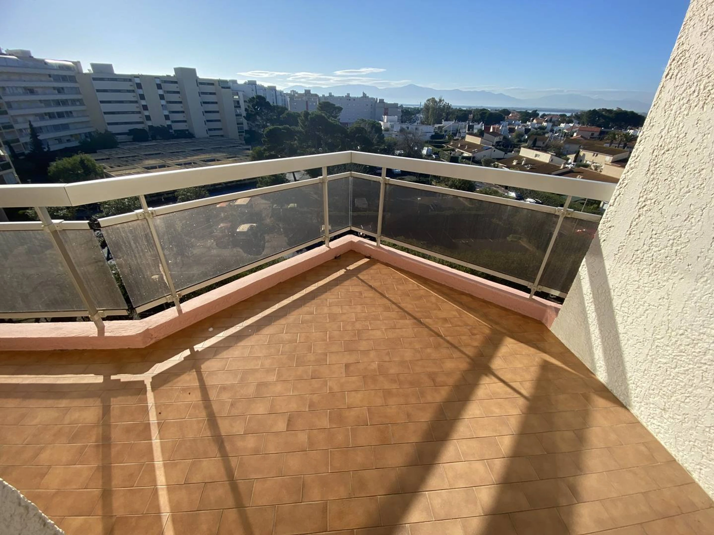 The apartment features a south-facing terrace with garden furniture and a separate loggia on the bedroom side. Enjoy side sea views, plus views of the lagoon and Canigou. Sleeping arrangements include a double bed (140 cm) and a 2-person sofa bed.