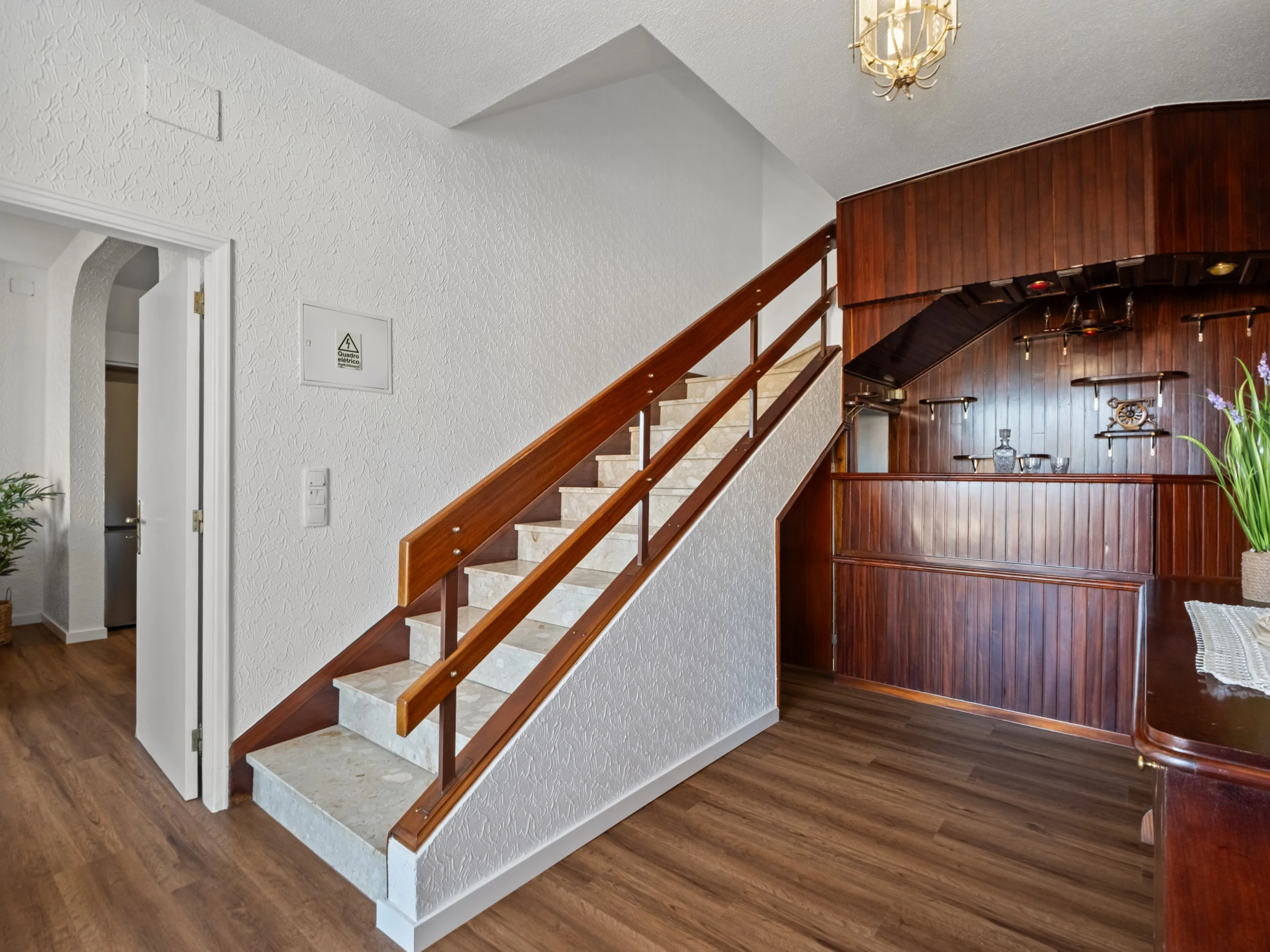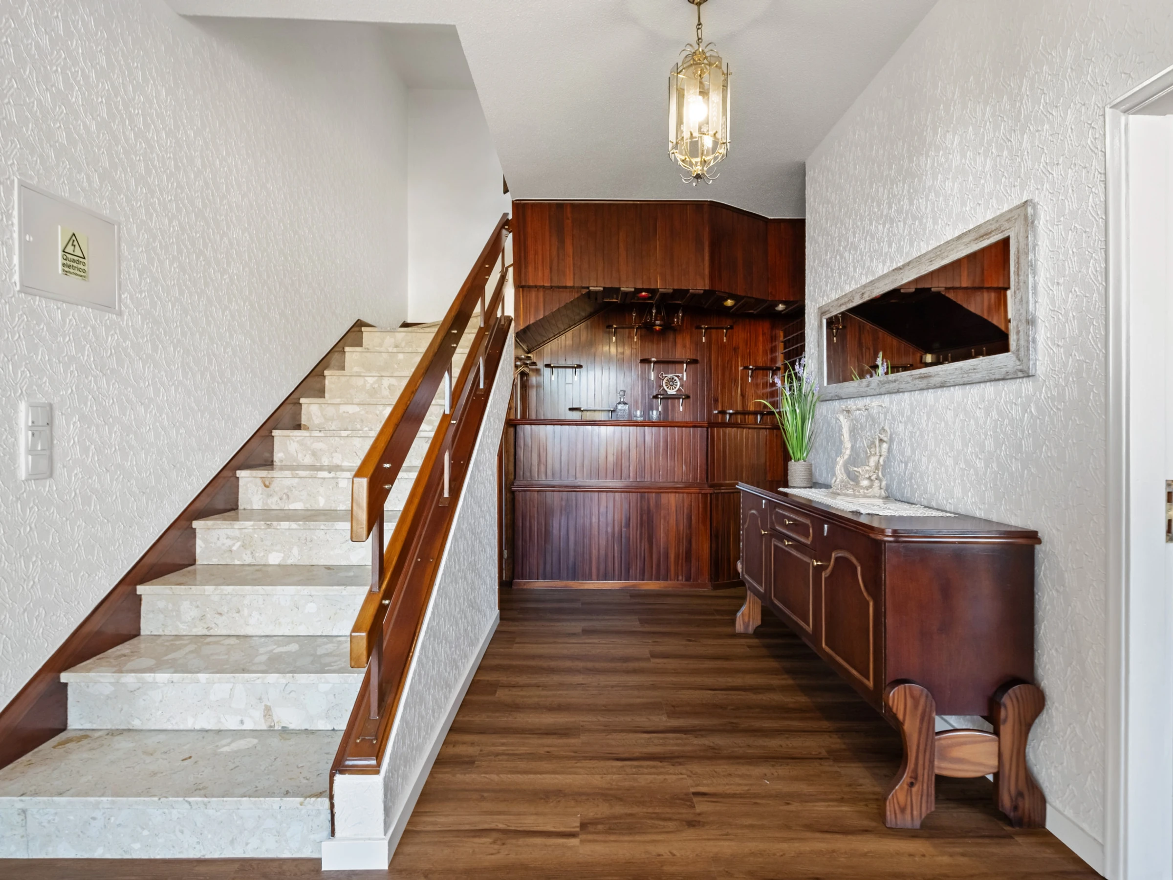 Descending to the lower floor, the villa reveals spacious and distinct spaces. One of the living rooms presents a classic and elegant style, with details that evoke an almost Renaissance-like atmosphere — perfect for more tranquil moments of socialising.