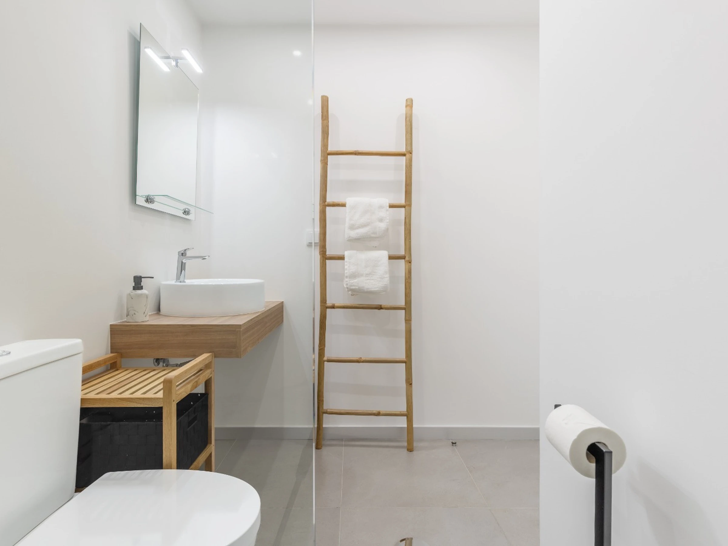 The open-space kitchen is fully equipped with all the essentials to prepare meals, including a fridge, freezer, oven, microwave, hob, dishwasher, and the necessary utensils and tableware. A washing machine and hairdryer are also available.