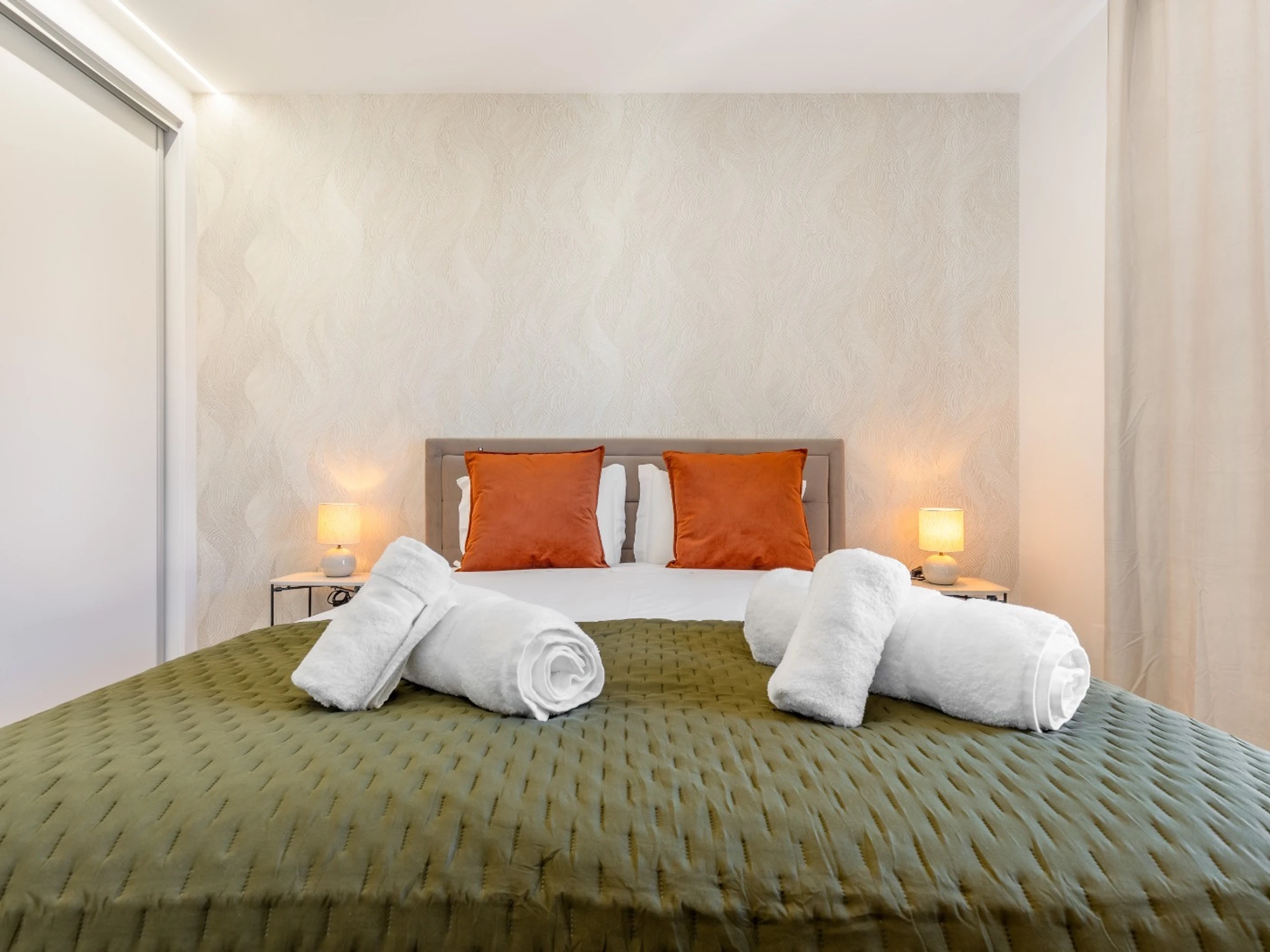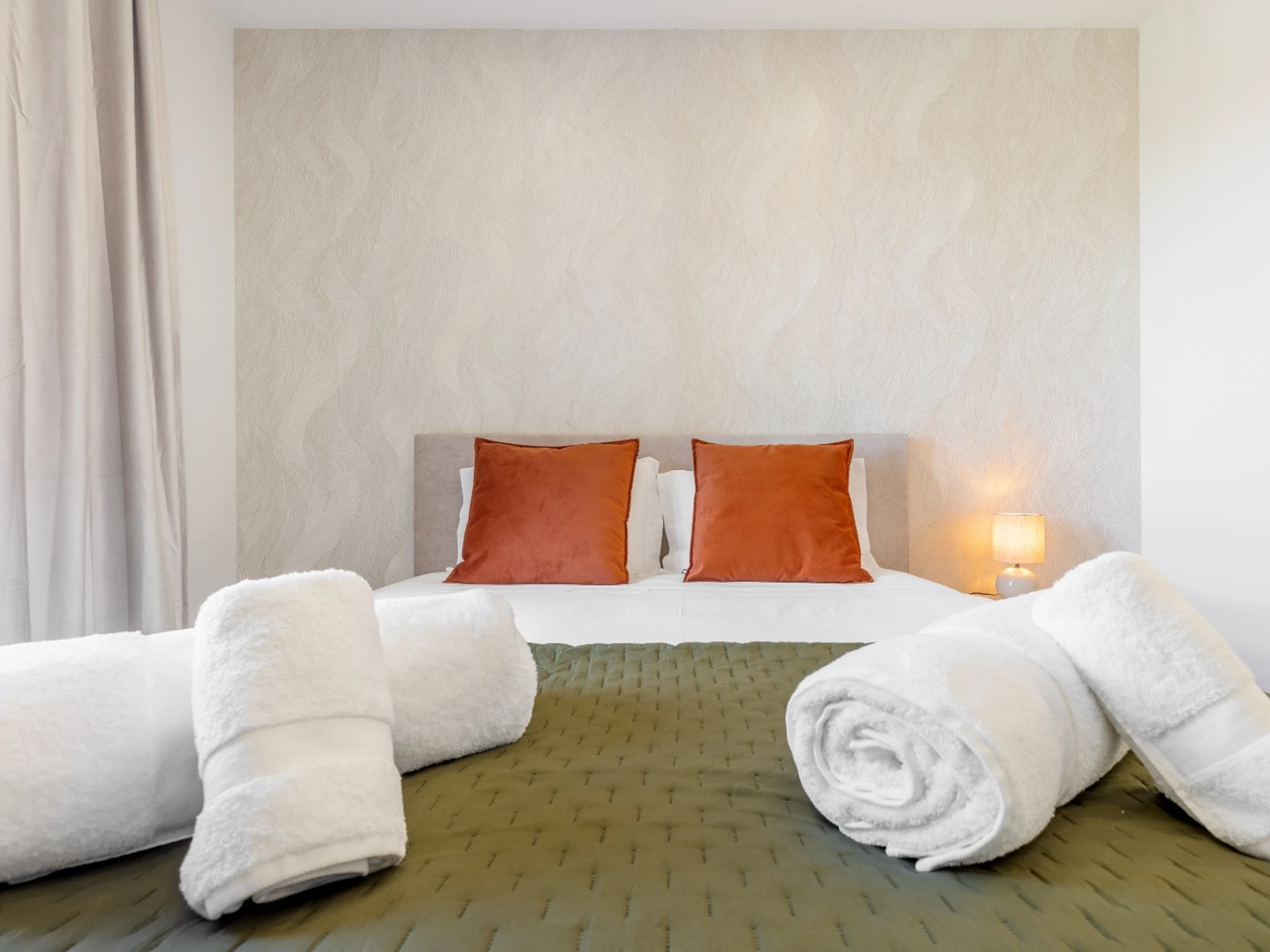 The property features two bedrooms, each furnished with a queen-size bed, ensuring restful nights. There are two bathrooms: one ensuite with a shower and another with a bathtub. Bed linen and bath towels are provided for your convenience.