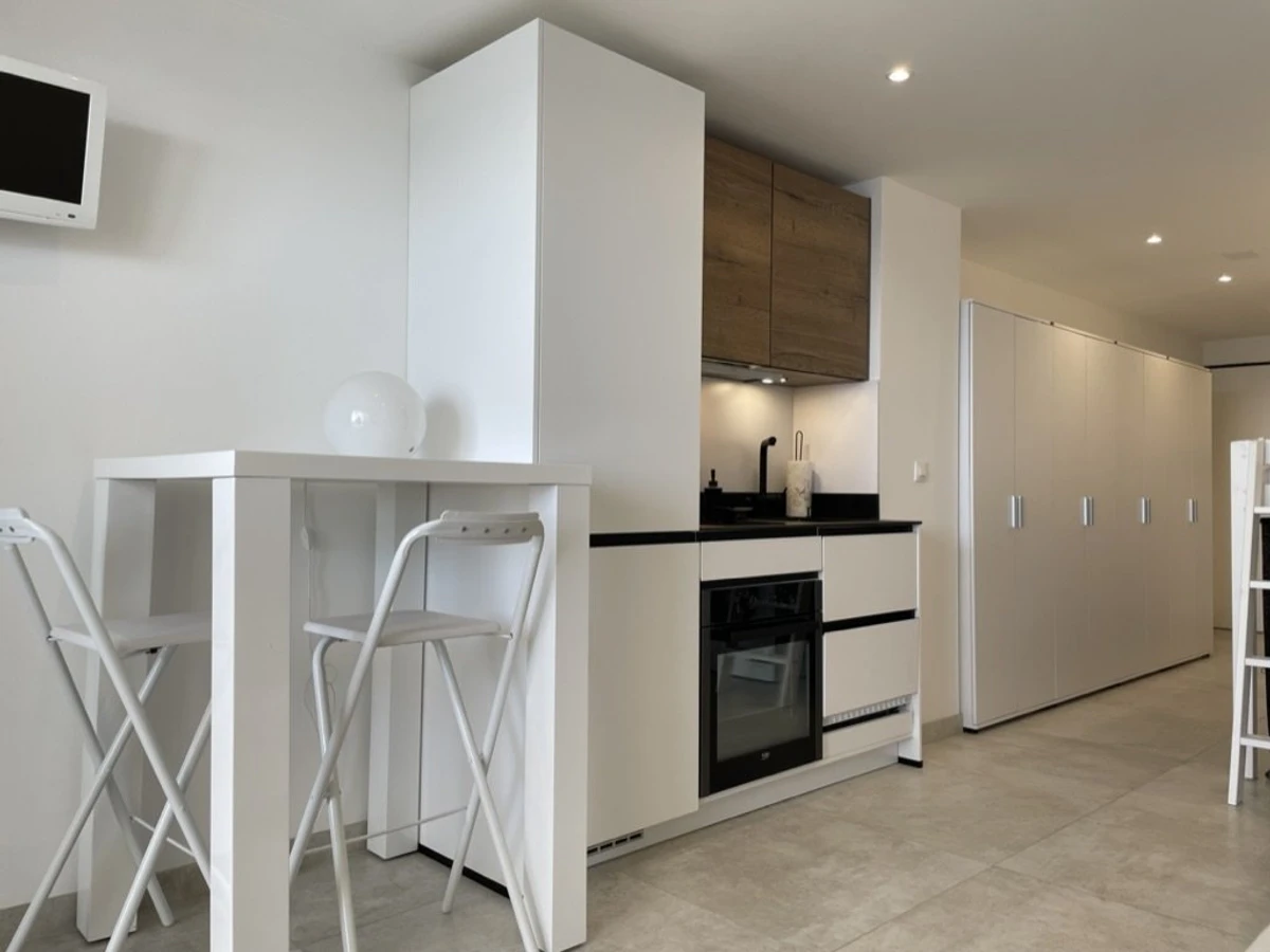 Your 7th-floor apartment includes an entrance hall with a sleeping area with a double mezzanine bed, a bathroom with a toilet, a fully equipped kitchen, a dining area, and a living room with a sofa bed opening onto a sea-view terrace.