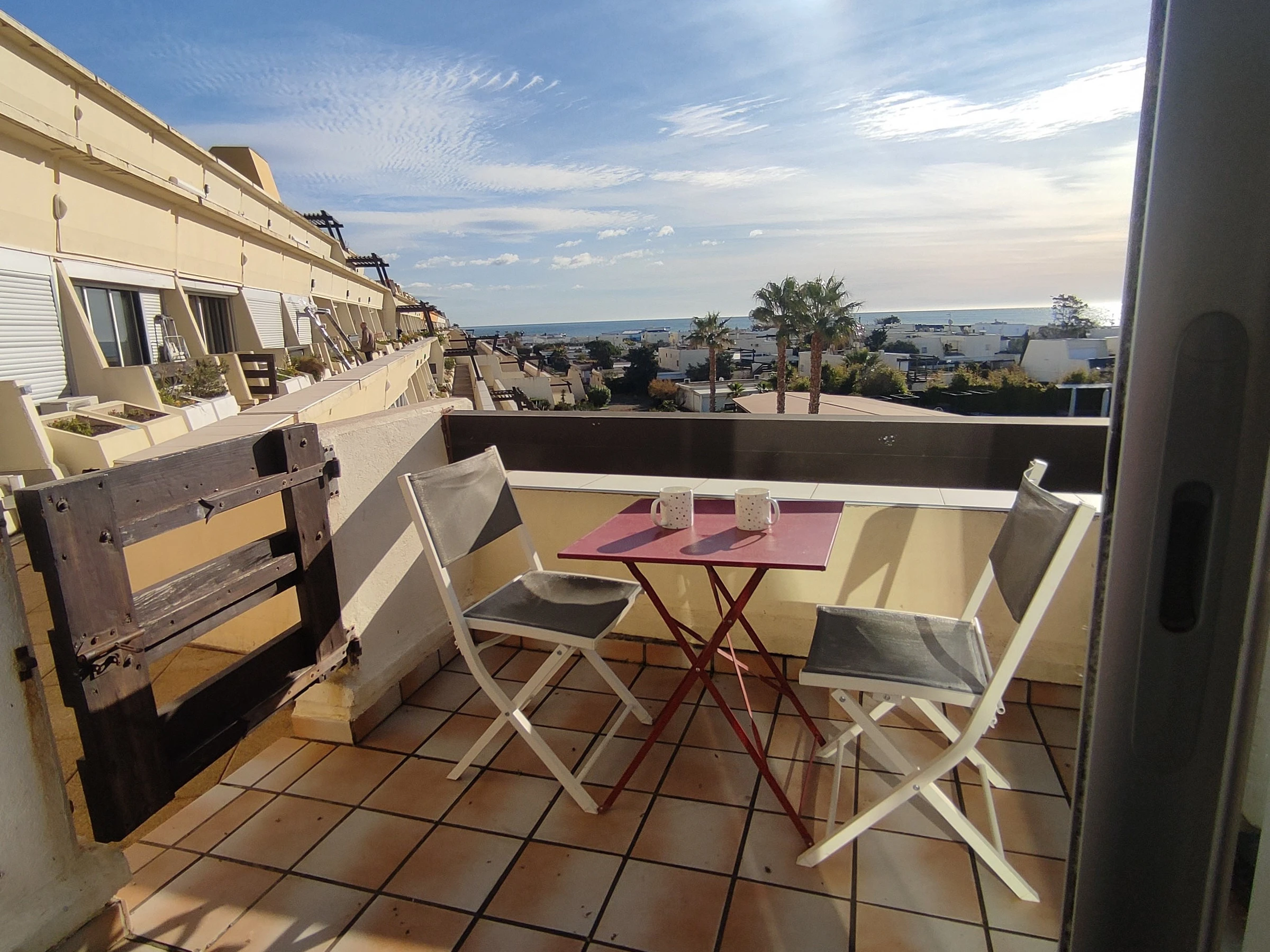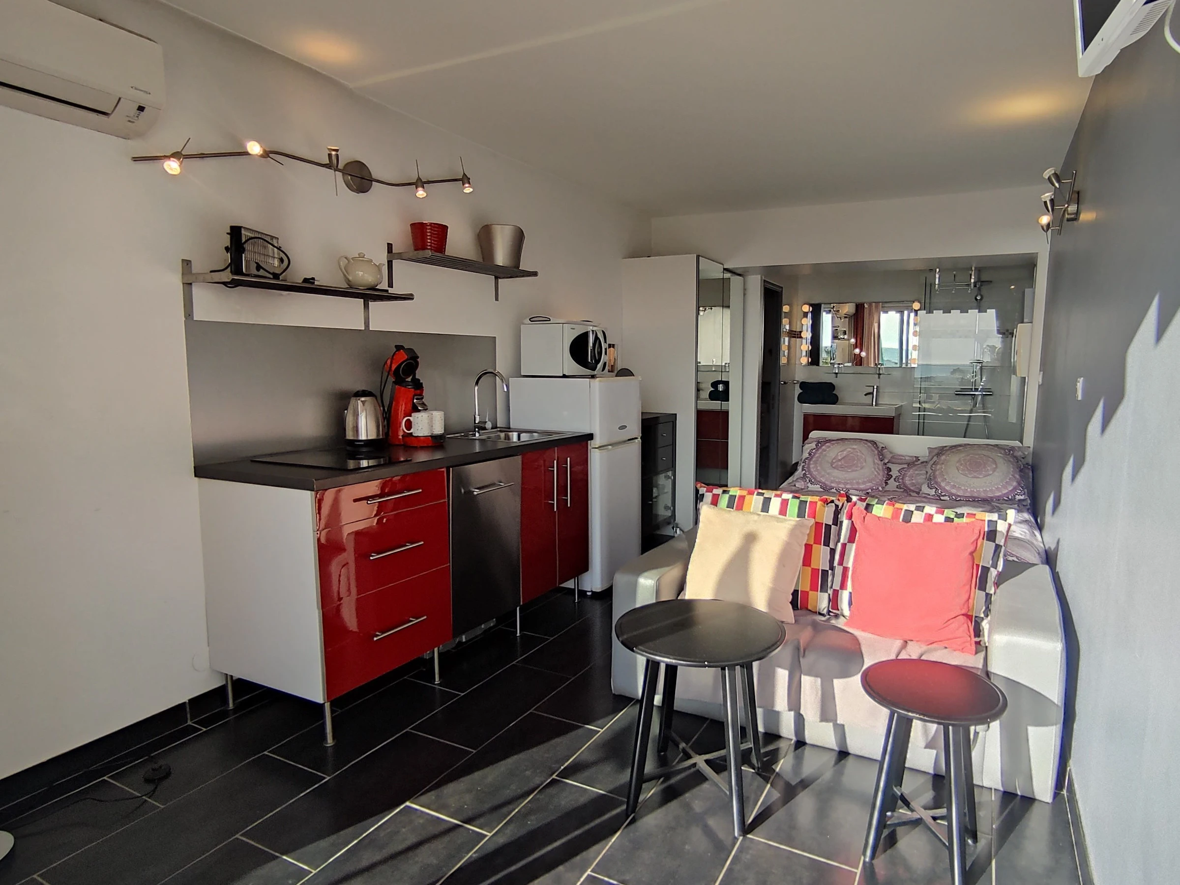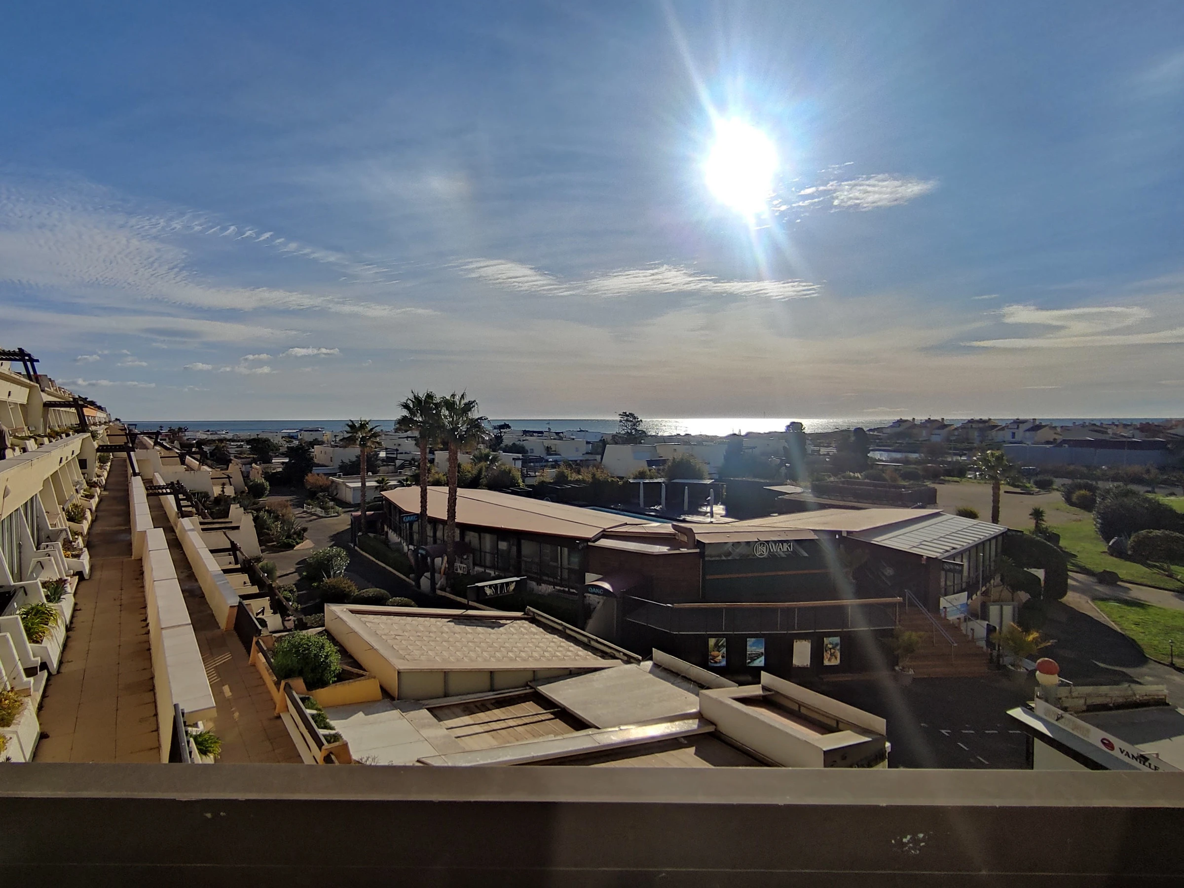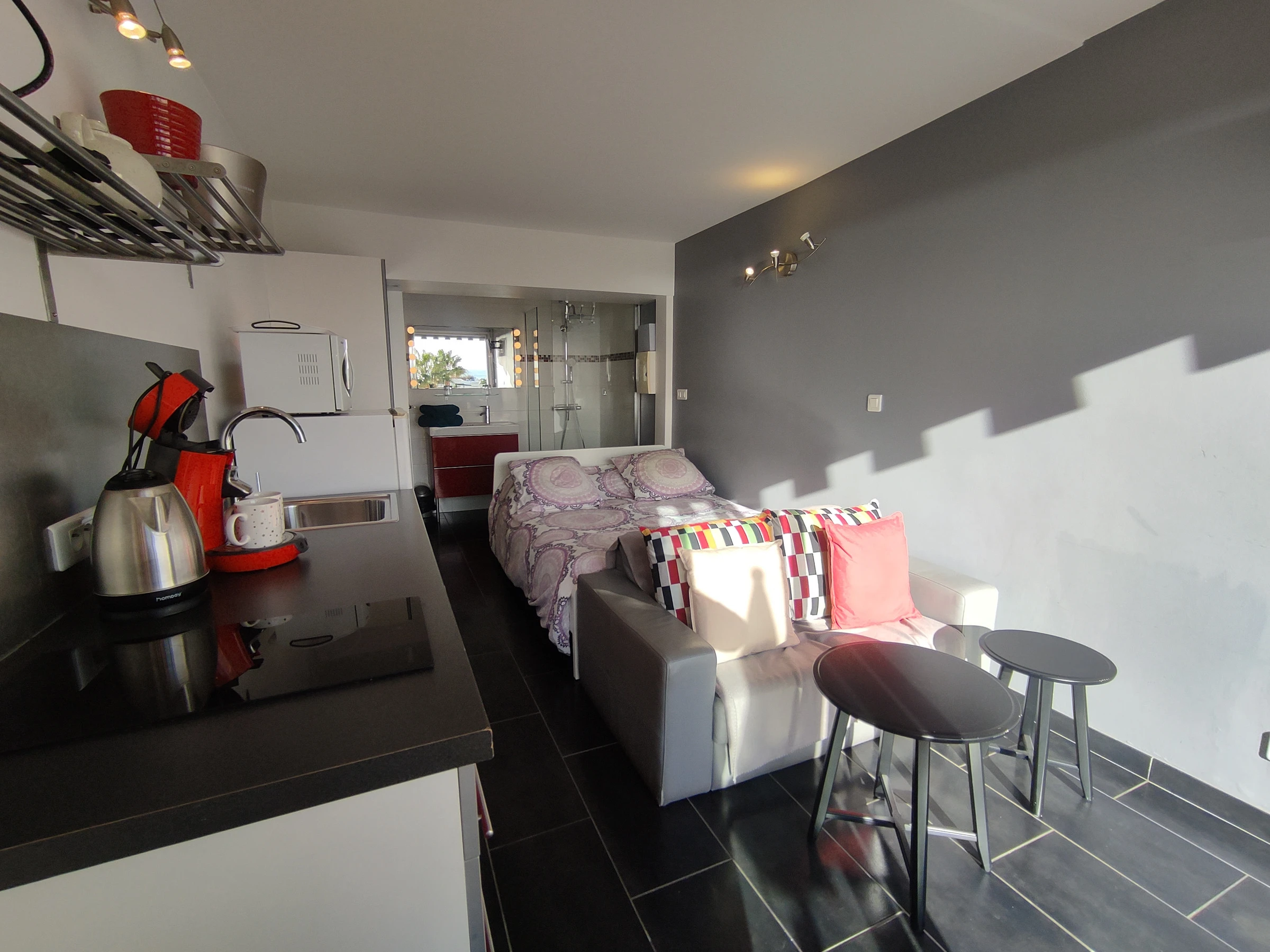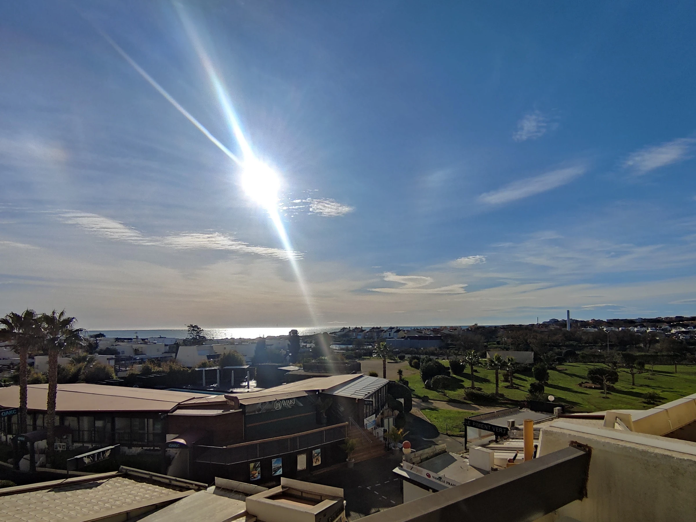 Air-conditioned studio for 2 people, located at Port Nature colline 5, on the 3rd floor with lift. Living room with double bed 140 cm. Equipped kitchen area with : dishwasher, microwave and coffee maker. Shower room area open to the living room. Separate toilets. Terrace with pool and sea view. Parking space n°5621.