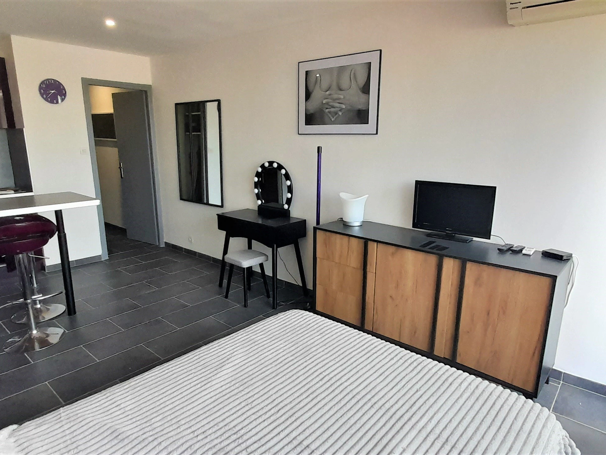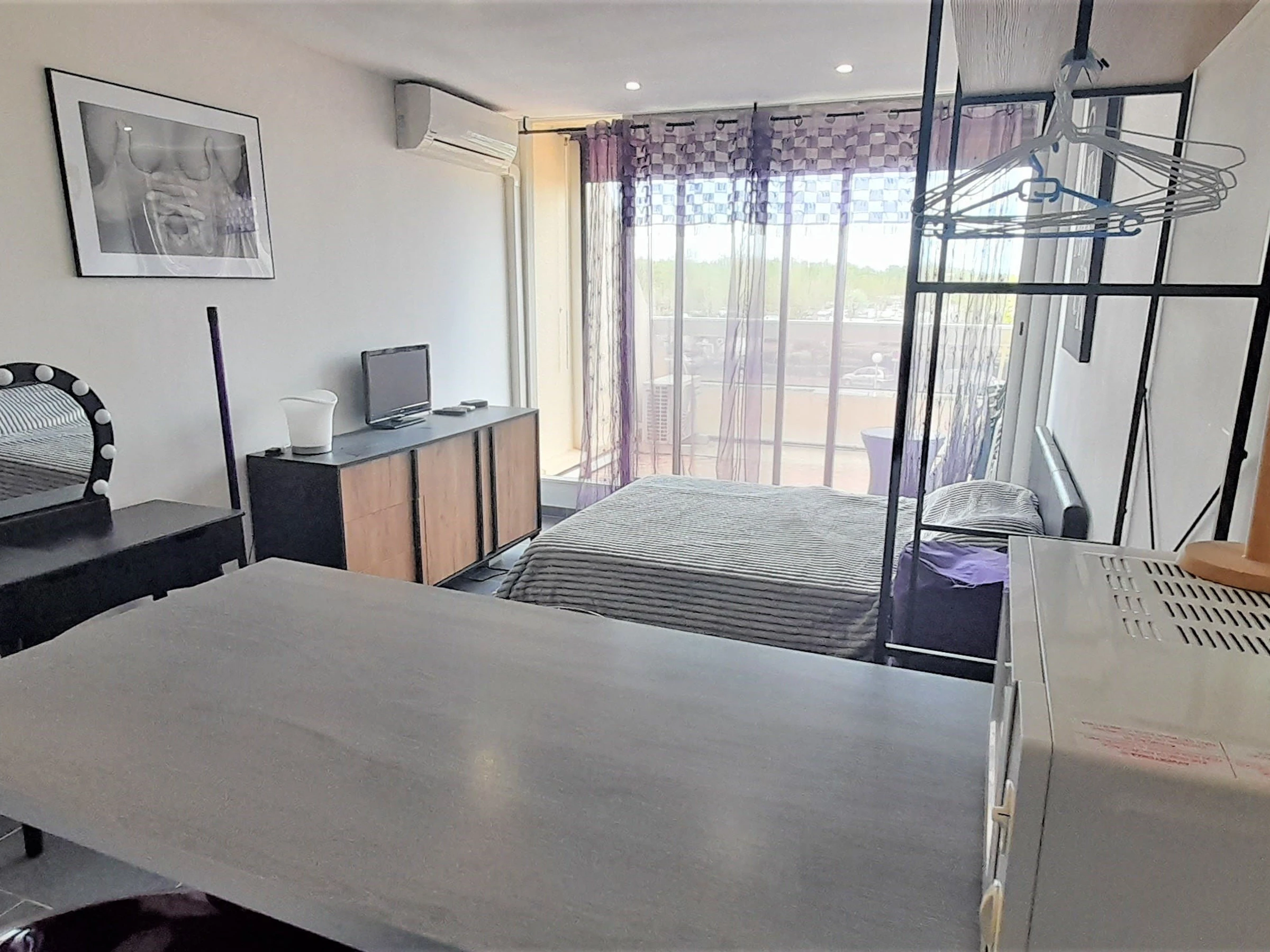 Air conditioned studio for 2 people, situated in Heliopolis entrance L. 2nd floor with lift, Sea and camping side. Living room with 140cm bed. Kitchen area with microwave, iron... Bathroom with WC and hair dryer. North-east facing terrace. Parking n°338.