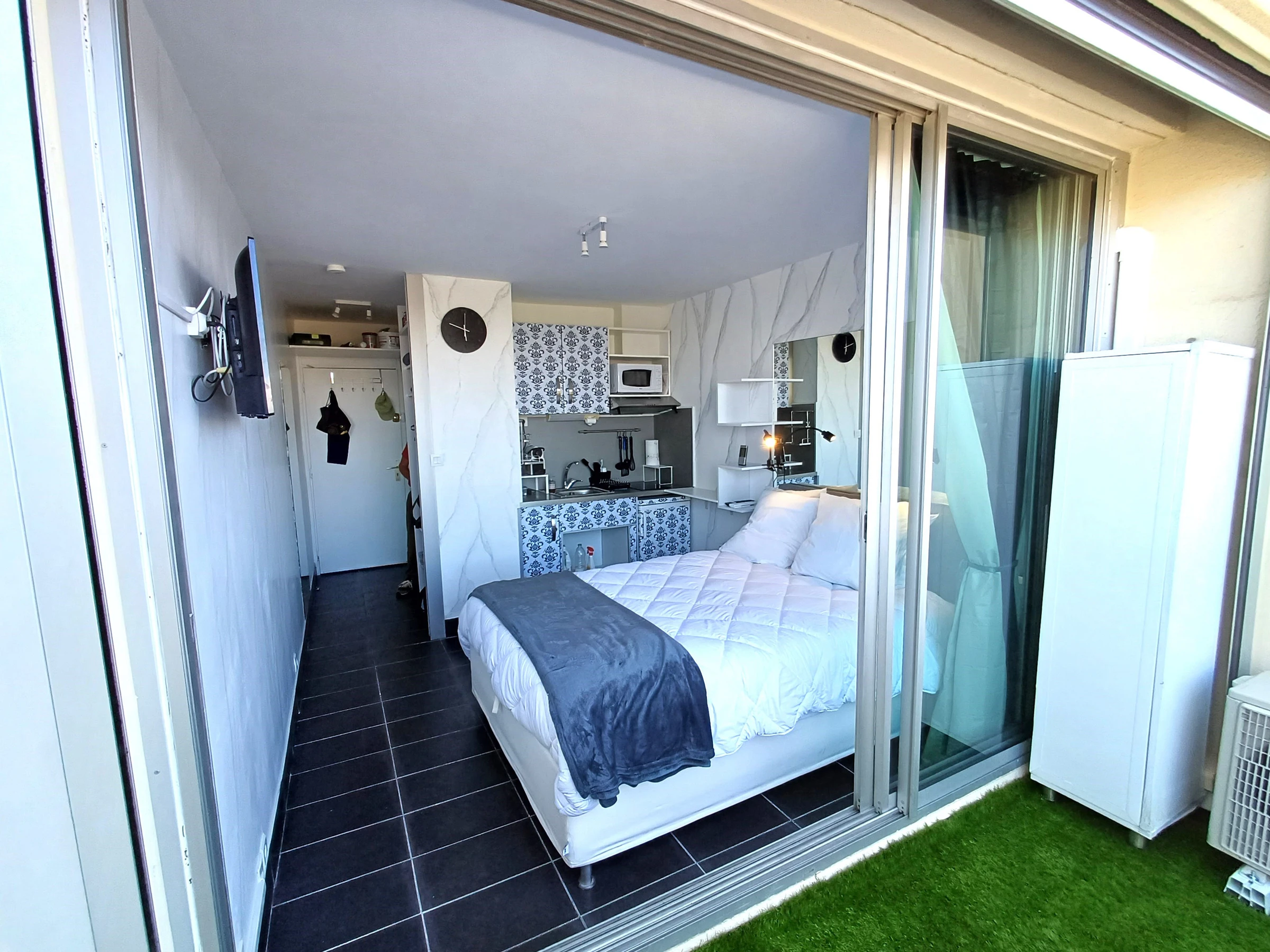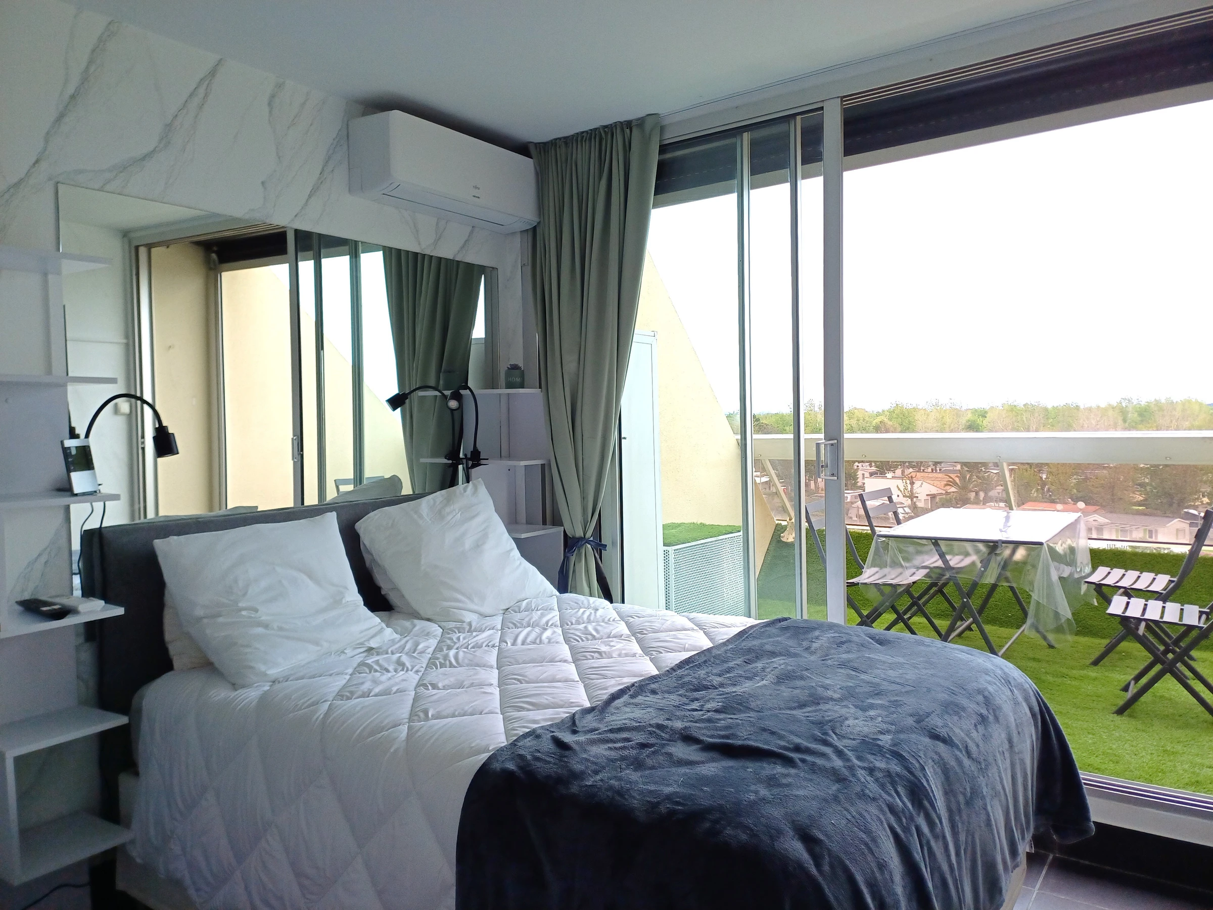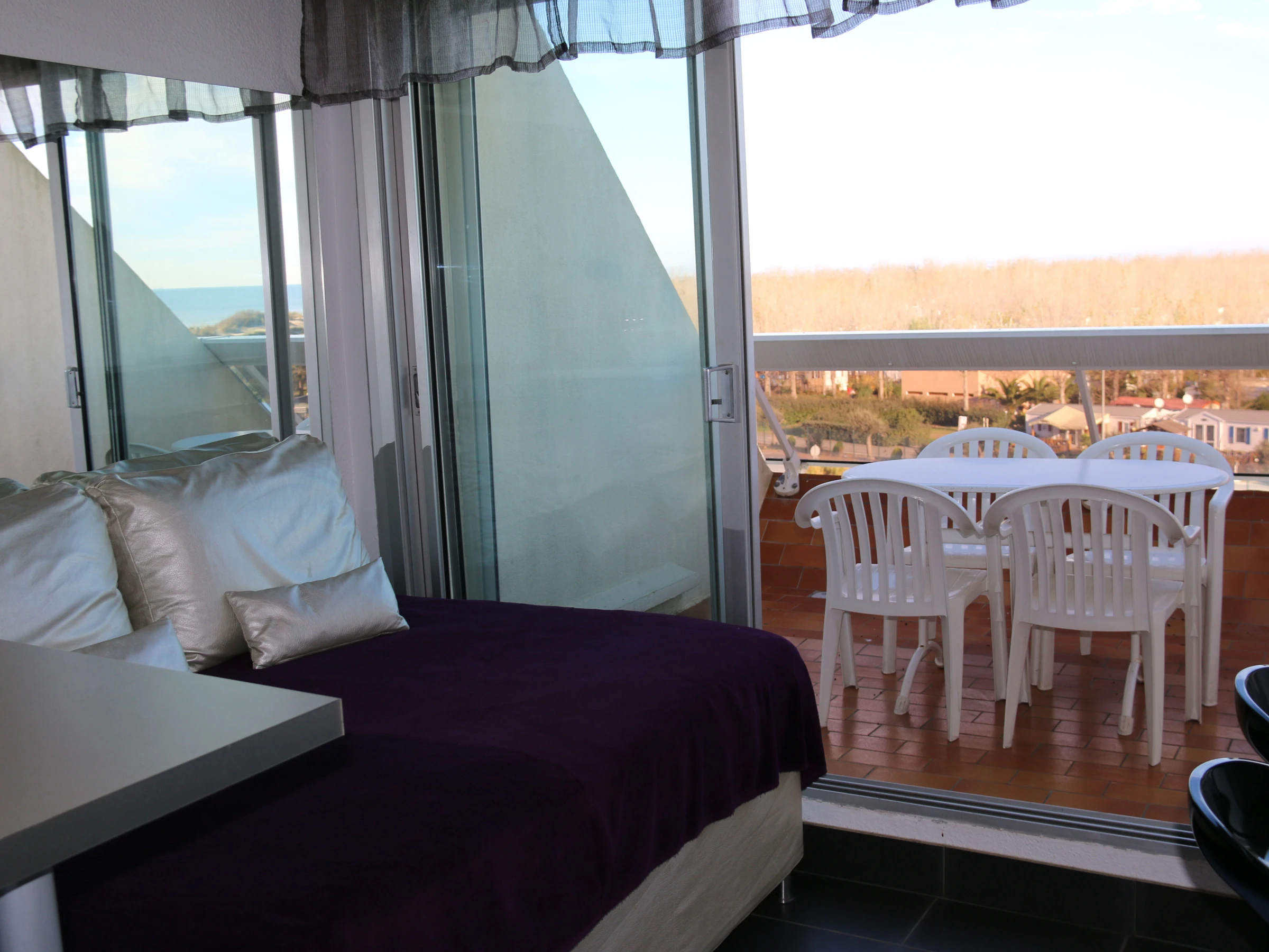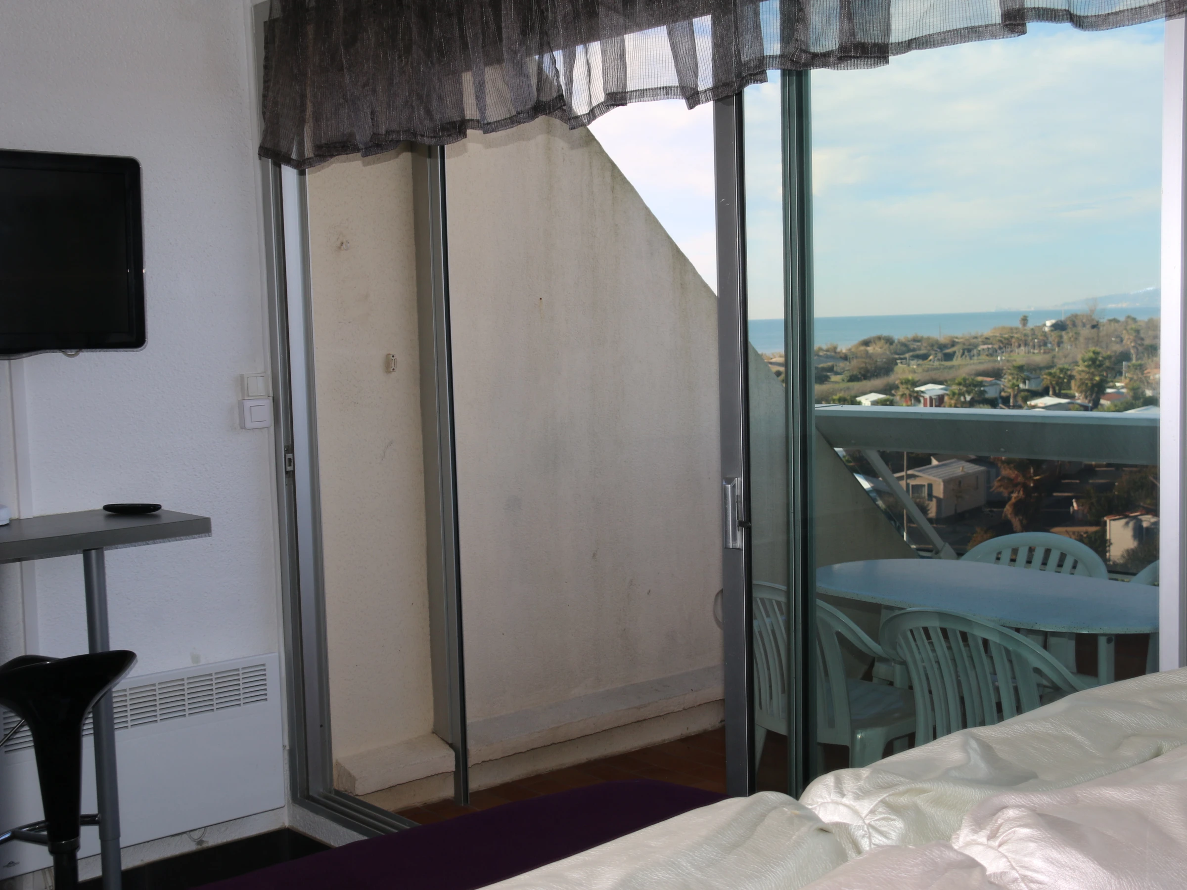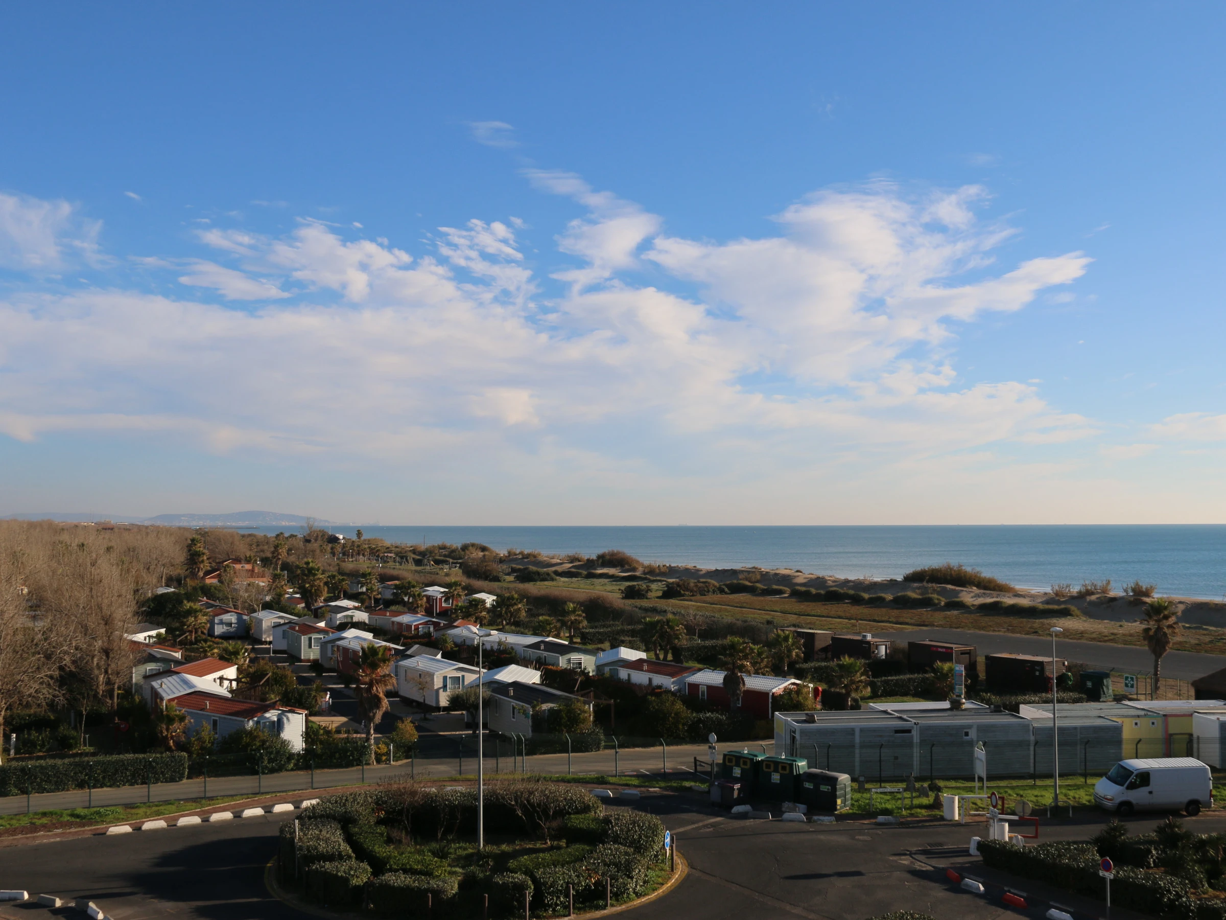 Nice, air conditioned studio for 2 people, situated at Heliopolis entrance L. 4th floor with lift. Living room with 140cm bed with storage base. Kitchen area with microwave, coffee machine, kettle... Bathroom with WC. East facing terrace, view of camping site and sea. Parking n°294.