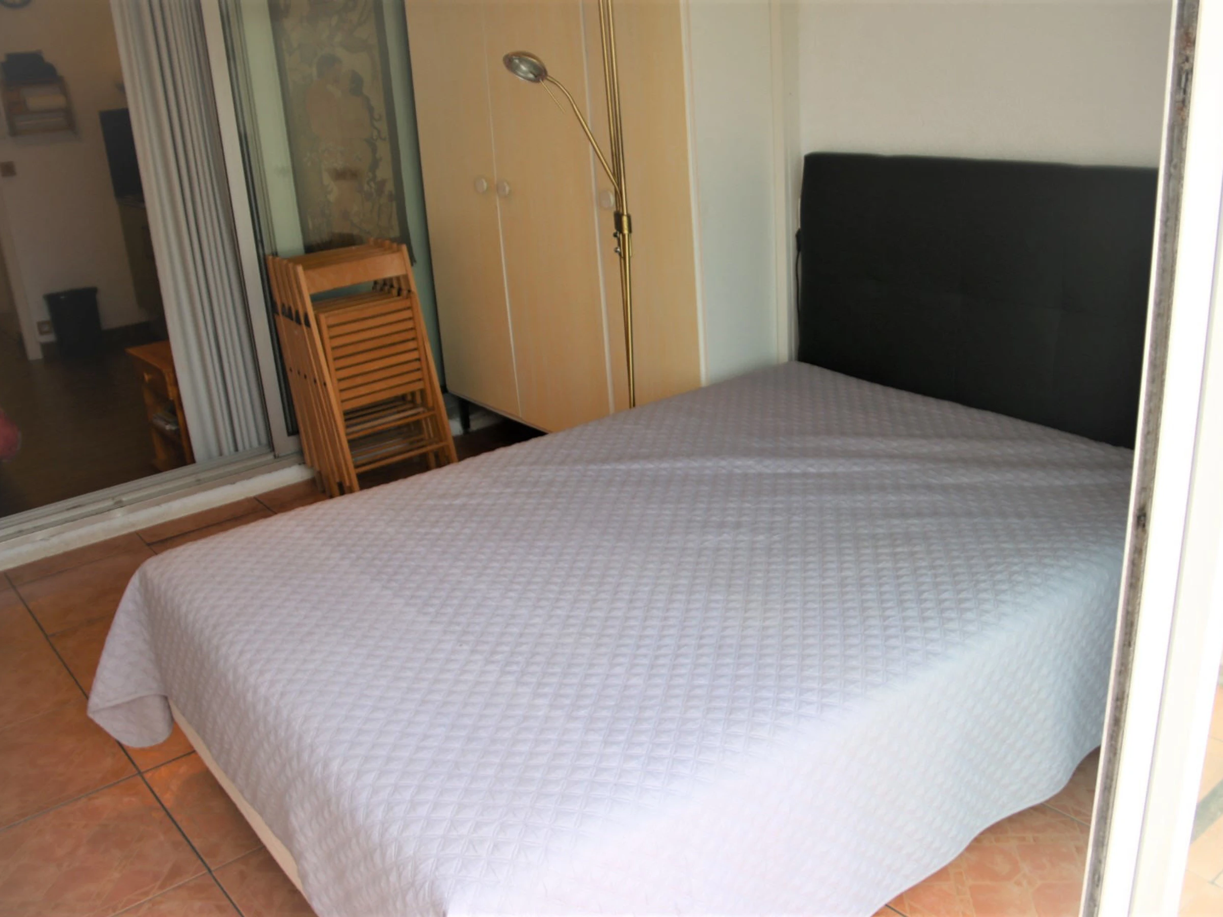 Air conditioned studio for 2 people, situated at Heliopolis, Entrance FGH. 1st floor without lift. Living room with in 140 cm bed. Kitchen area with big fridge, microwave, coffee machine.hoover.. TV. Bathoom with WC. Big terrace with shutters, interior view. parking n°26.