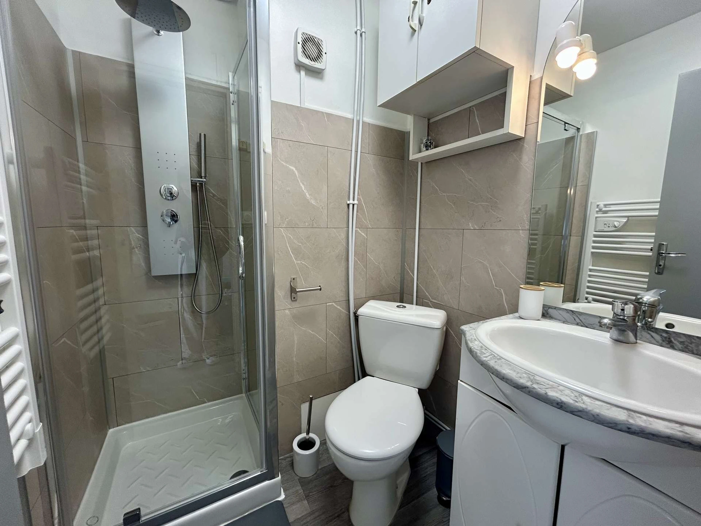 This apartment rental, located on the 1st floor (no elevator), features a living room with a pull-down double bed (140 cm), a fully equipped kitchen with a washing machine, and a shower room with toilet.