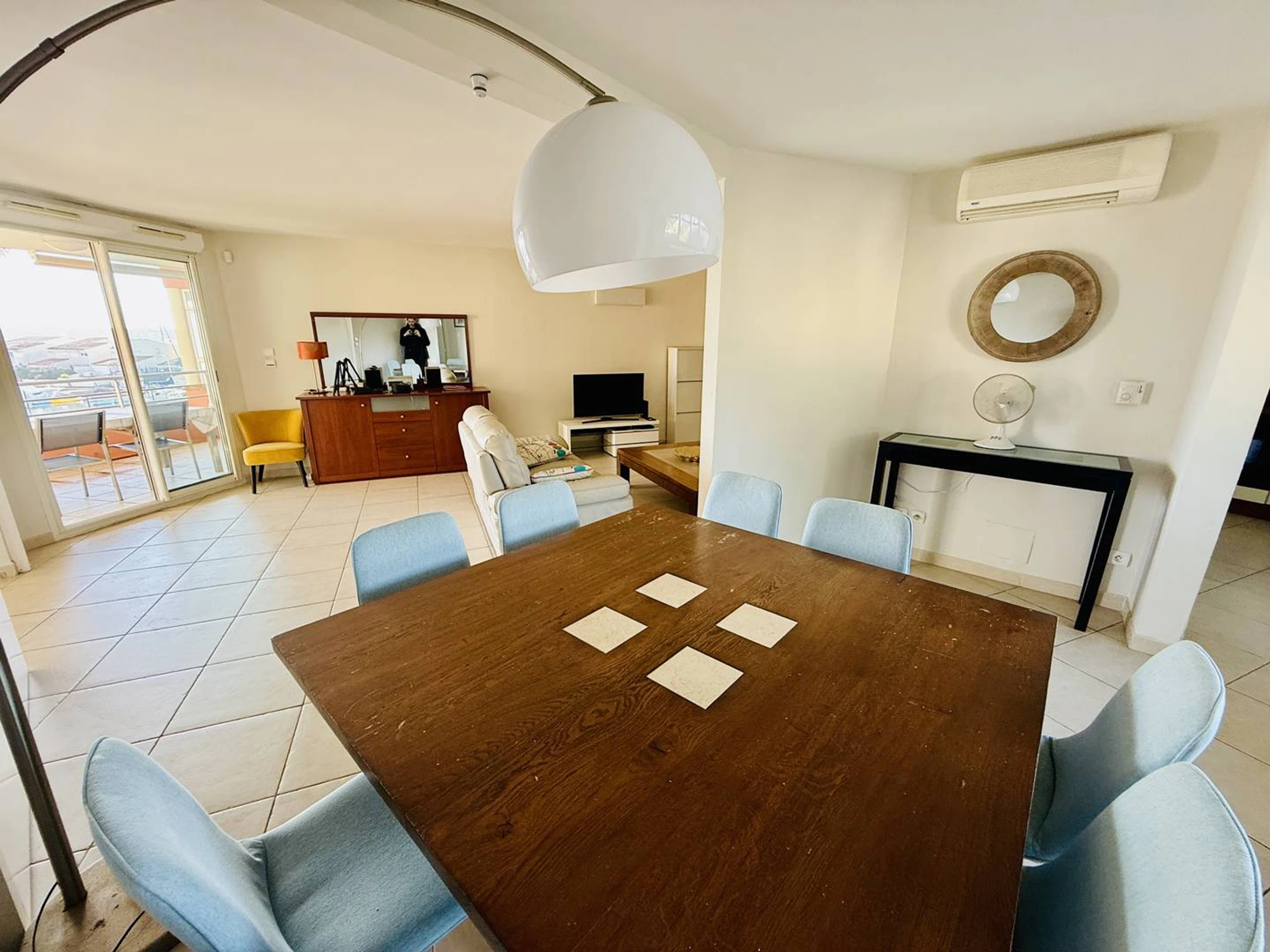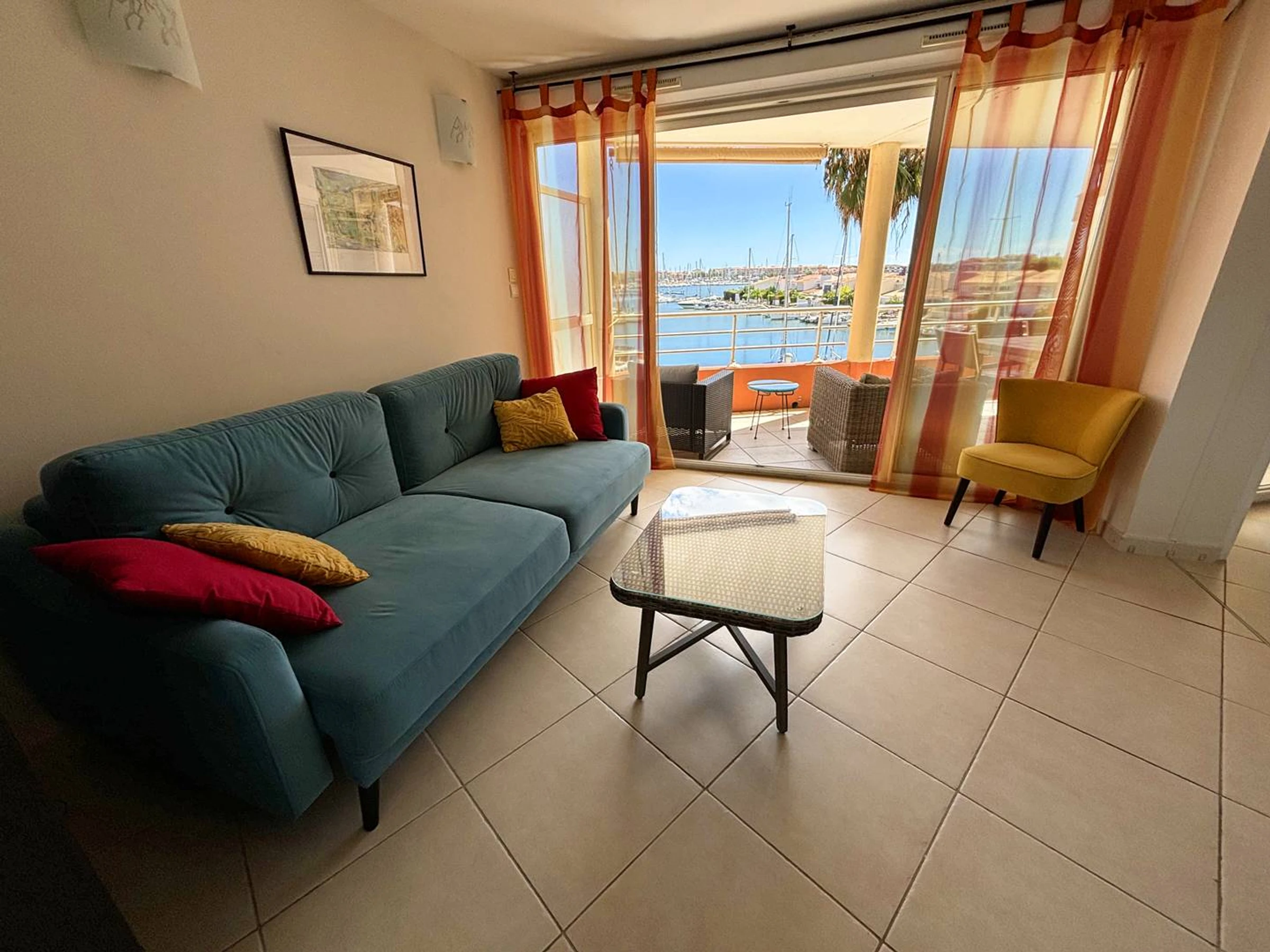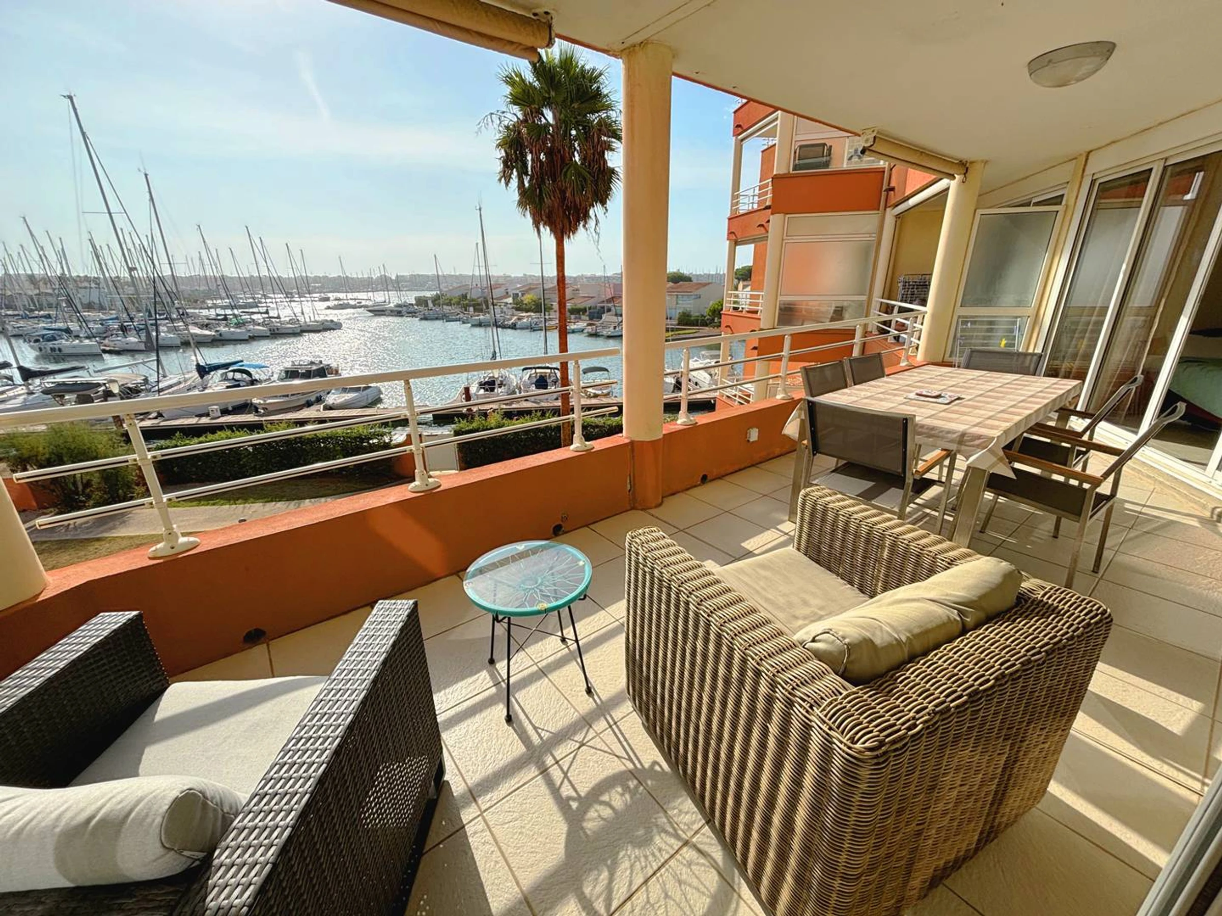 * Large living/dining room opening onto the sunny terrace with a view of the Cap d'Agde Marina.