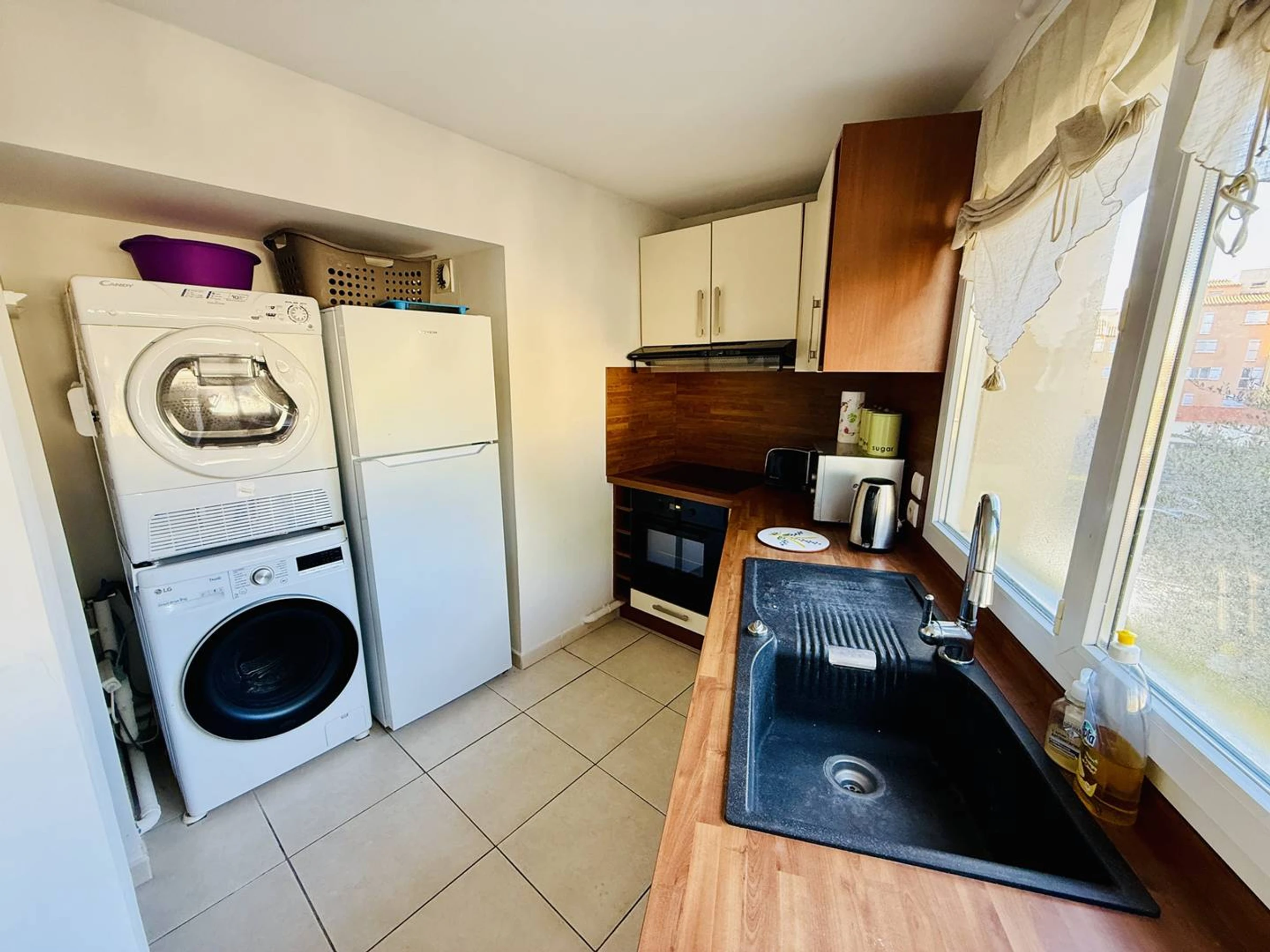 * Fully equipped kitchen with fridge/freezer, dishwasher, washing machine, dryer, oven, and extractor hood.