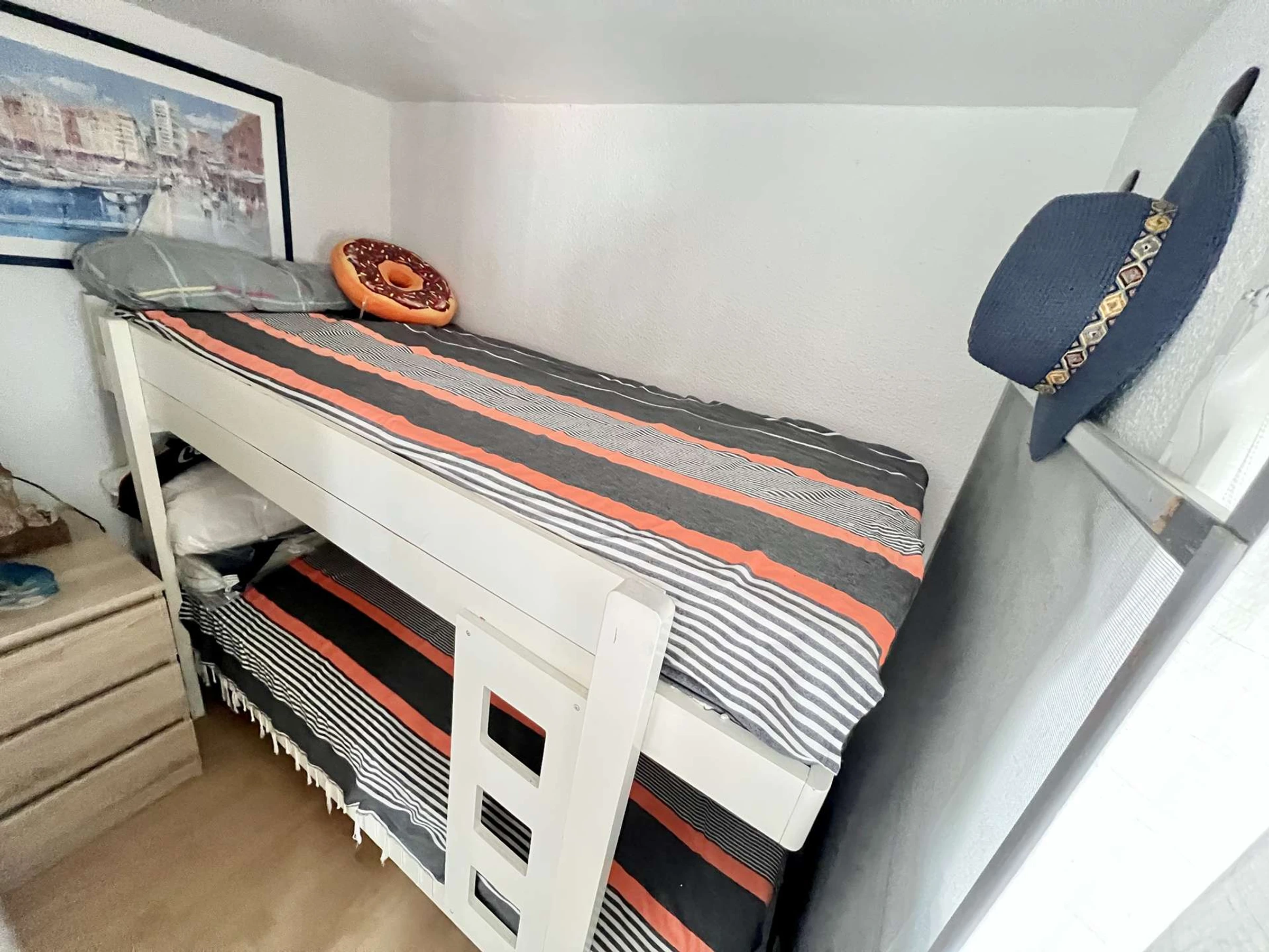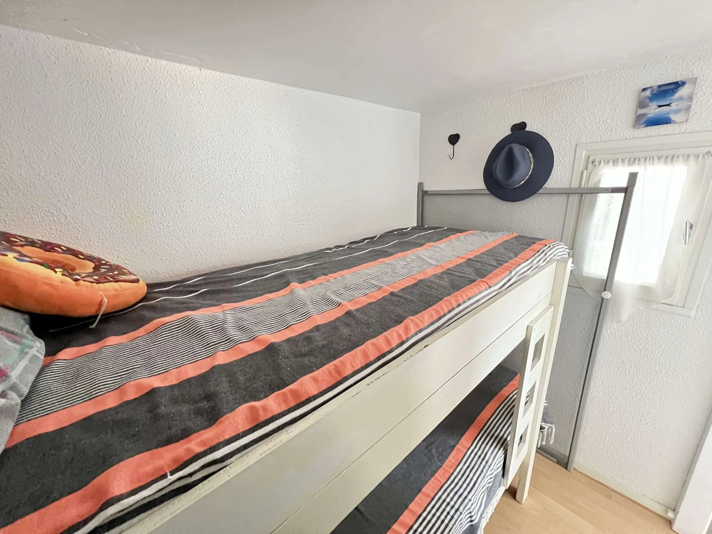 Entrance, bathroom (shower and sink), separate WC, equipped kitchenette (cooktop, refrigerator-freezer, microwave, etc.), living room (one 140cm sofa bed, TV), sleeping alcove (two 80cm bunk beds - children's bedding only), loggia