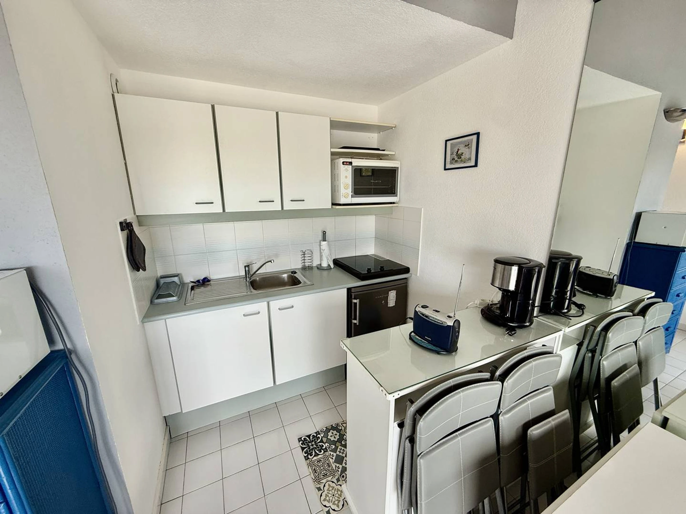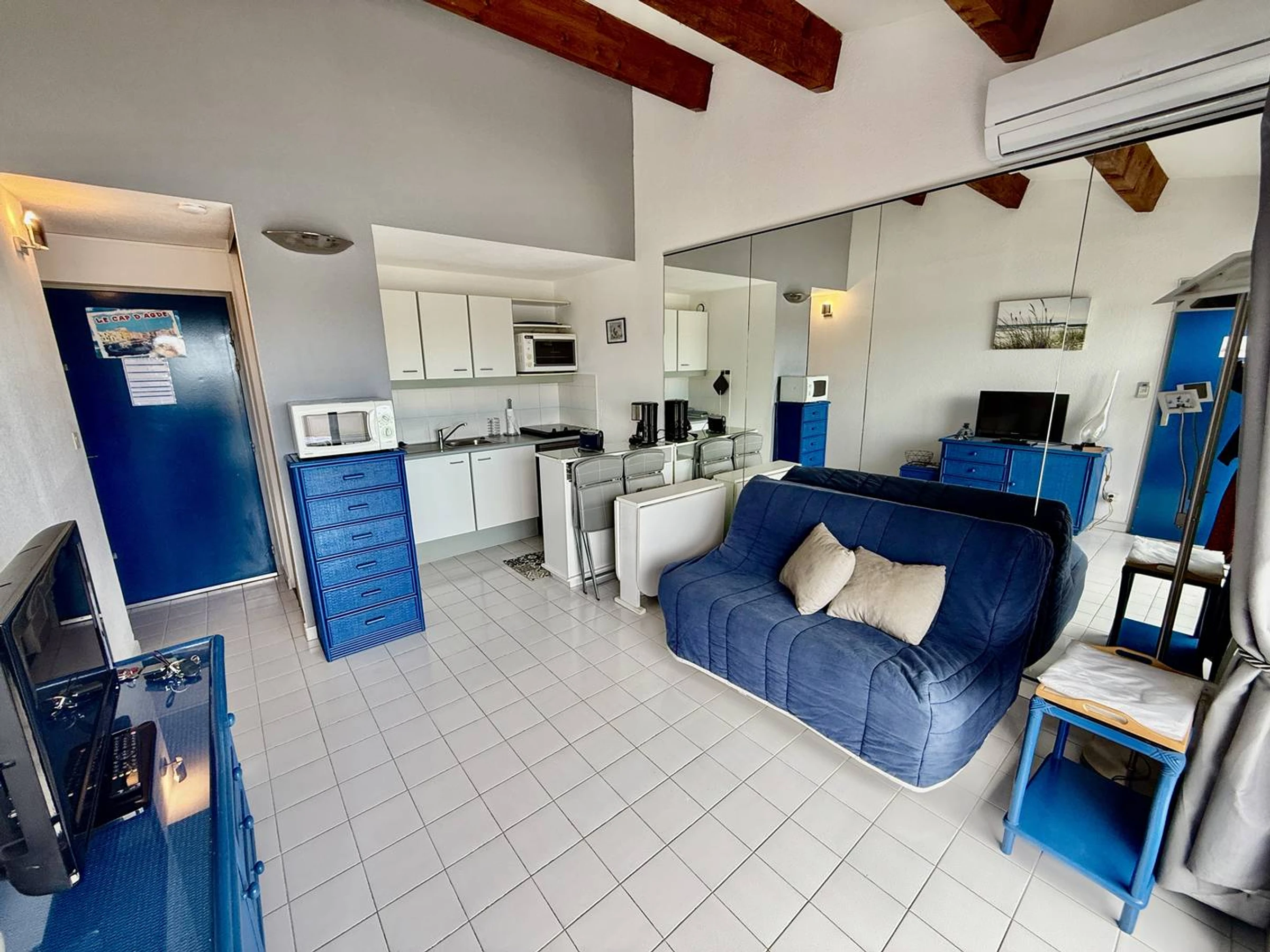 This pleasant air-conditioned apartment is located in the Amouréva residence, a stone's throw from the Richelieu beach, reputed to be the most beautiful beach in the resort. Its upstairs location allows it to have a lovely unobstructed view of the channel and the sea. It includes a living room with a sofa bed, a fully equipped kitchen area (refrigerator, hotplates, microwave, oven, coffee maker, , toaster), a bathroom, a separate toilet and a bedroom with a double bed and a large closet. Its pleasant balcony allows you to take meals outside or relax with a magnificent view of the sea. For more comfort there is a private parking space. Its privileged location (close to the beach, shops, Ile des loisirs), its layout, the swimming pool in the residence make this property an ideal rental for spending a great holiday with children under the sun of Cap d' Agde. For information, the facelift was done in the spring, so the residence is very beautiful to welcome holidaymakers!!!
