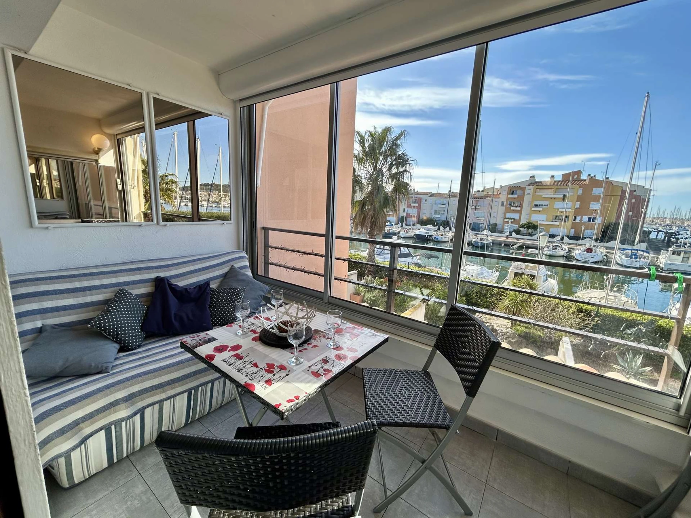 Loggia fermée par baie vitrée équipée d'un store, très jolie vue sur le chenal.