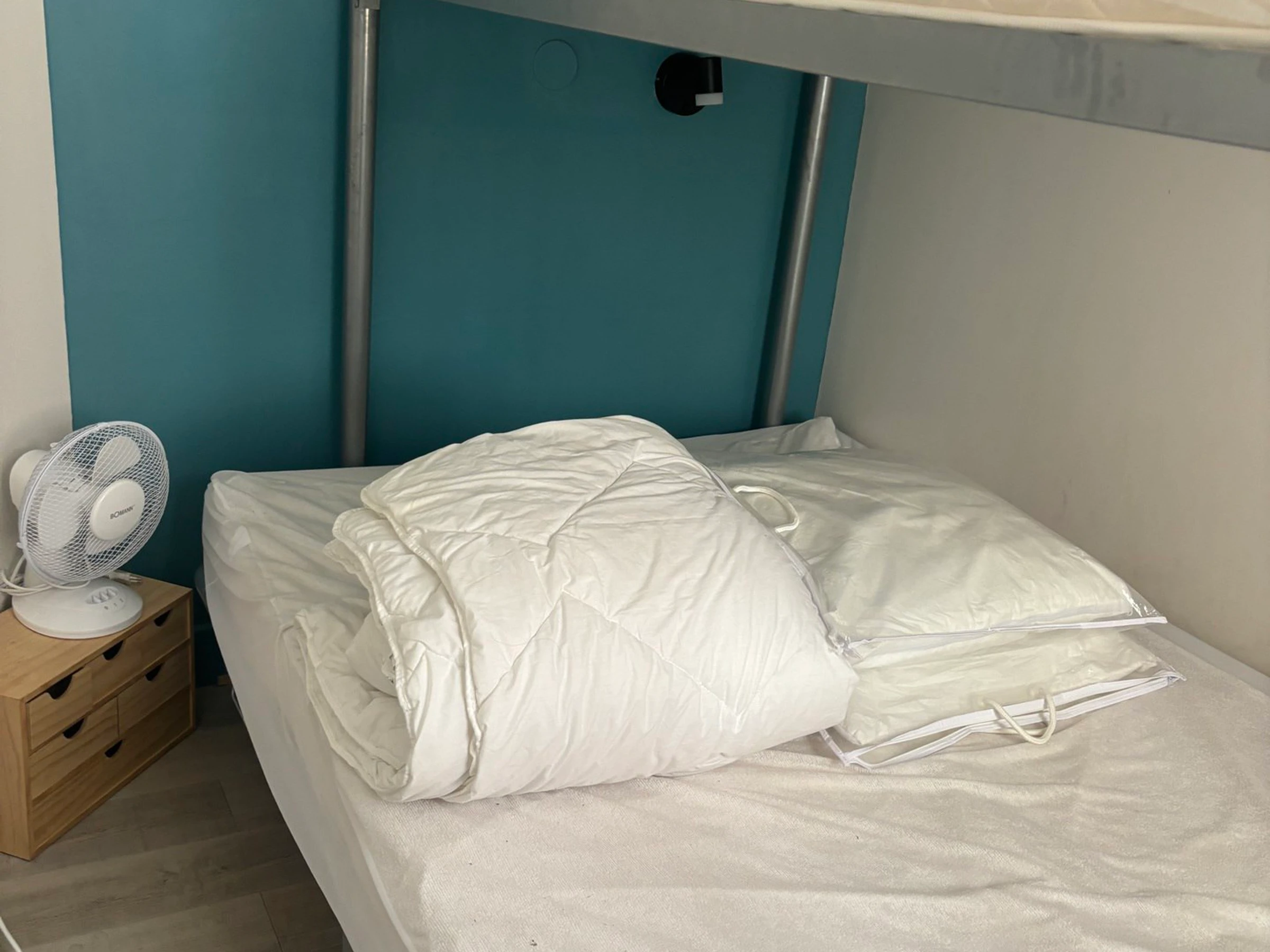 Bedroom 1: double bed (140cm) with bunk beds (90cm).