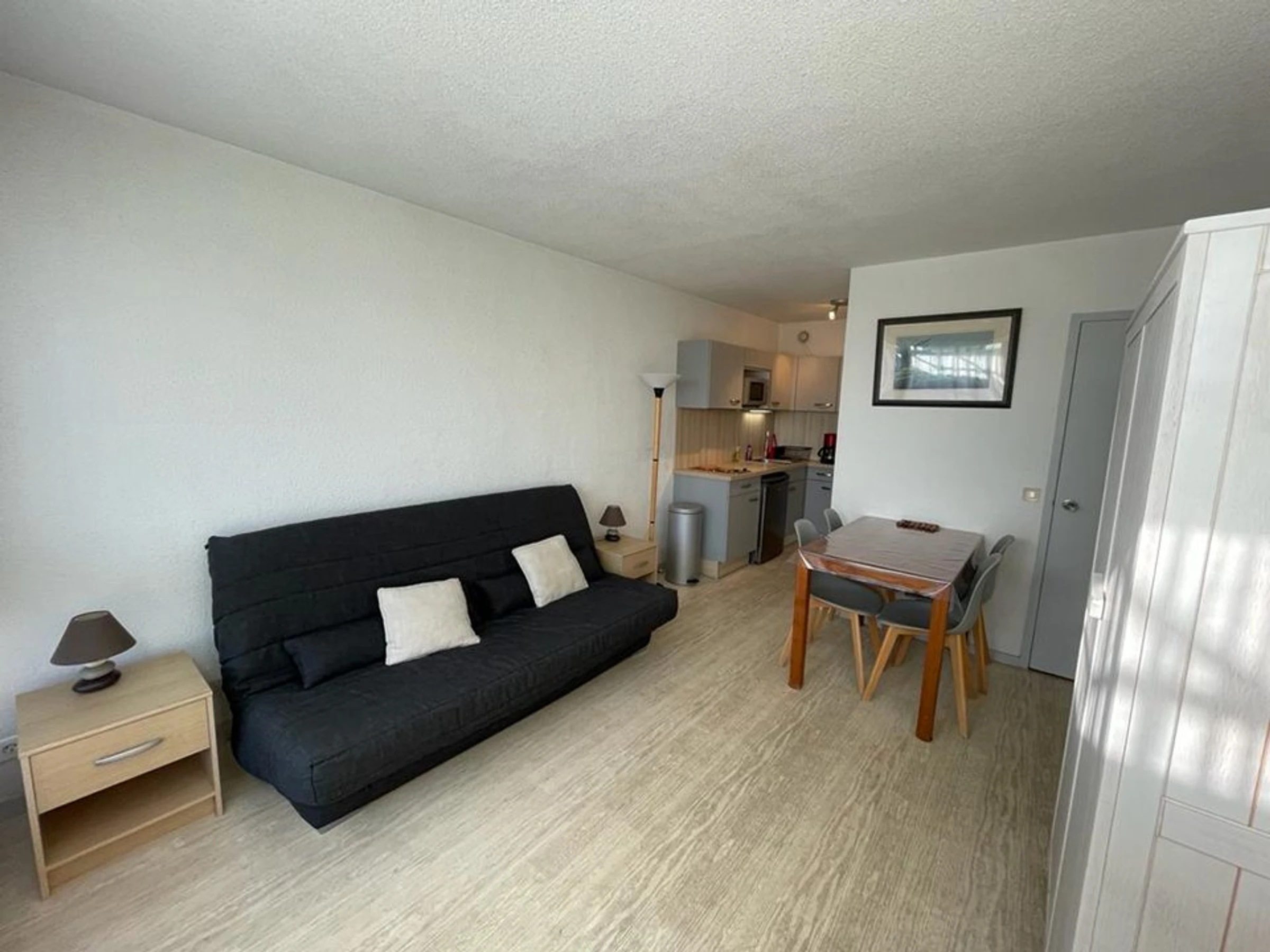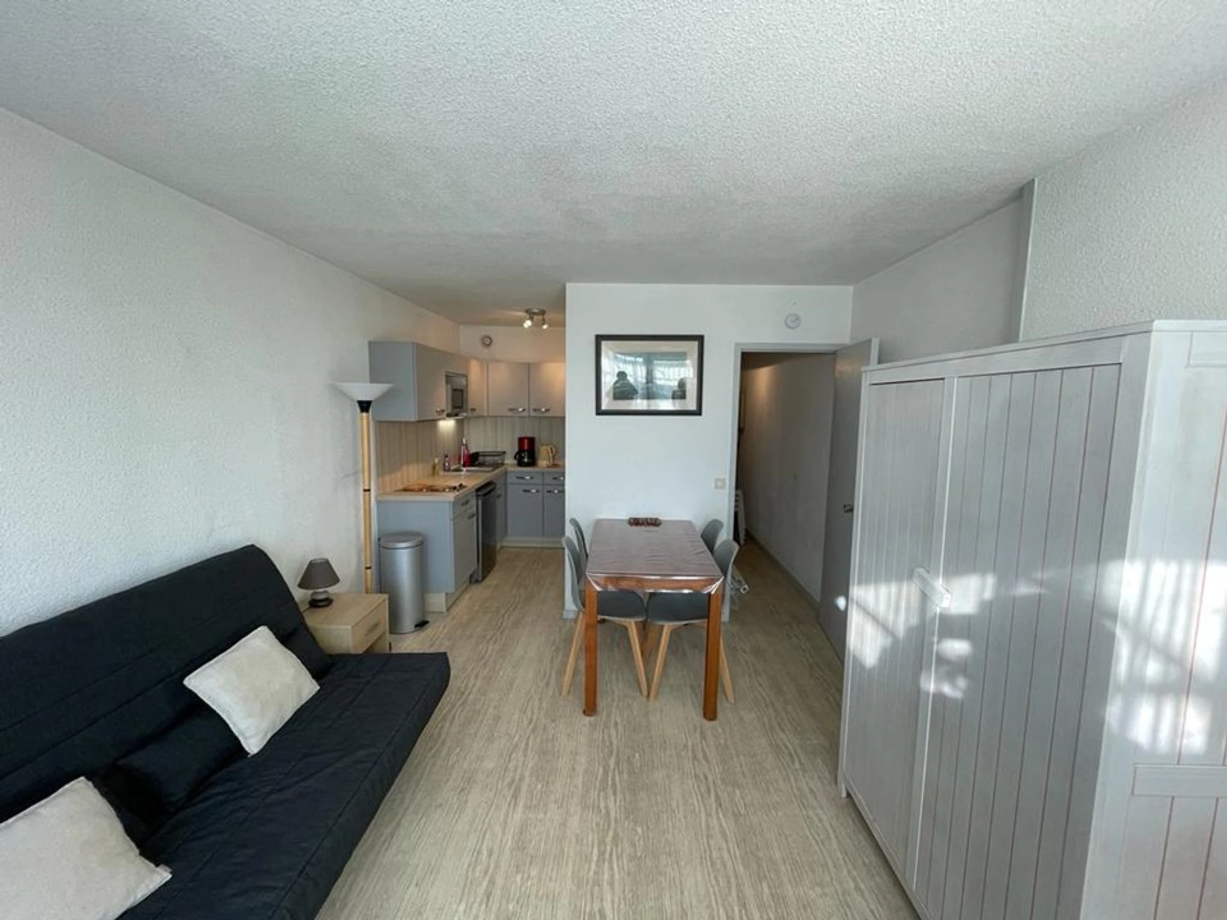 - A small kitchen open to the living room and equipped with a microwave, refrigerator, ceramic hob, and filter coffee maker