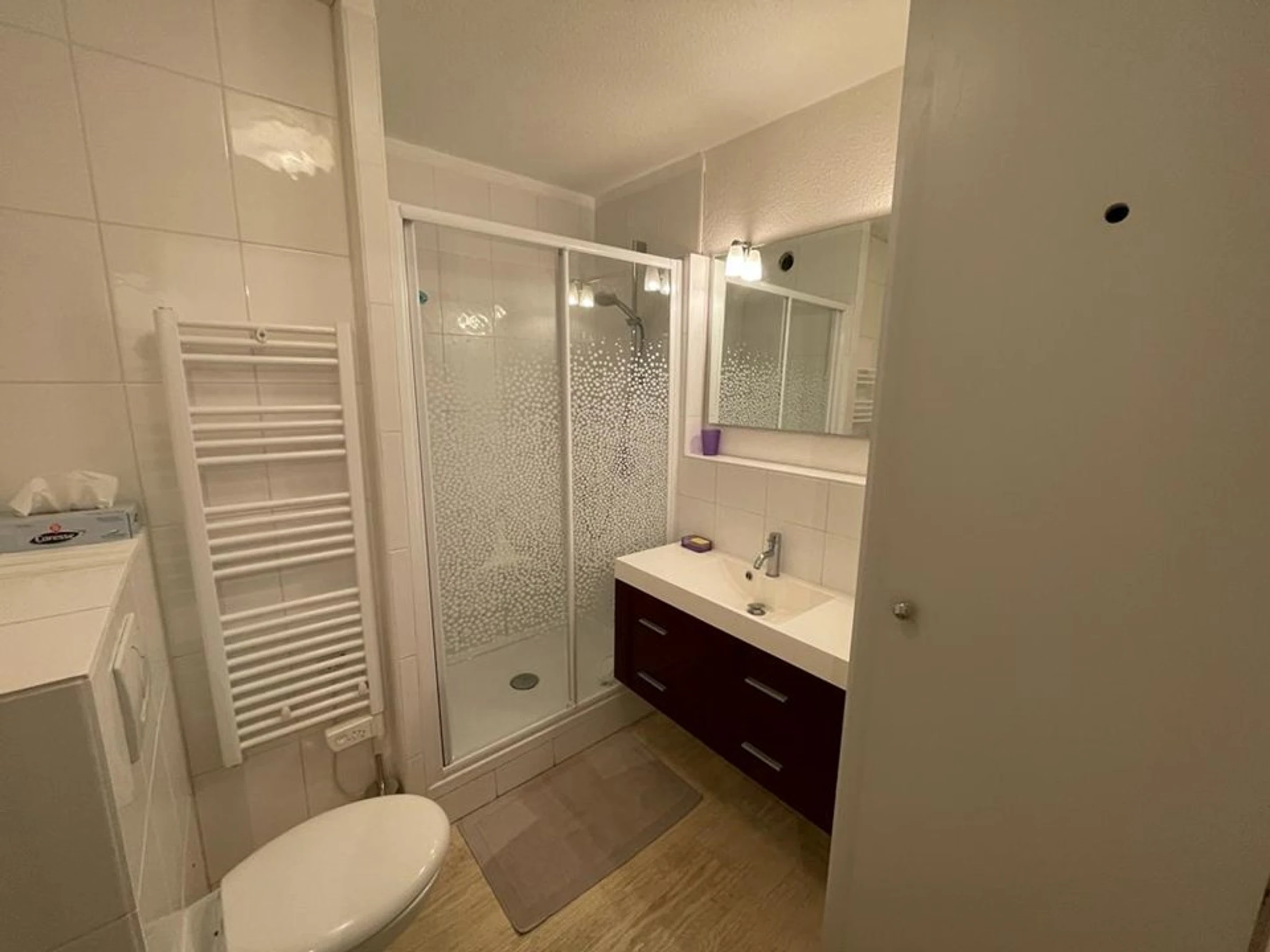 - A renovated bathroom with an integrated toilet.