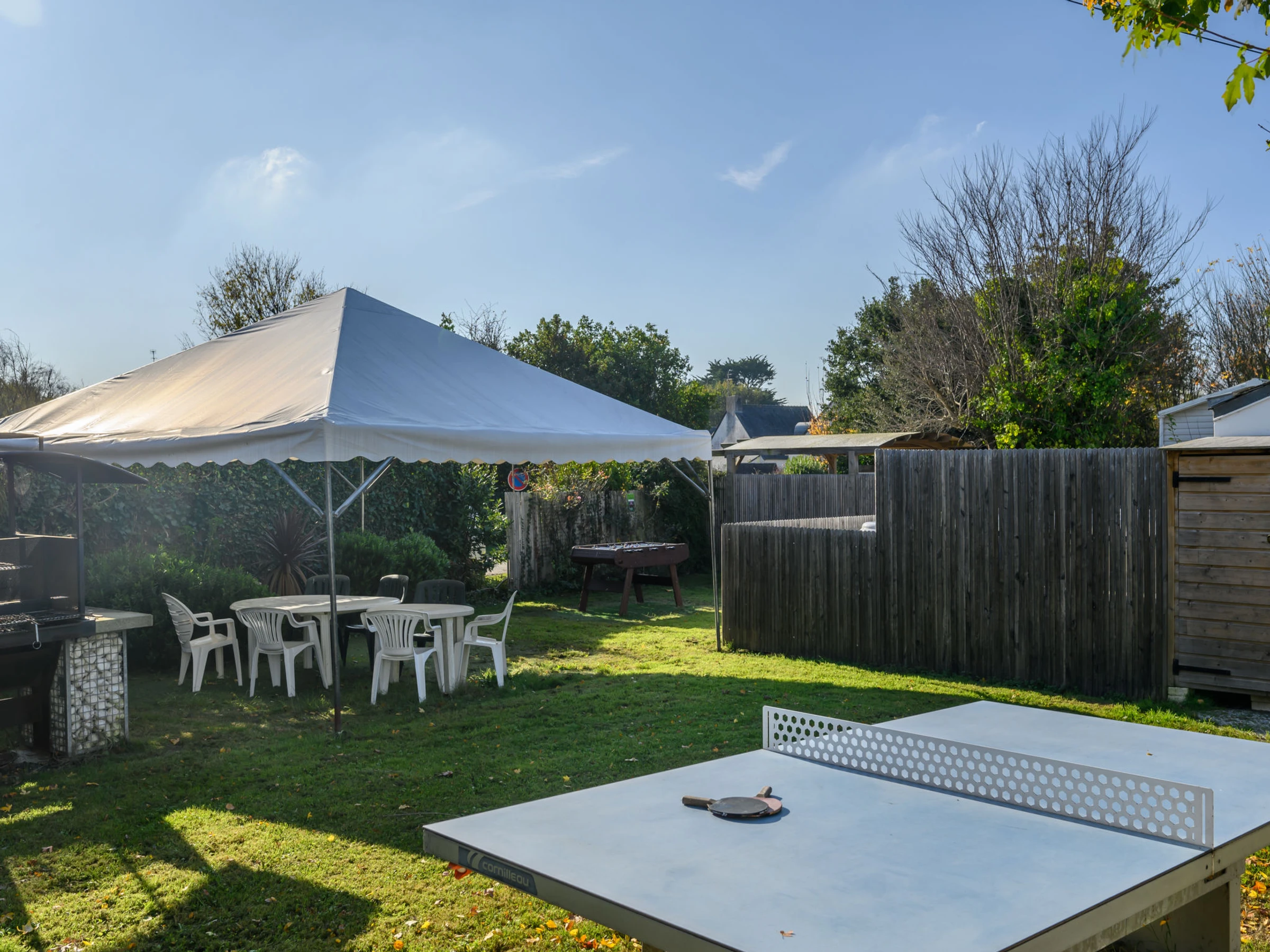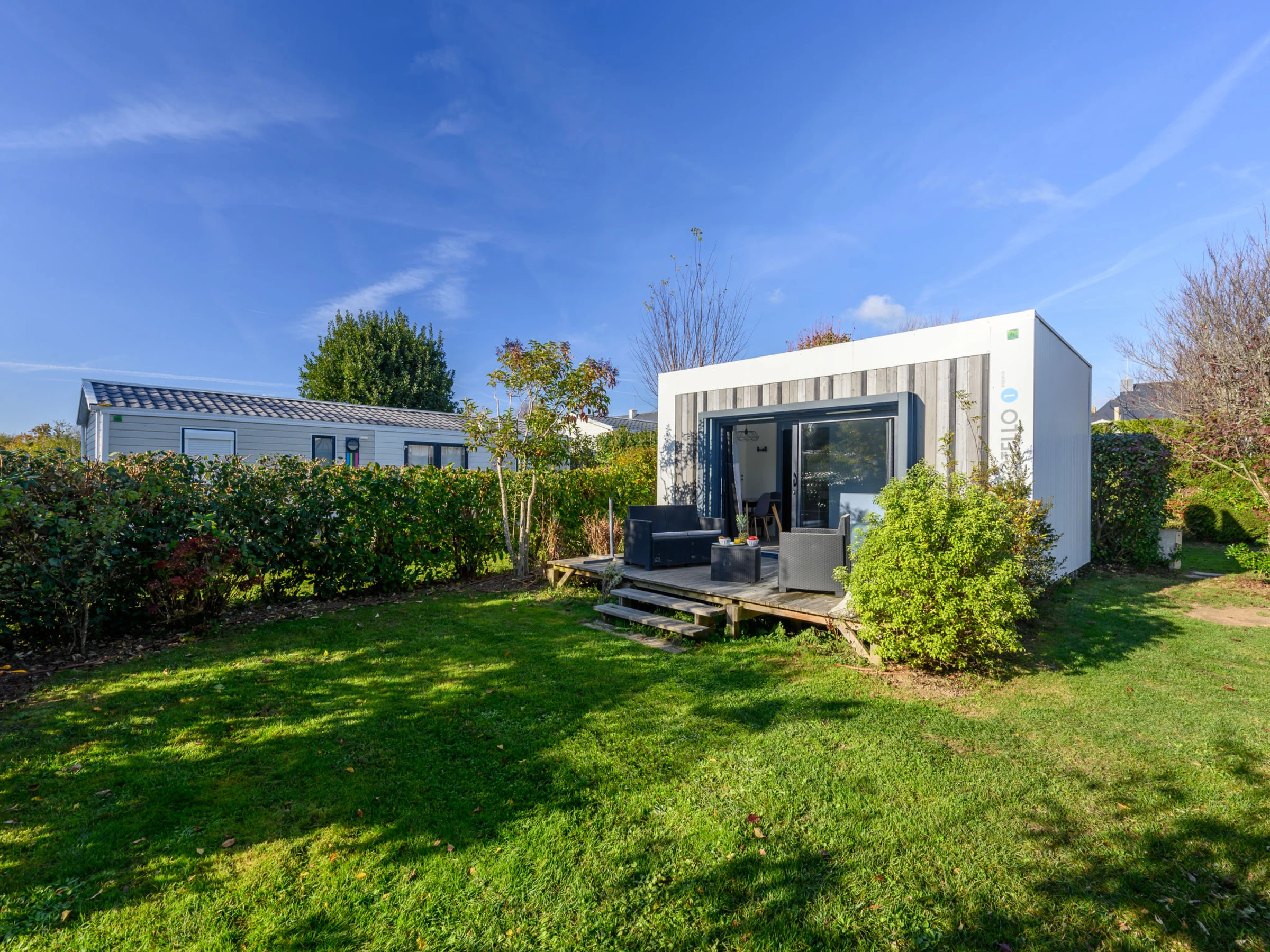 Camping Les Salines: Resort. 30 houses in the resort. In the resort 500 m from the centre of Carnac, 1.5 km from the sea, 1.5 km from the beach. For shared use: hot tub, barbecue. In the house: WiFi, washing machine (extra). Grocery, supermarket 20 m, restaurant, bar 400 m, bakery 500 m, café 100 m, bus stop 600 m, sandy beach "Grande Plage de Carnac" 1.5 km, thermal baths "Thalazur Carnac" 1.2 km. Golf course (18 hole) 15 km, surf school 3.5 km, sailing school 1.5 km, tennis 2.9 km. Nearby attractions: Les Alignements de Carnac 1 km, Le Port de la Trinité-sur-mer 5 km, Auray & Saint-Goustan 19 km, Les remparts de Vannes 33 km, La Presqu'île de Quiberon 16 km, Lorient 49 km. Hiking paths: Golfe du Morbihan 20 km.